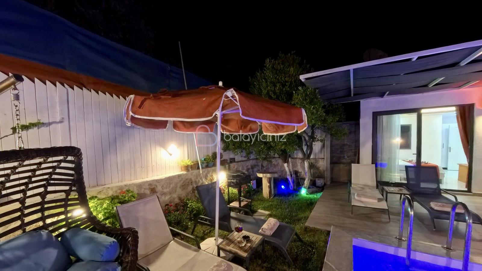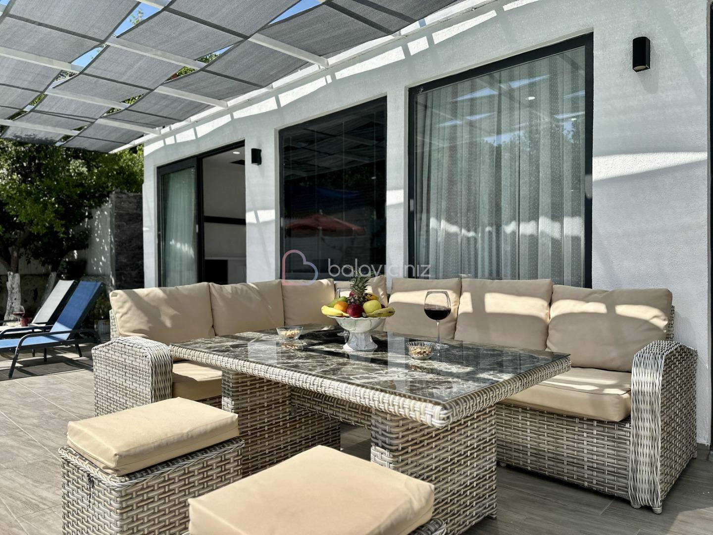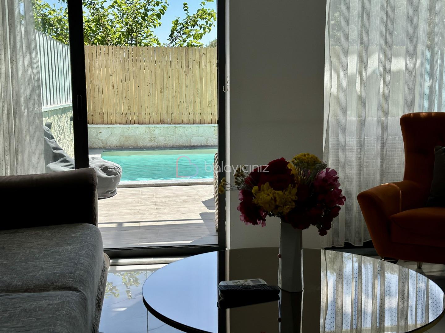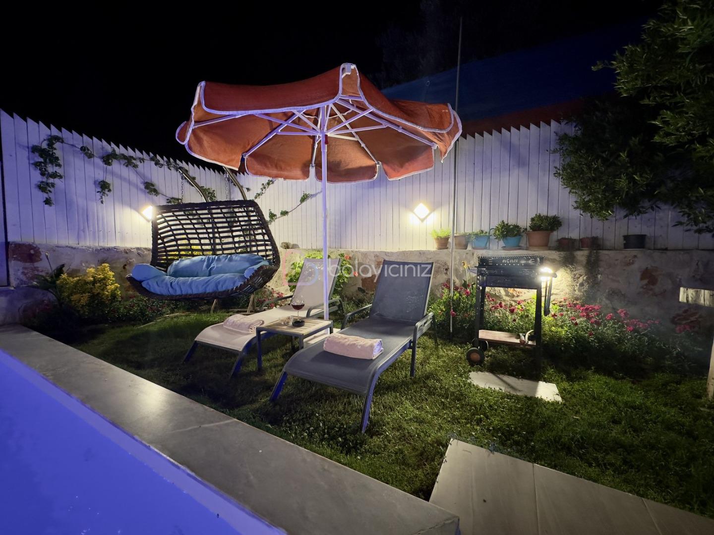 Özel yüzme Havuzu korunaklı olup dışarıdan gözükmemektedir. Bahçe içerisinde şezlonglar, güneş şemsiyeleri, masa ve sandalyeler, barbekü, salıncak, çardak ve oturama alanı bulunmaktadır.