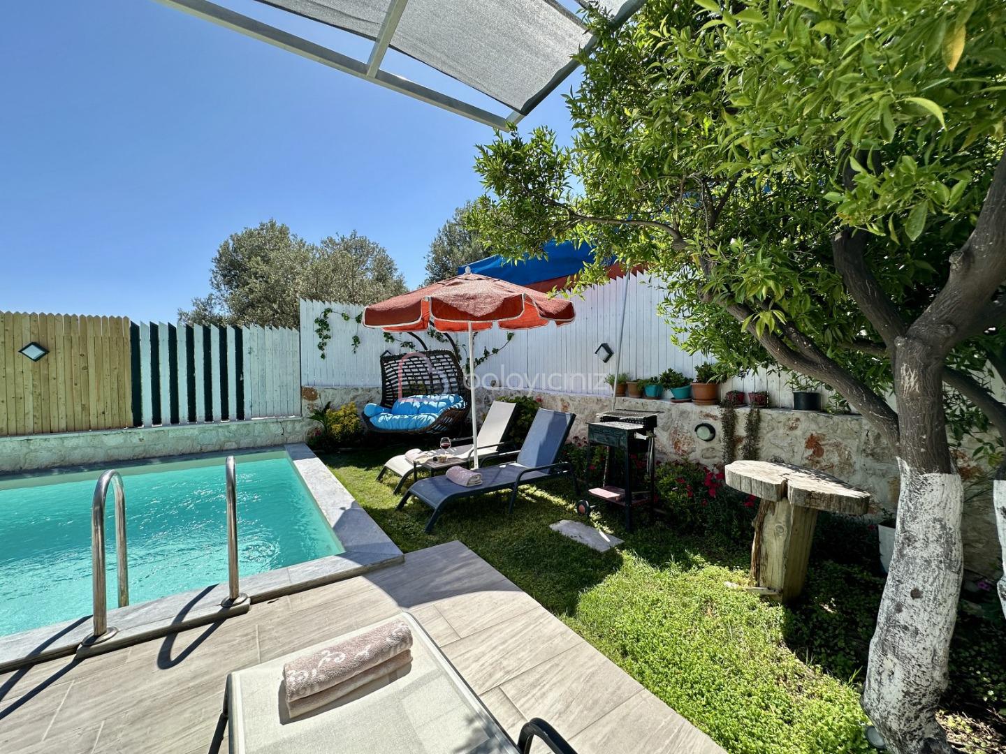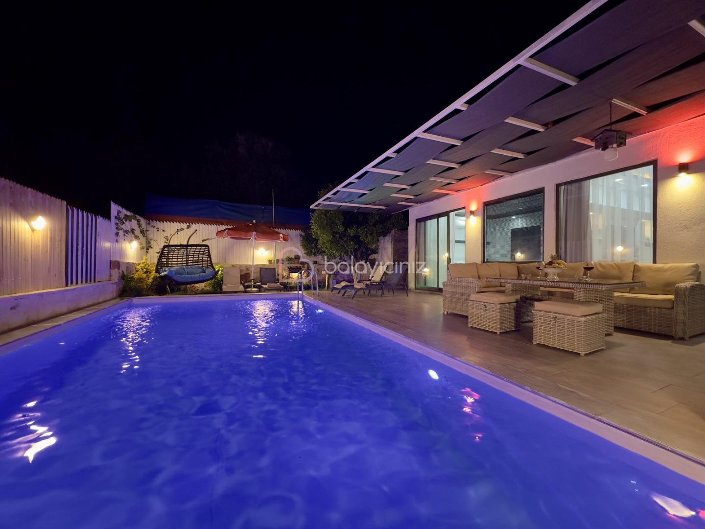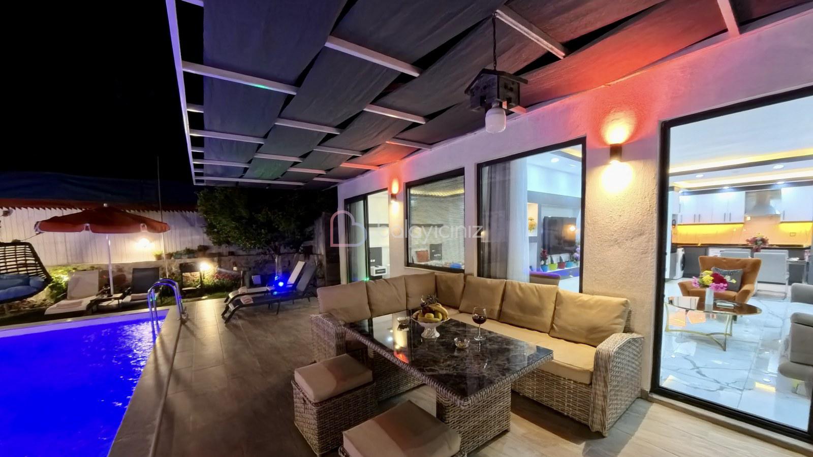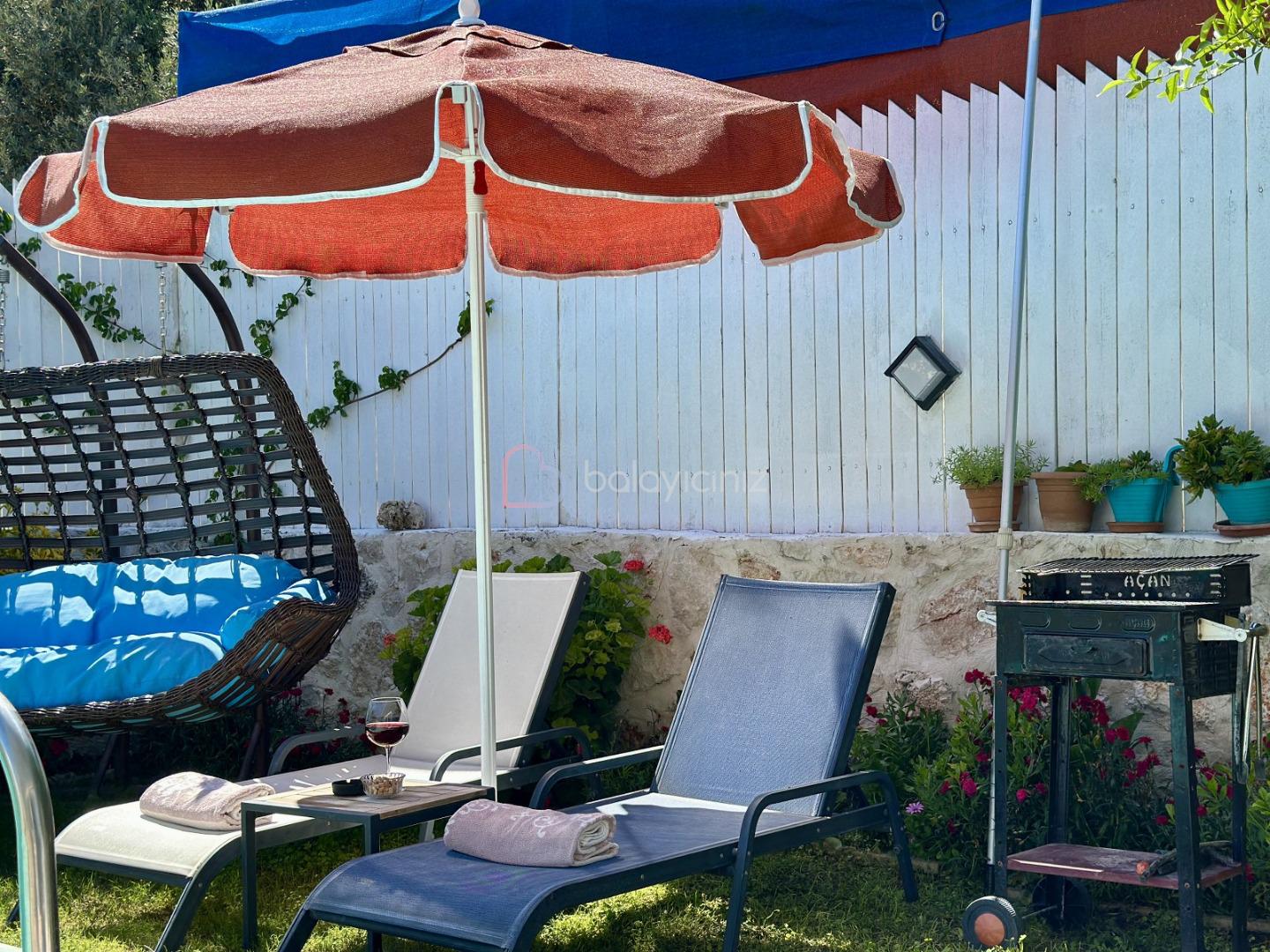 Özel yüzme Havuzu korunaklı olup dışarıdan gözükmemektedir. Bahçe içerisinde şezlonglar, güneş şemsiyeleri, masa ve sandalyeler, barbekü, salıncak, çardak ve oturama alanı bulunmaktadır.