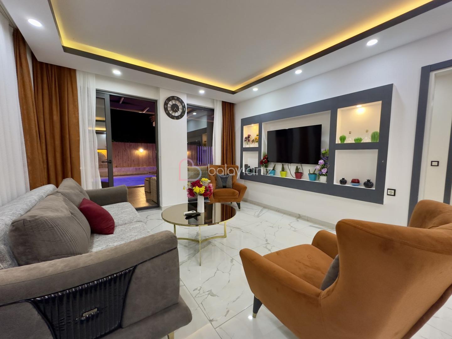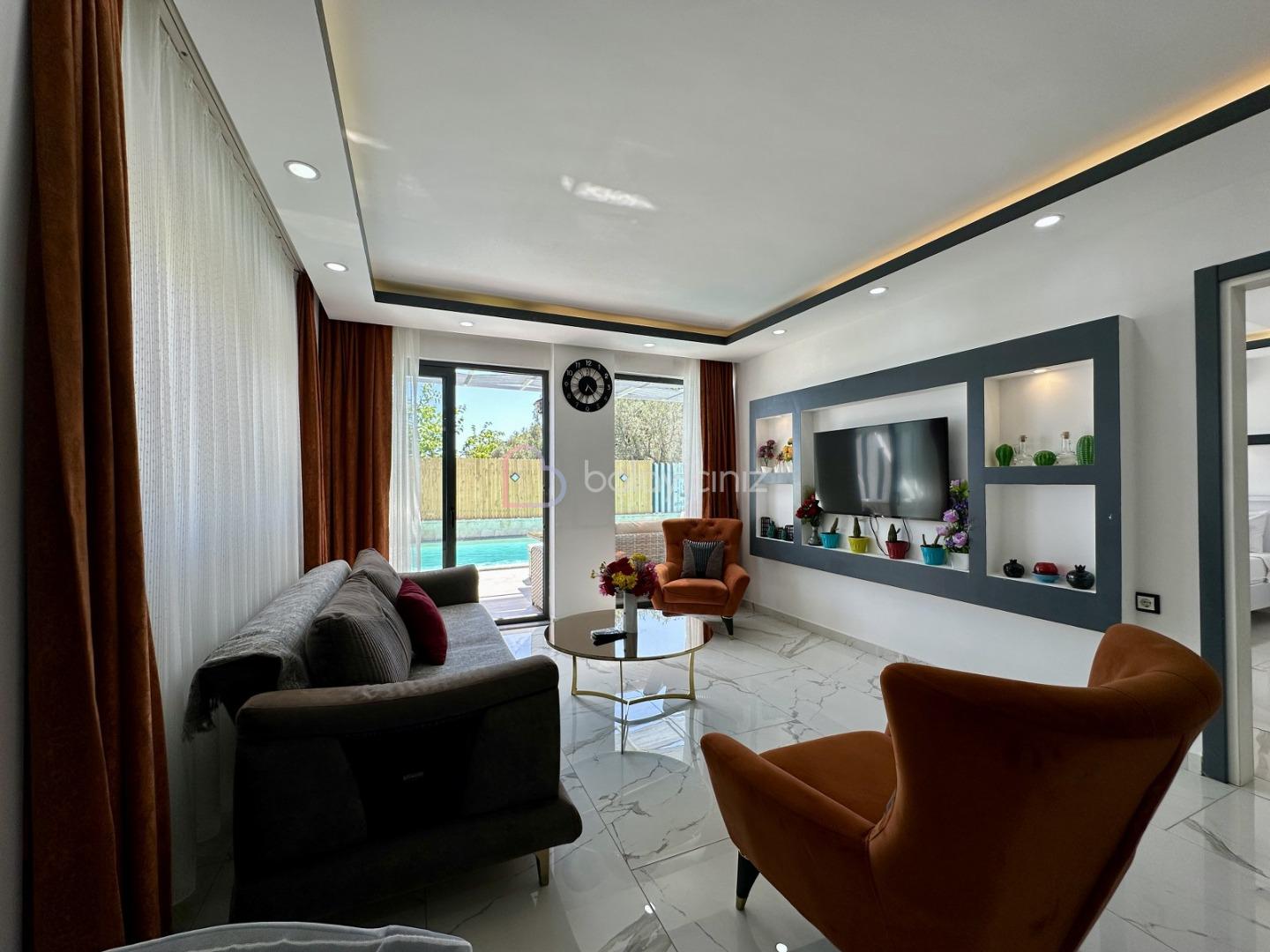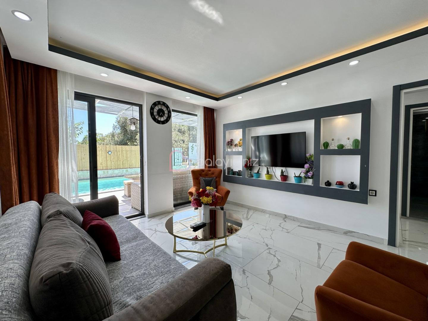 Salonumuzda oturma grubu, klima, televizyon, sehpa, uydu alıcı, internet, bulunmaktadır. Salon doğa manzaralıdır. Havuz terasına çıkış yapılabilmektedir.