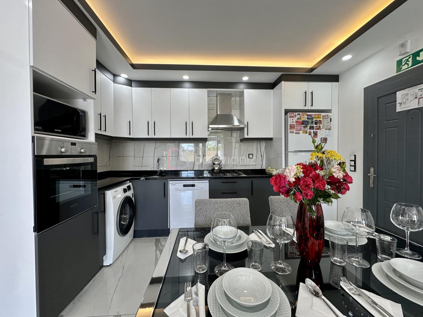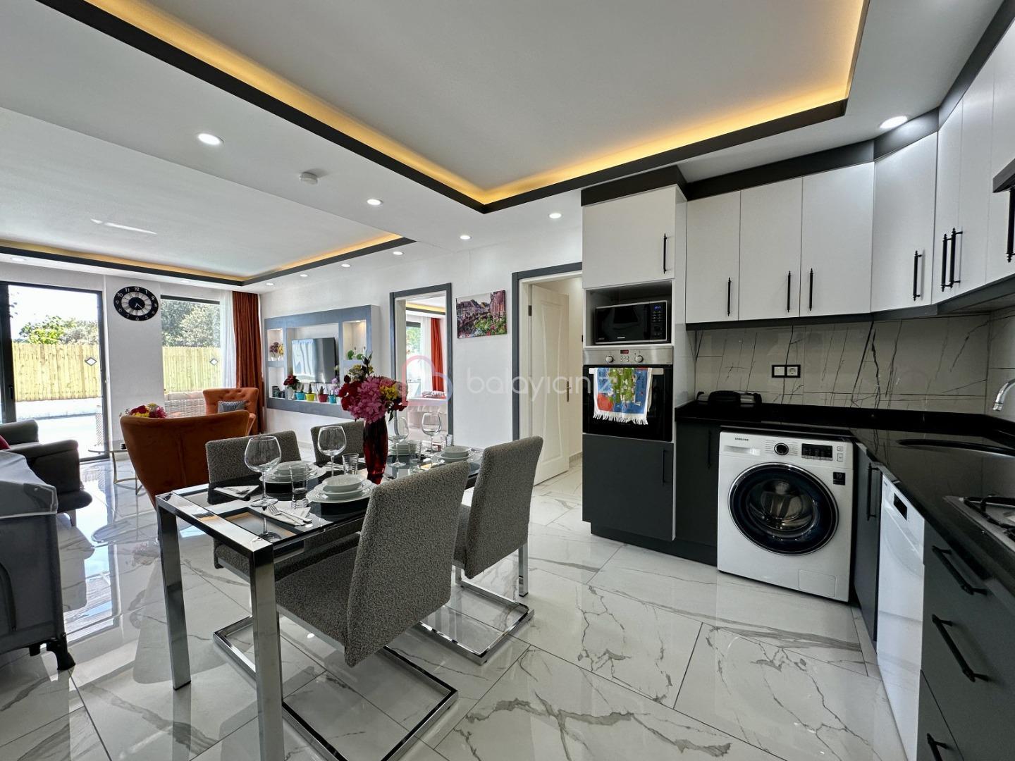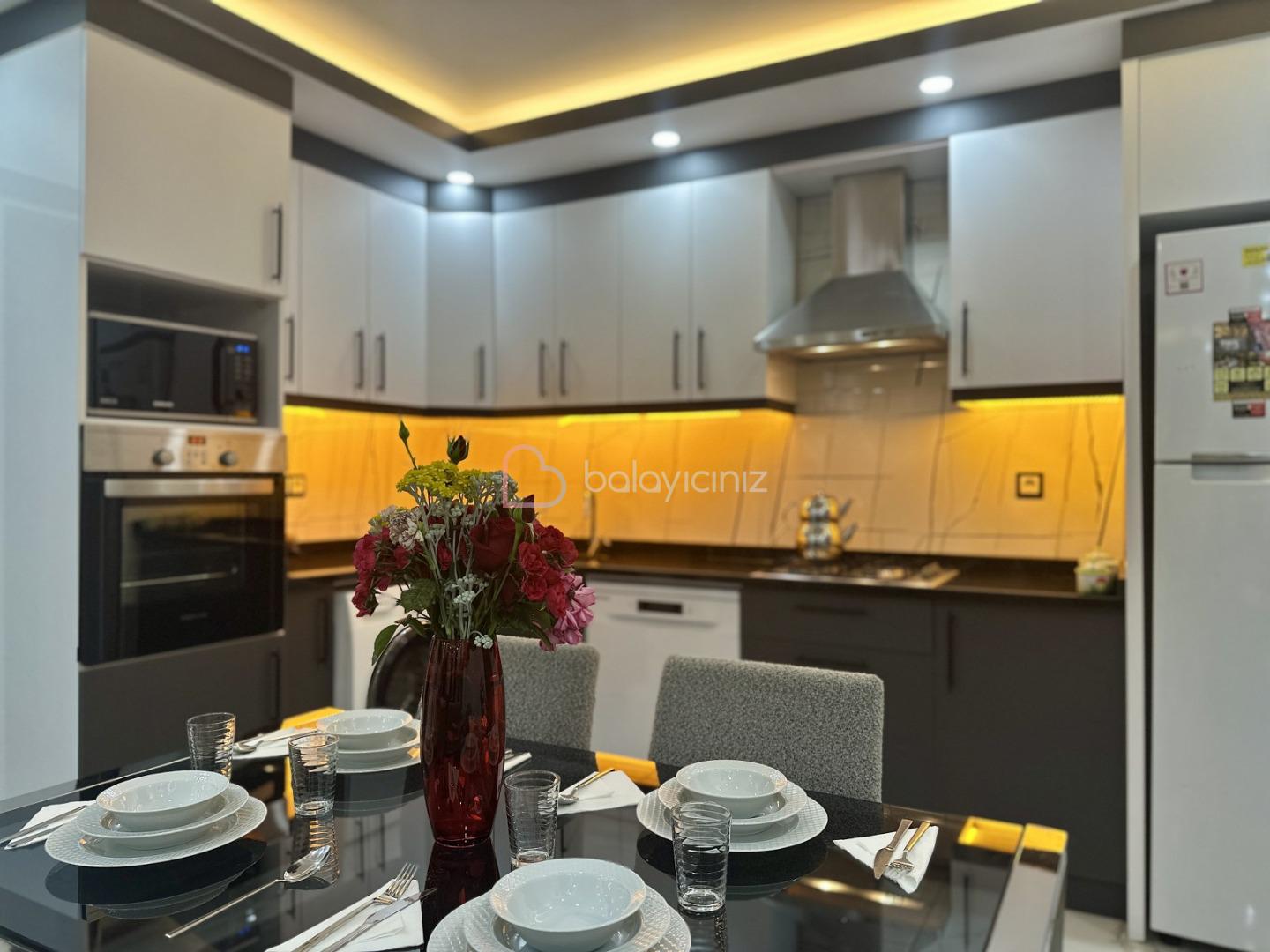 Modern Amerikan mutfakta buzdolabı, bulaşık makinesi, fırın, 4'lü ocak, fırın, elektrikli su ısıtıcısı (kettle), yemek masası, yemek takımları, çatal ve bıçak takımları, tencere ve tava takımları, bardaklar bulunmaktadır.
