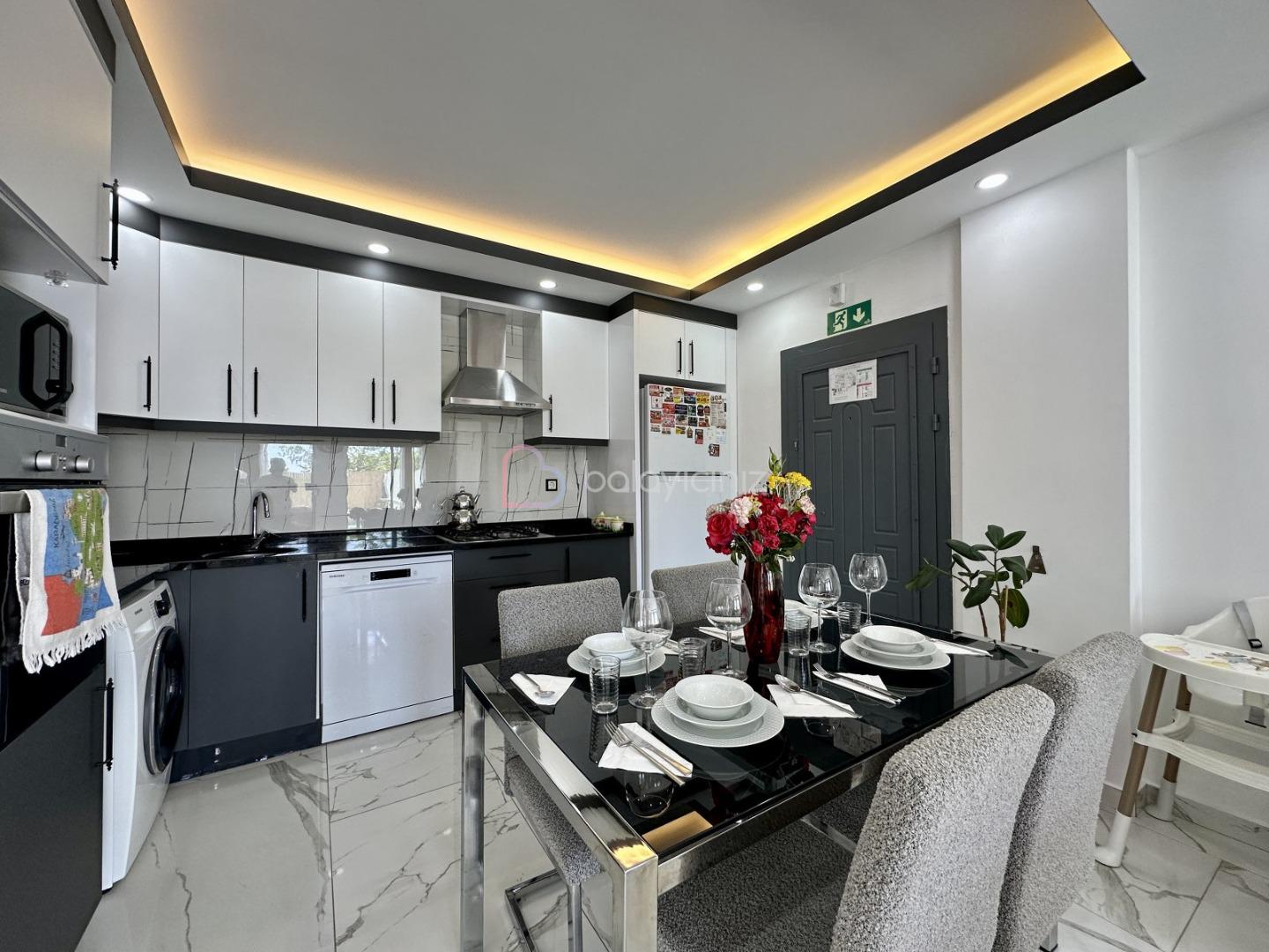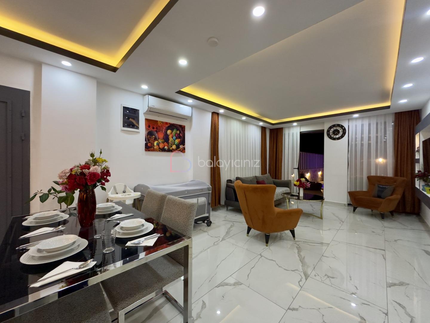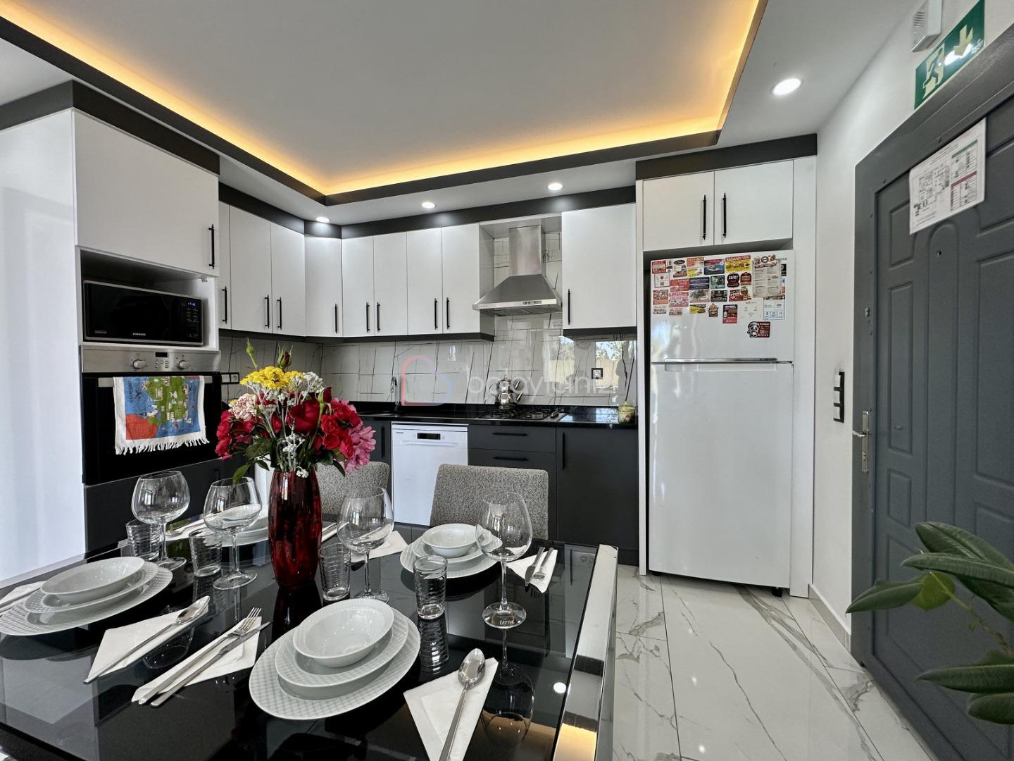 Modern Amerikan mutfakta buzdolabı, bulaşık makinesi, fırın, 4'lü ocak, fırın, elektrikli su ısıtıcısı (kettle), yemek masası, yemek takımları, çatal ve bıçak takımları, tencere ve tava takımları, bardaklar bulunmaktadır.