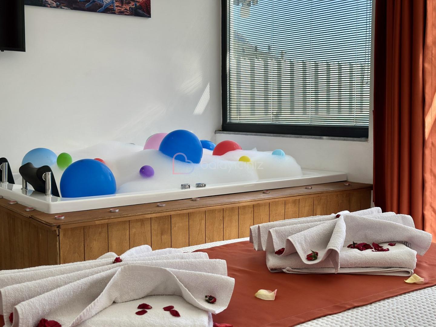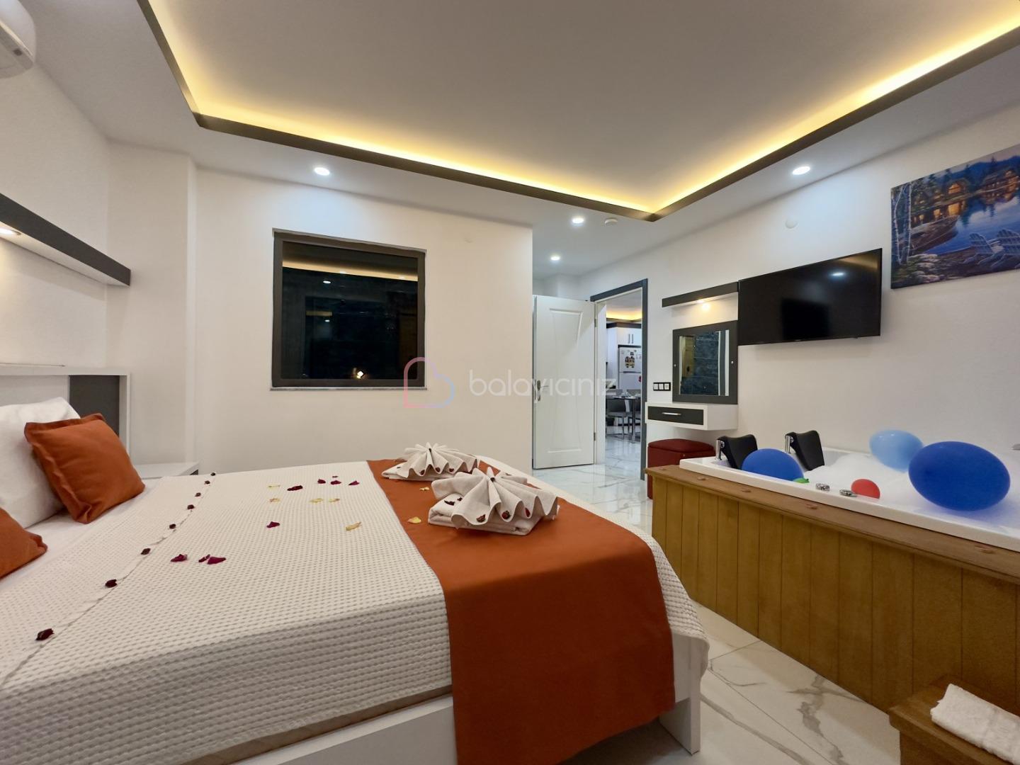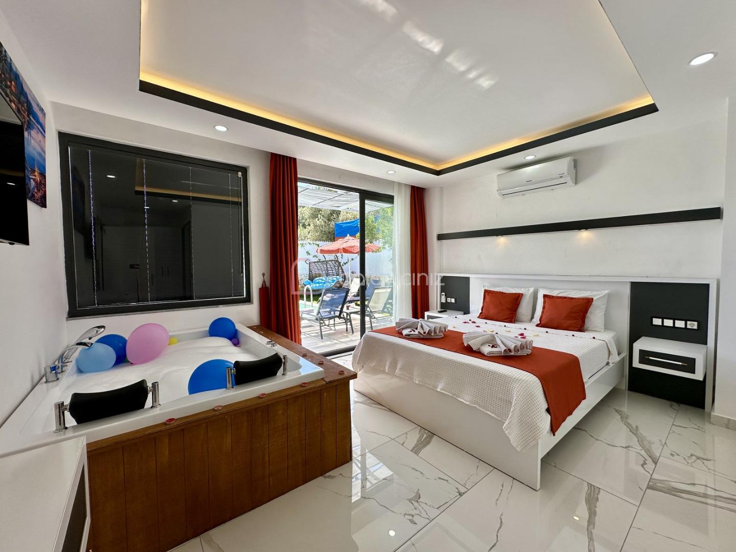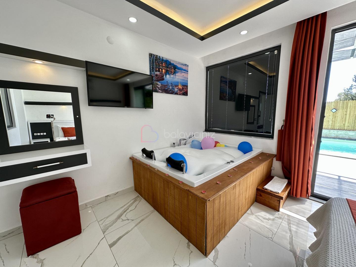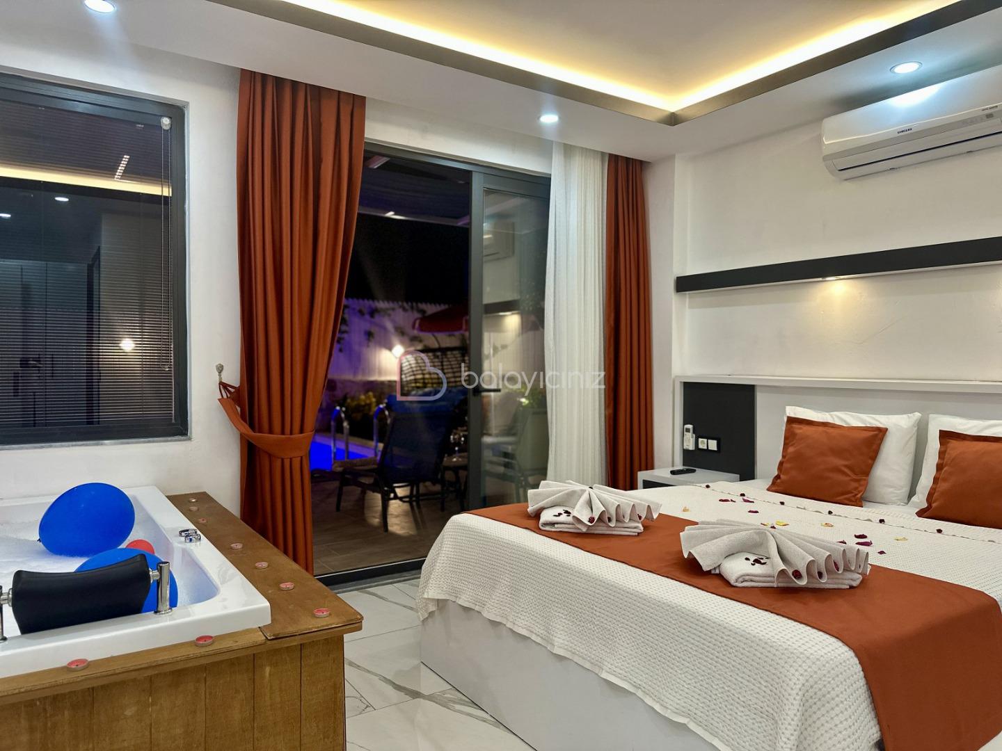 1. Yatak Odası: Çift kişilik yatak, klima, komodin, elbise dolabı, makyaj masası, jakuzi, banyo ve tuvalet bulunmaktadır.
