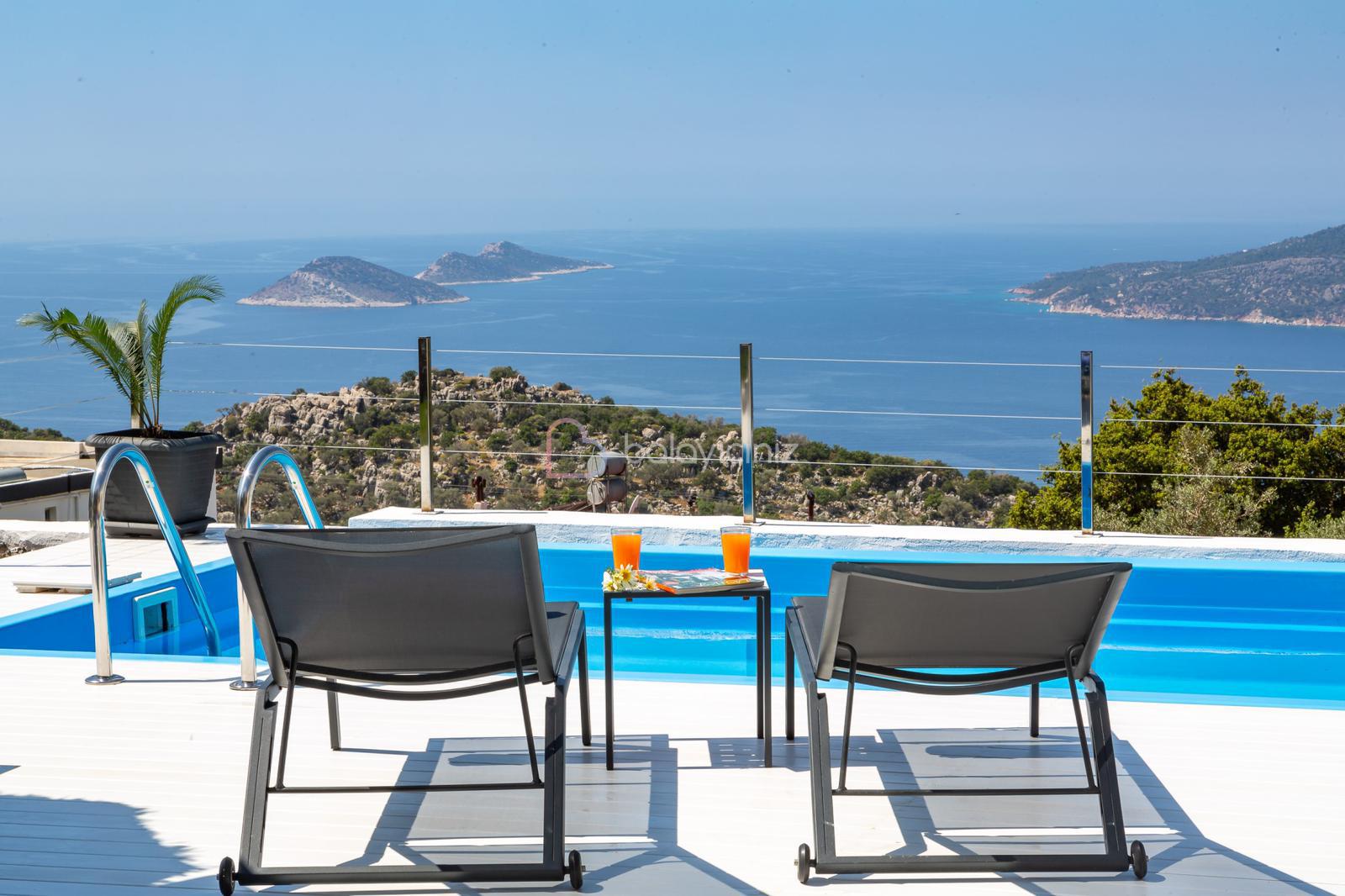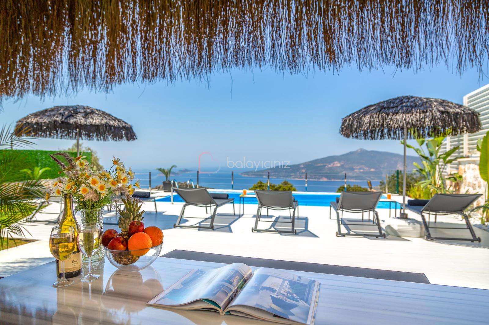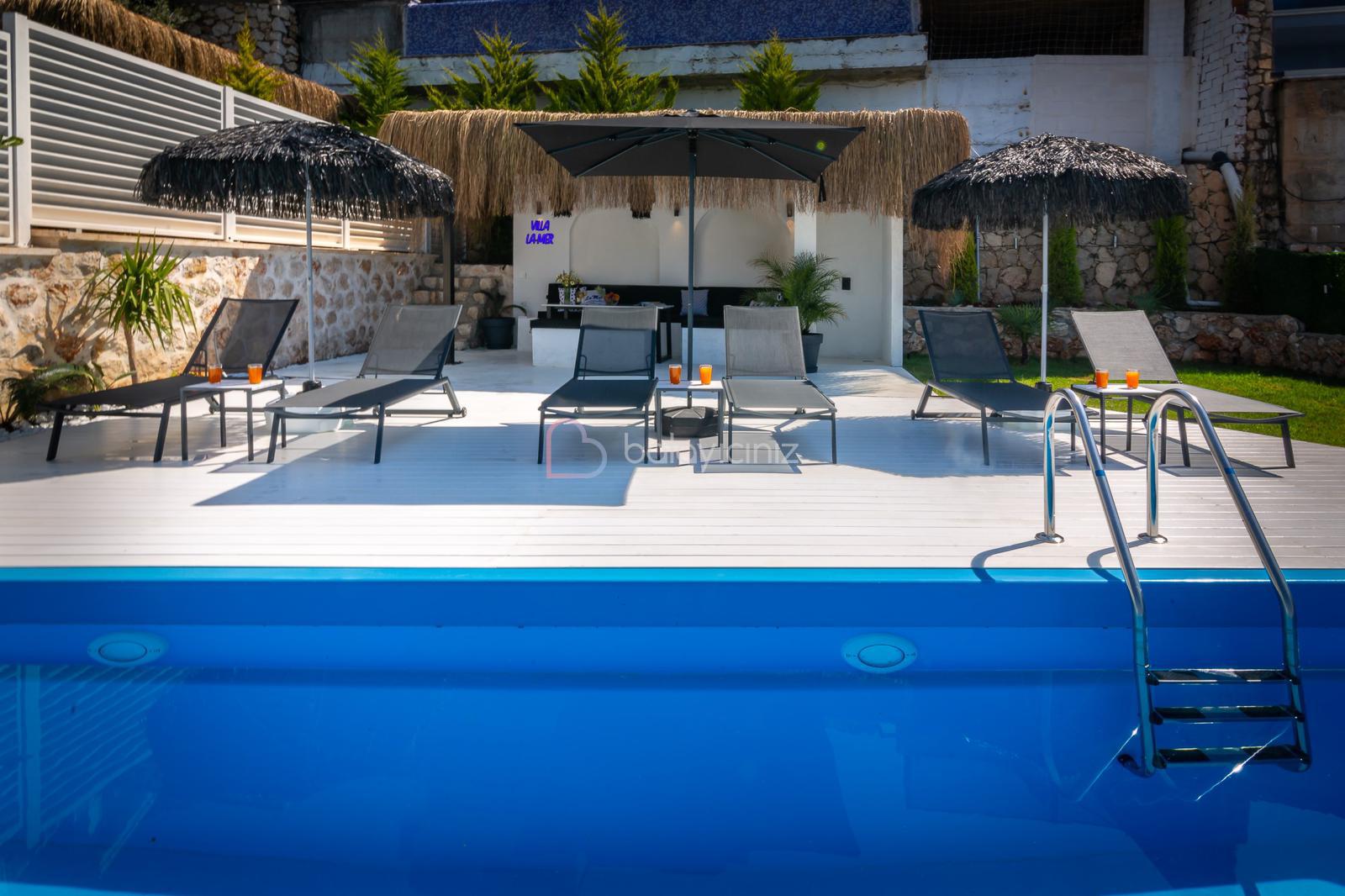 Not: Suite La Mer evinin kullanımına ait 160 m2, manzaralı bir teras/çim bahçe alanında açık havuz mevcuttur. Bu alan evin dışarısında, evin ana kapısından çıkıldığında yaklaşık 20 mt ilerisindeki özel kapalı bir bahçe alanıdır. Evin içerisinden direk bu alana çıkış yoktur. Havuz ölçüleri 7mt x 3mt dir. Derinlik 130 cm dir. Açık havuz çevre evlerden görülebilinir ve tamamen korunaklı değildir. Bu alanda gazlı barbekü bulunur. Bu ayrı açık havuz ve bahçe alanı sadece 1 Mayıs -31 Ekim arasında kullanıma açıktır. Diğer aylarda kapalıdır ve girilemez.