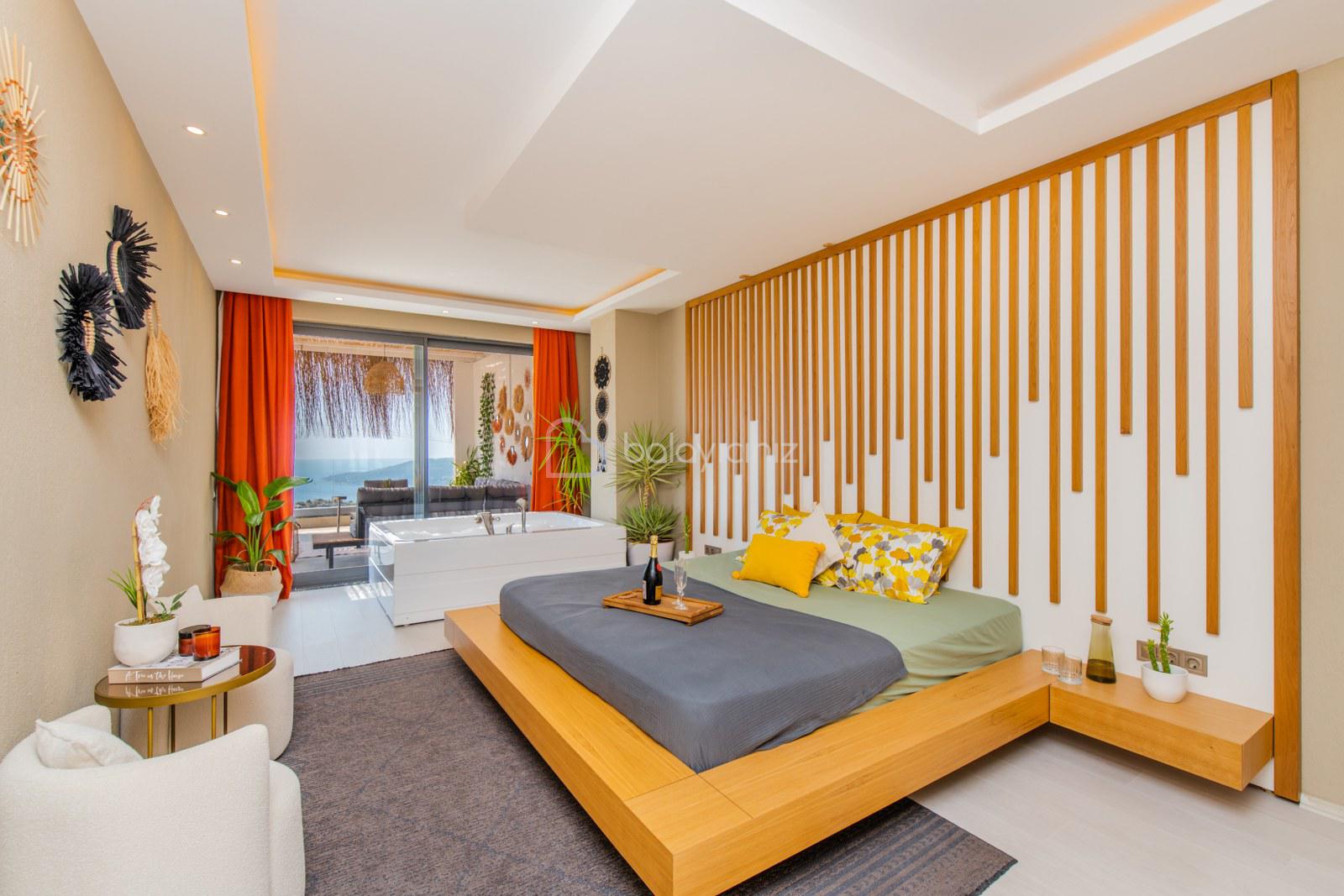 Kalkan Kördere bölgesinde yer alan Suit Palazzo, 2 kişi kapasiteli tek yatak odalıdır. 3. Katta yer alan korunaklı teras katı Suit Palazzo’da özel jakuzi havuzu, deniz manzarası, yatak odasında jakuzi bulunmaktadır. Büyüleyici deniz manzarası eşliğinde çayınızı kahvenizi yudumlarken yılın yorgunluğunu atabilir, sevdikleriniz ile unutulmaz tatil anıları biriktirebilirsiniz. Suit Palazzo Kalkan Merkez bölgesine 3,5 km mesafe yer almaktadır.