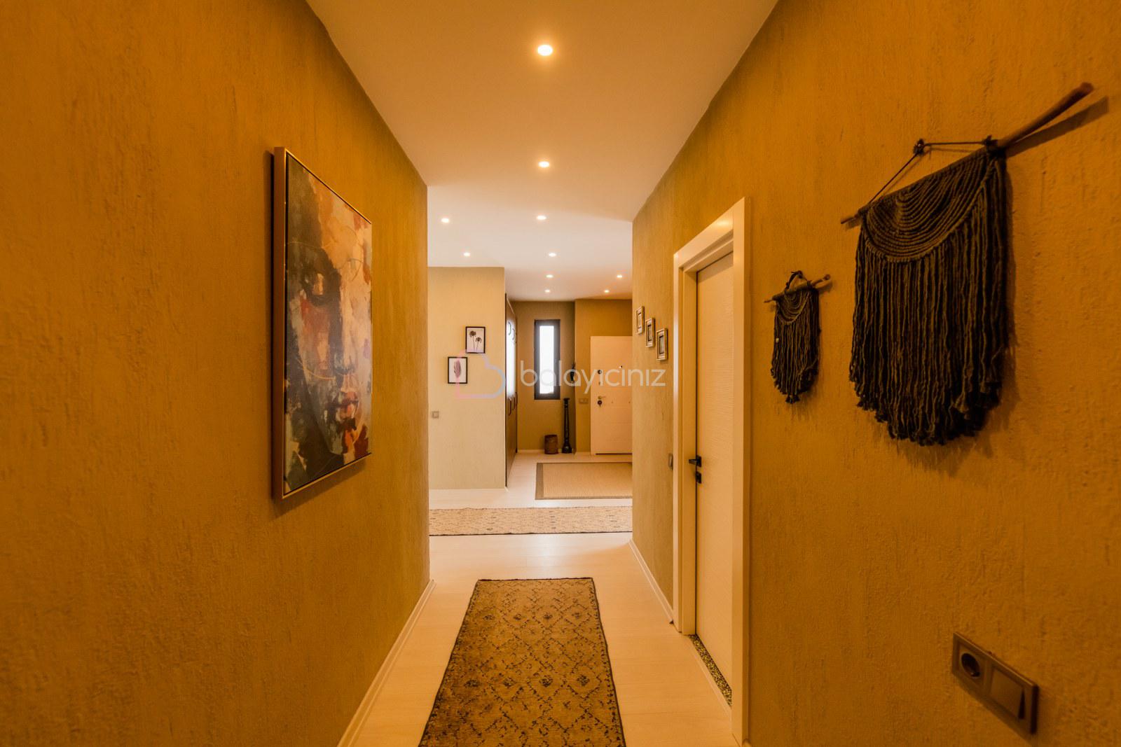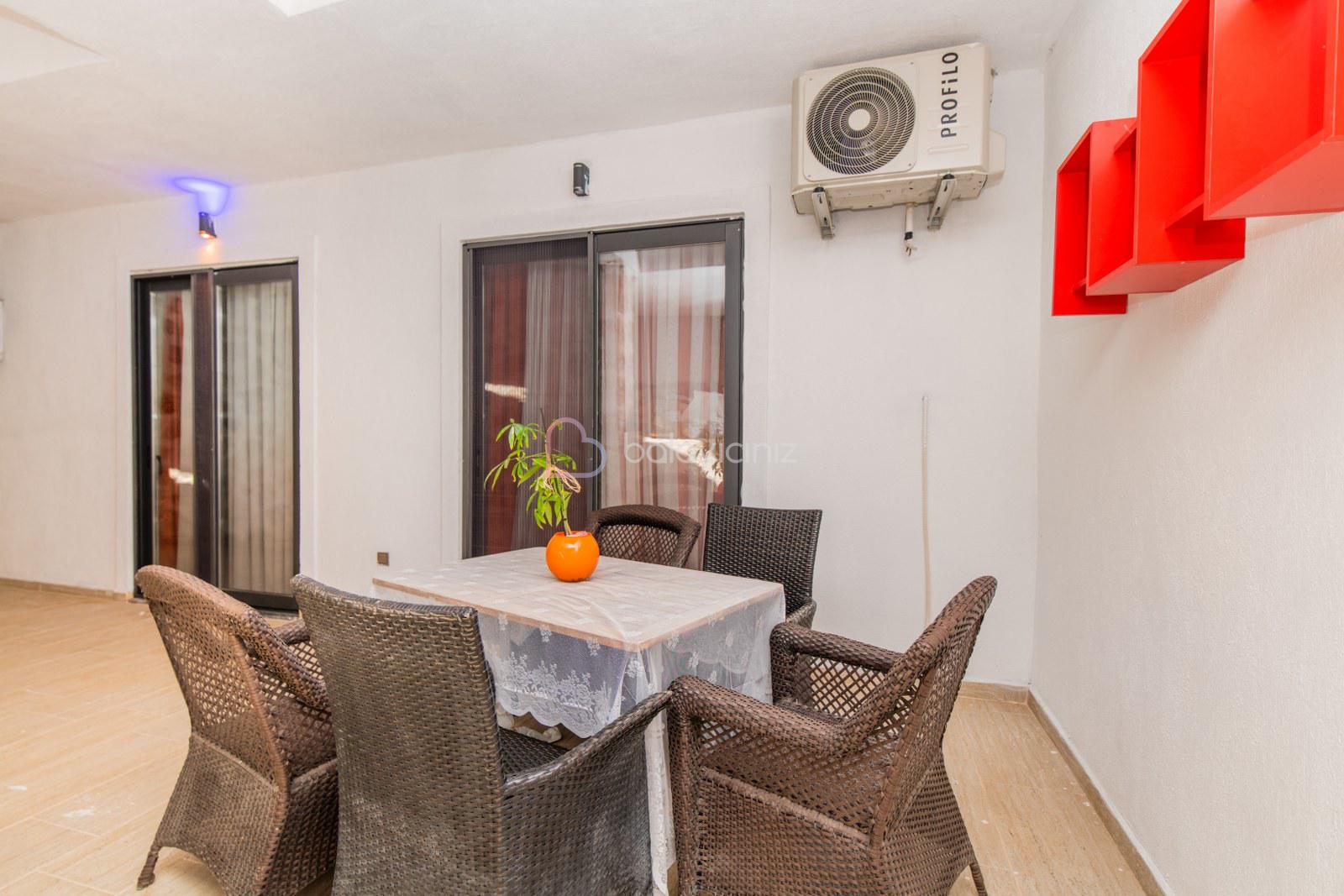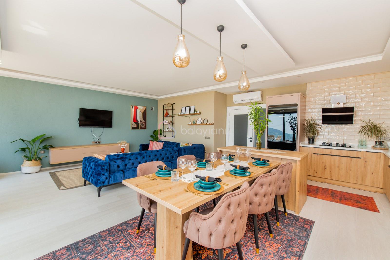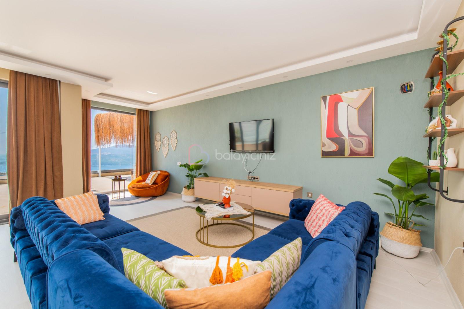 Modern şık oturma grubu, televizyon, klima, havuz terasına çıkış bulunmaktadır.