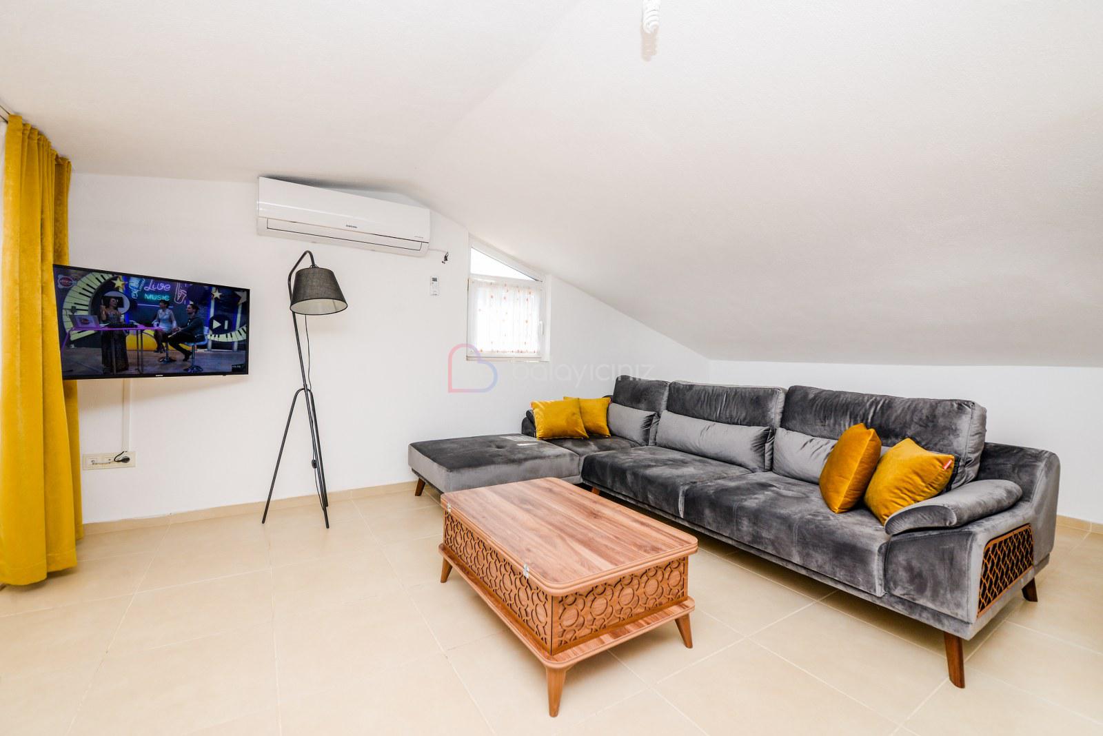 Salonunda oturma grubu, plazma TV, uydu alıcısı, klima, yemek masası, ütü ve ütü masası ve havuz başına çıkış bulunmaktadır.