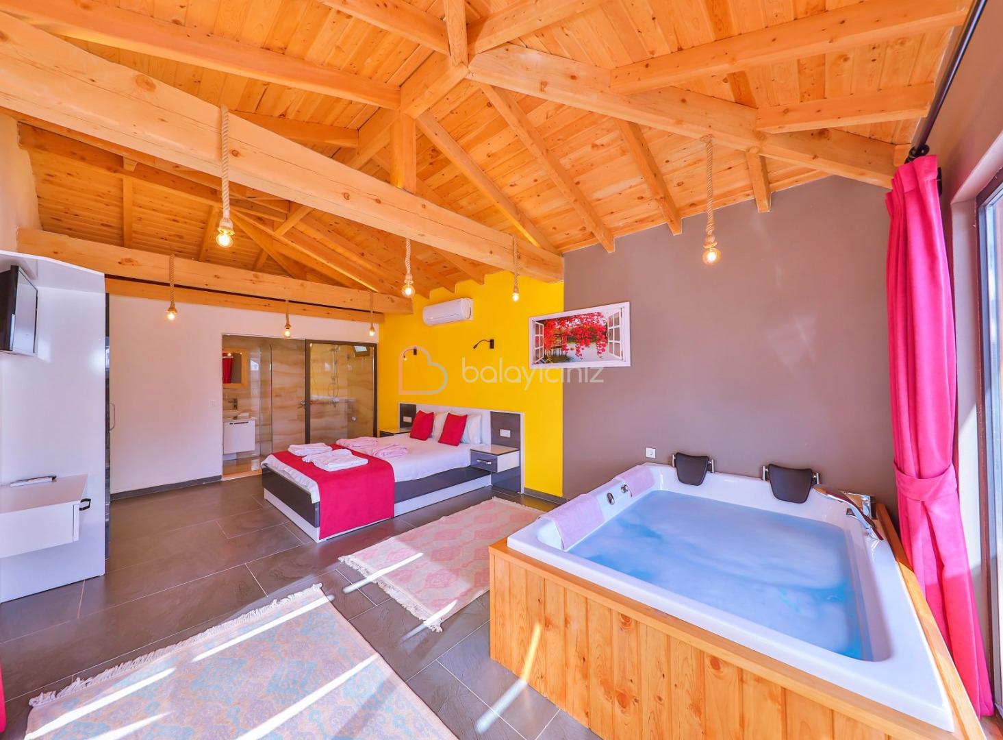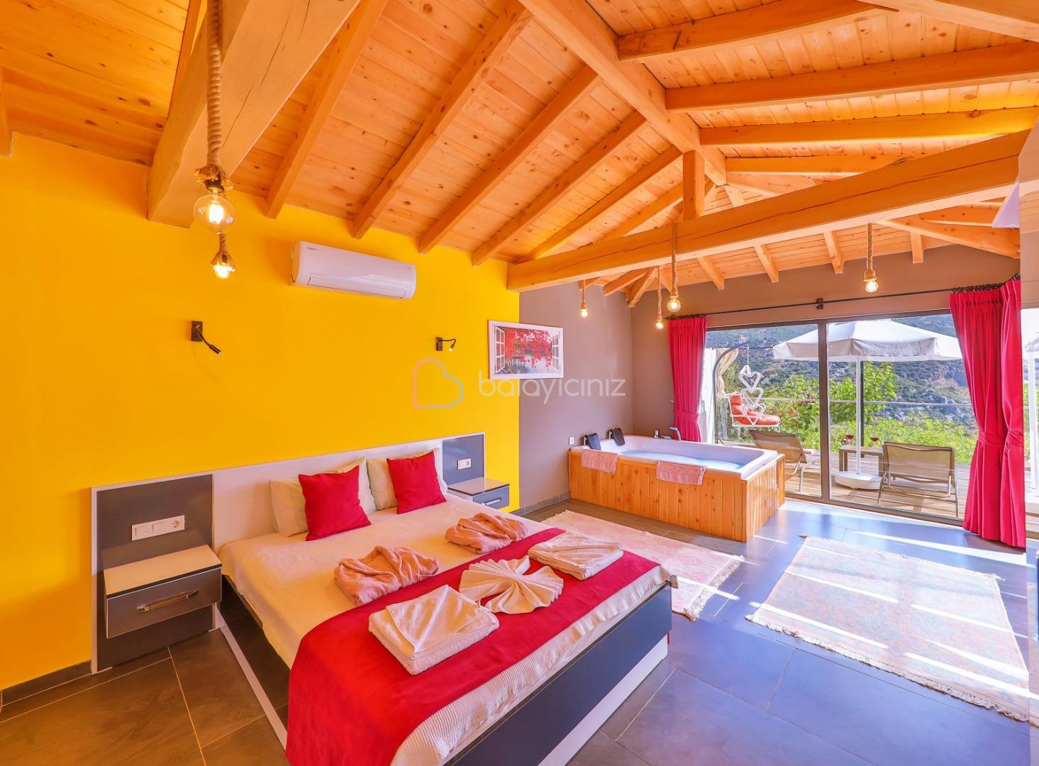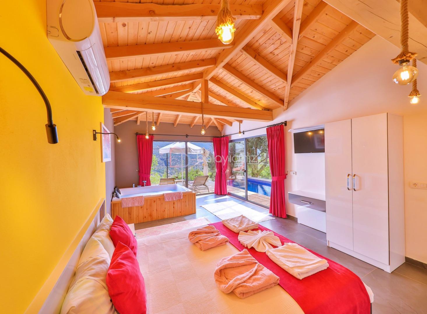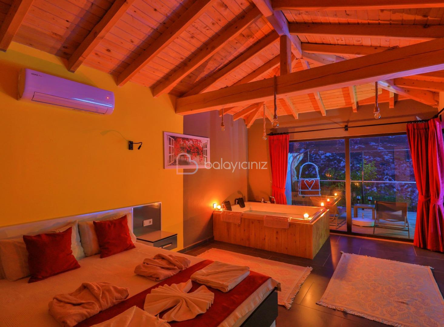 Yatak Odası 1: Çift kişilik yatak, klima, komodin, elbise dolabı, tv, makyaj masası, jakuzi, banyo ve tuvalet, havuz başına çıkış bulunmaktadır.