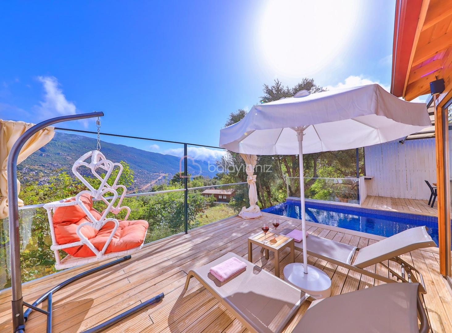 Havuz terası korunaklıdır dış taraftan görünmemektedir. Havuz terasında şezlong, şemsiye, mangal, salıncak, 2 kişilik yemek masası bulunmaktadır.