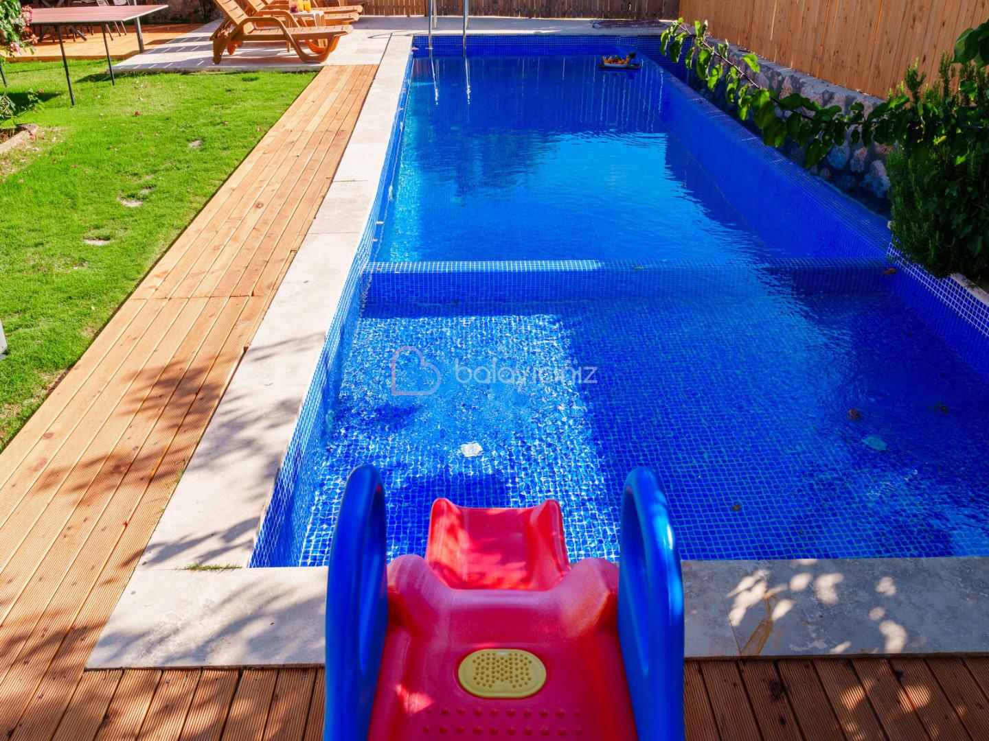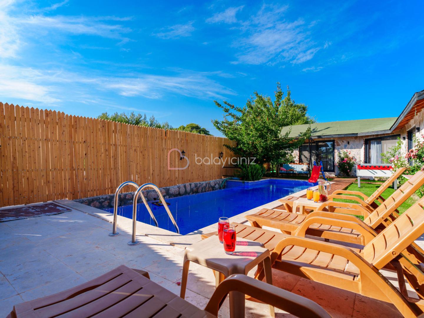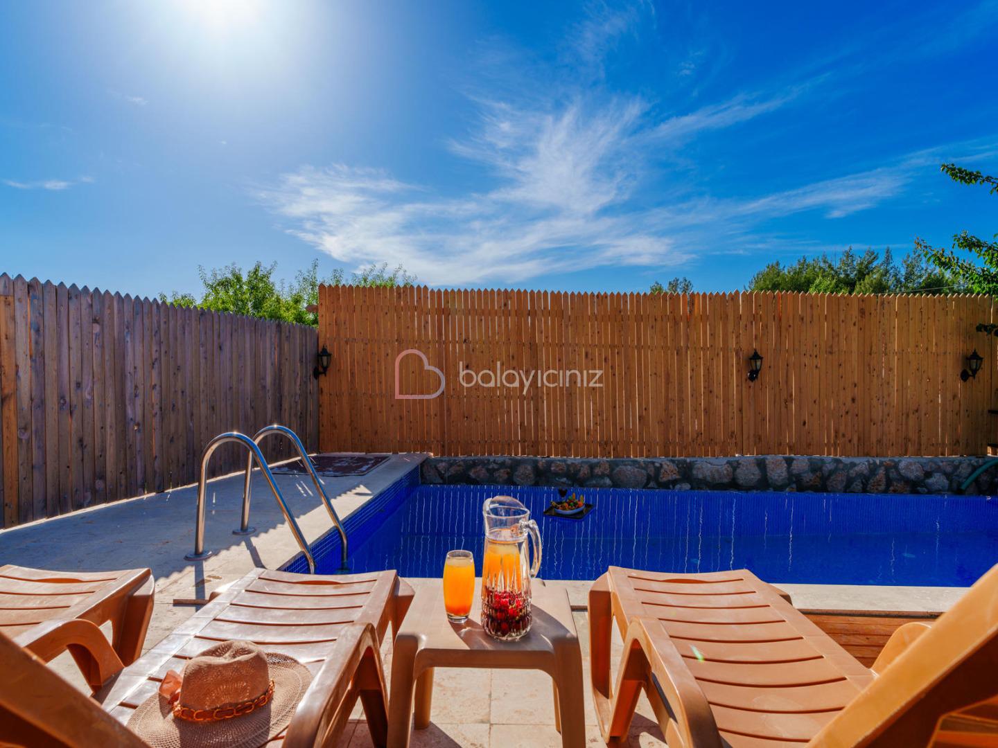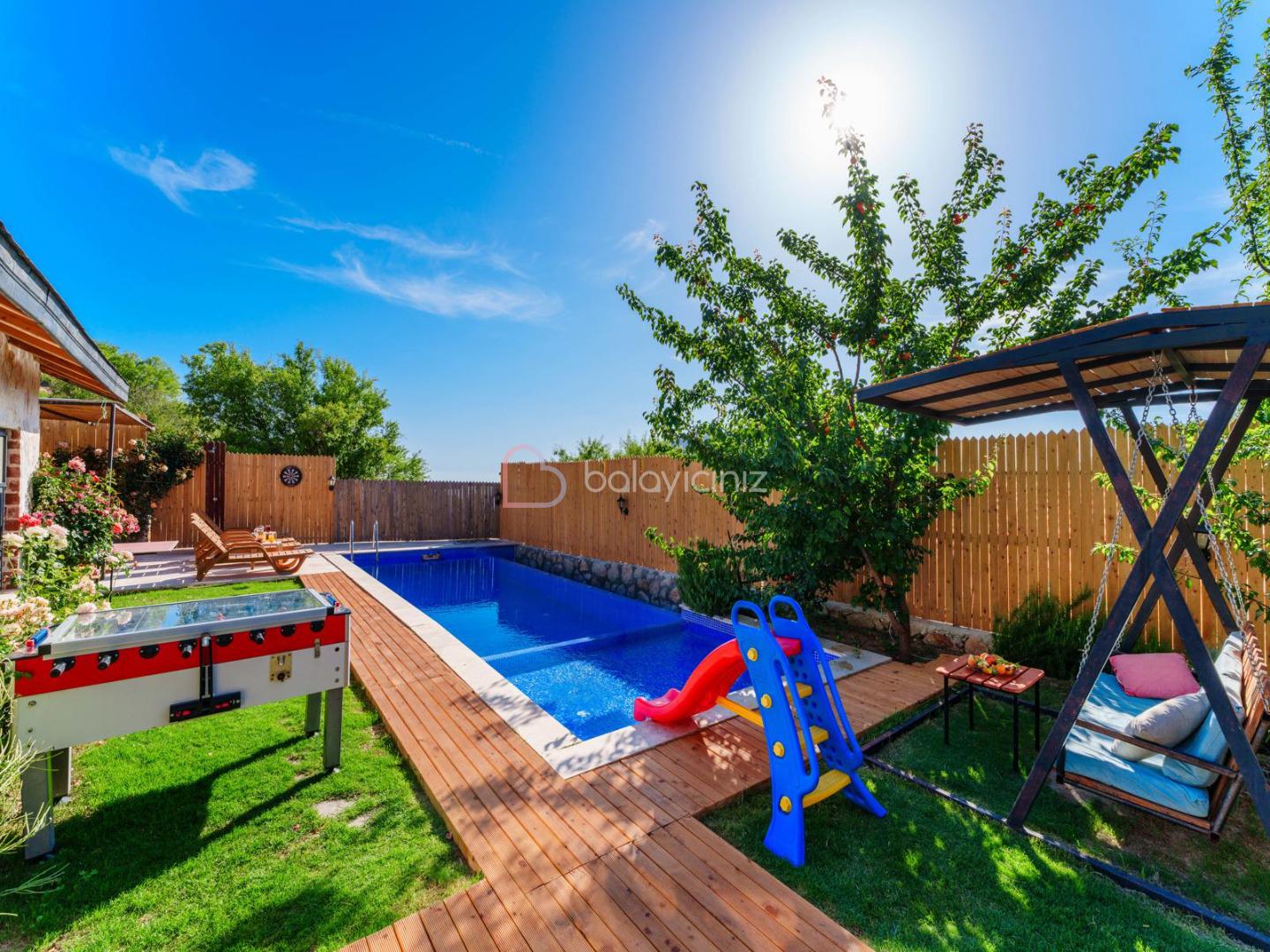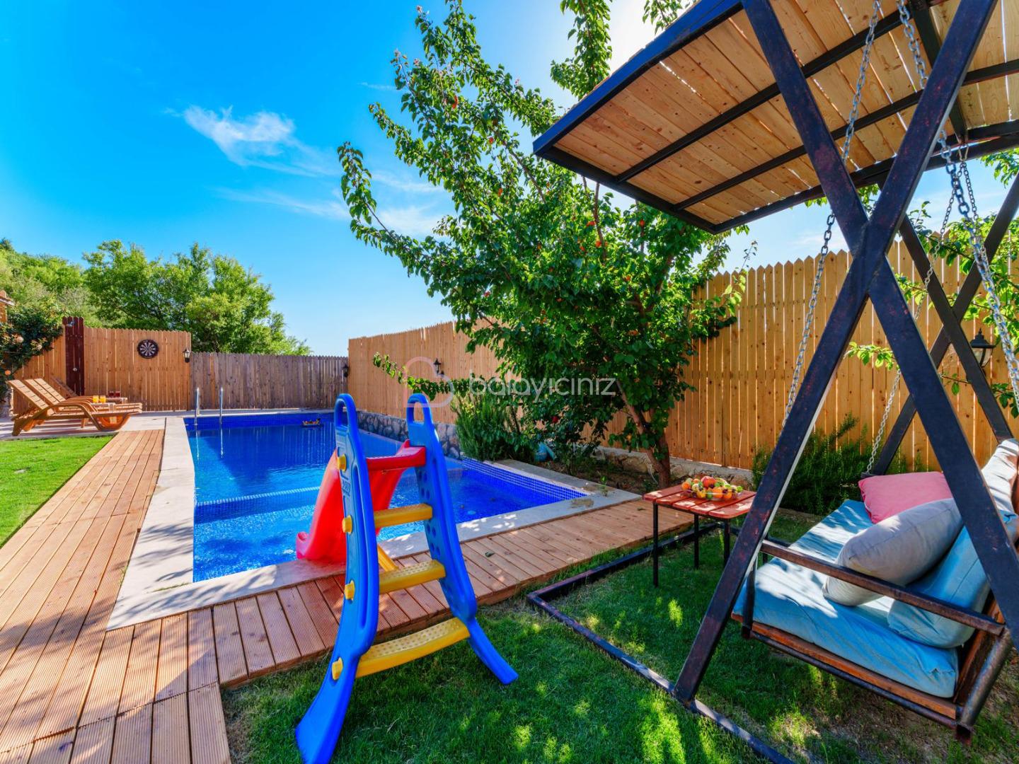 Villa Akbas bahçesinde özel yüzme havuzu, sezlong, semsiye, oturma grubu, mangal ve yemek masasi, salincak bulunmaktadir.