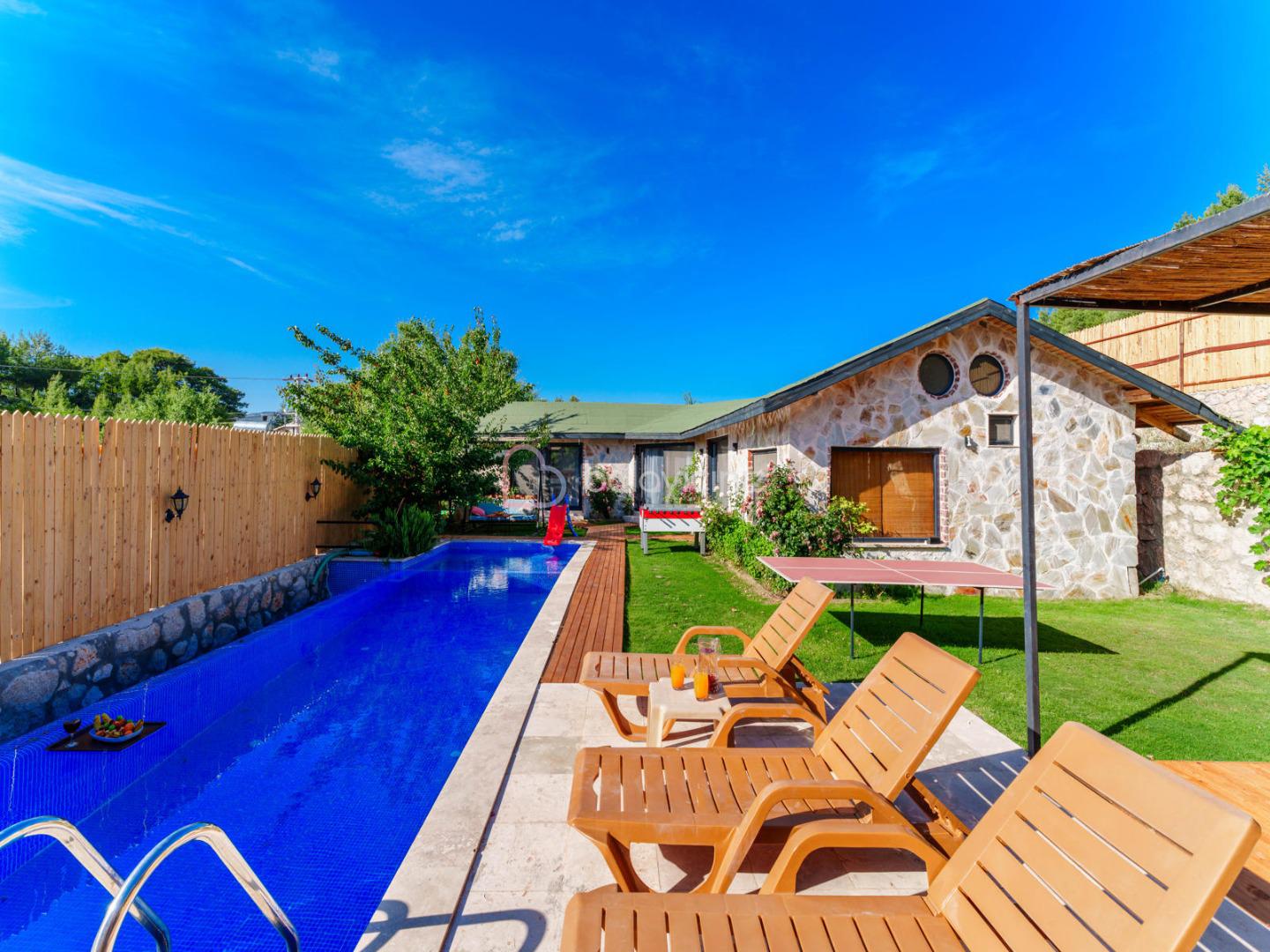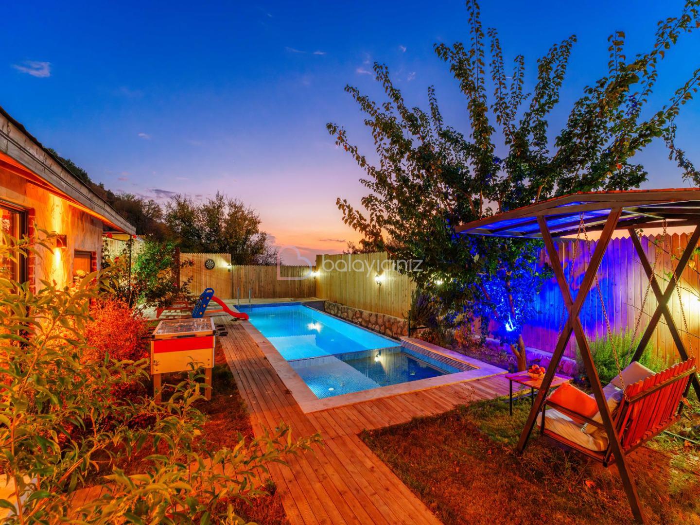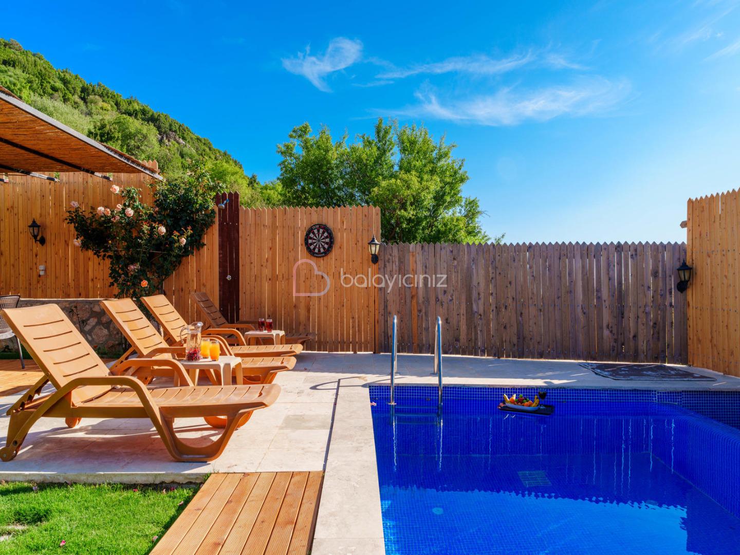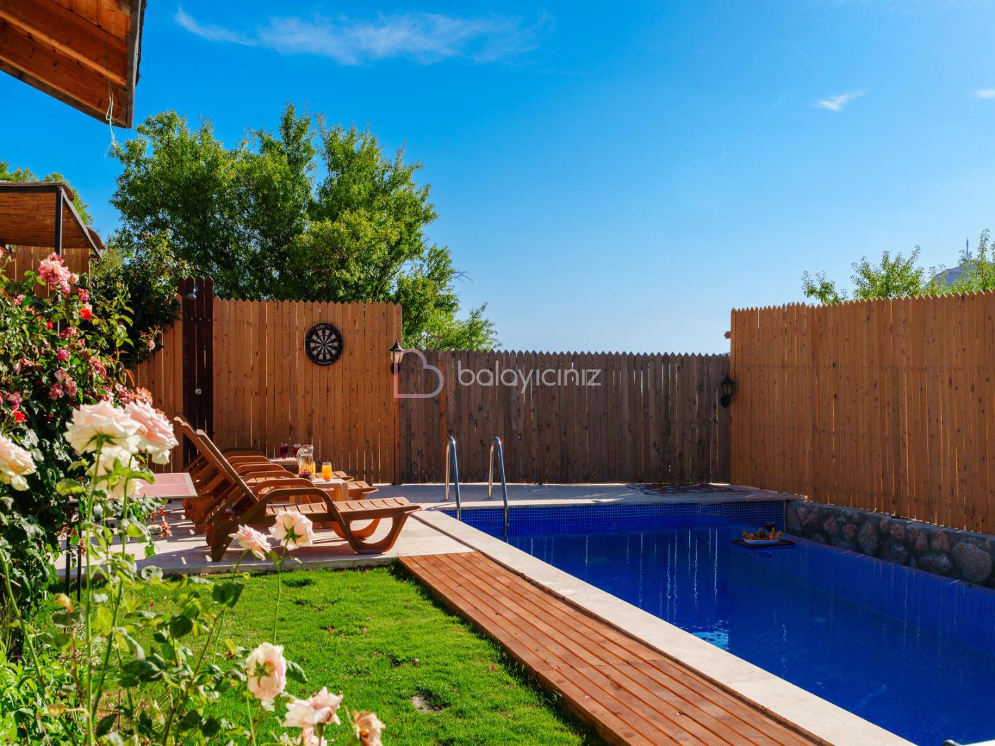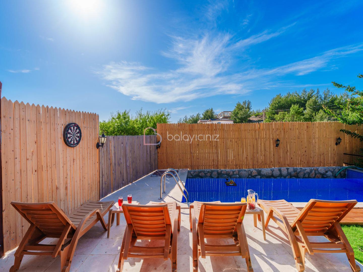 Villa Akbas bahçesinde özel yüzme havuzu, sezlong, semsiye, oturma grubu, mangal ve yemek masasi, salincak bulunmaktadir.