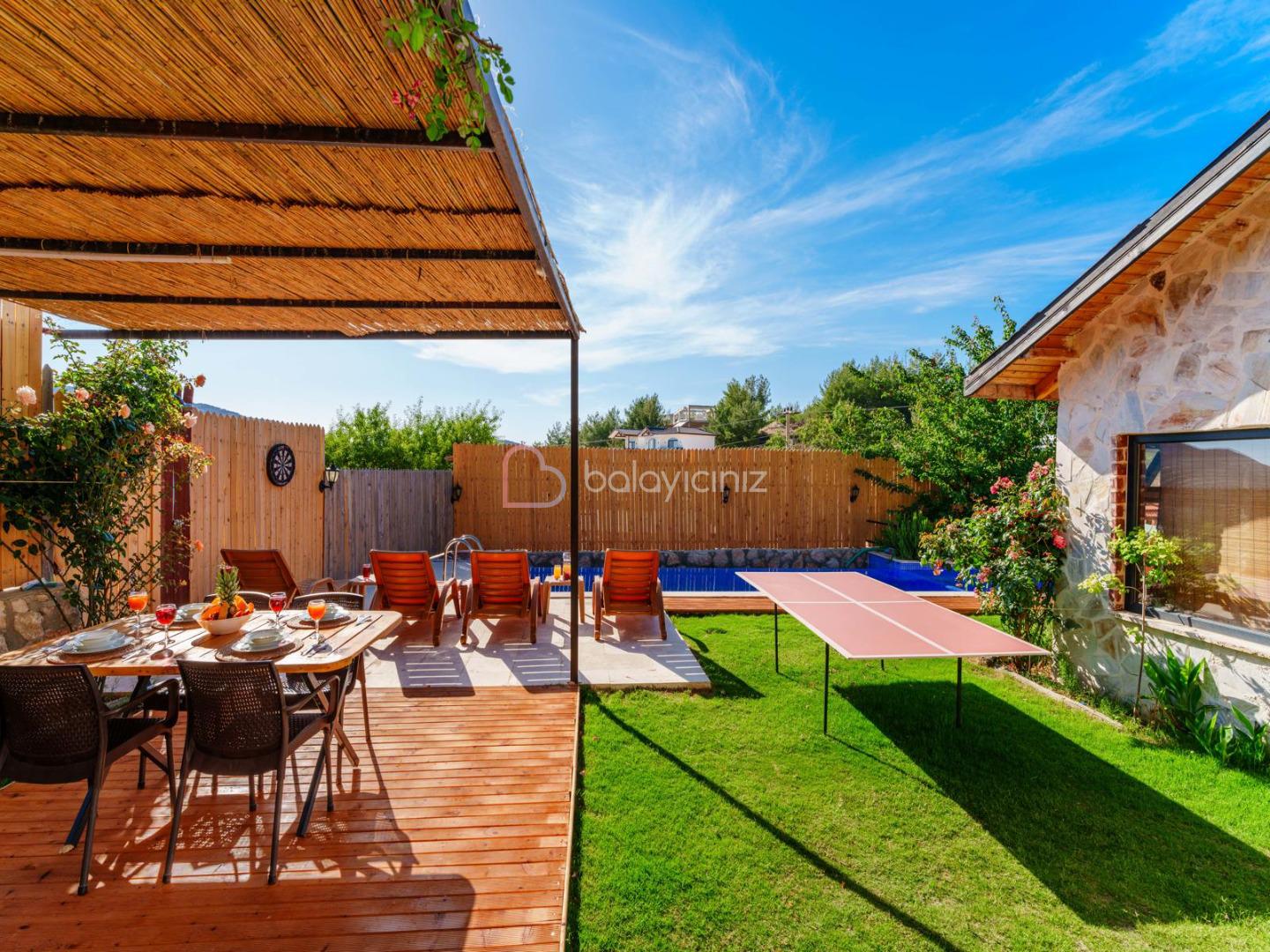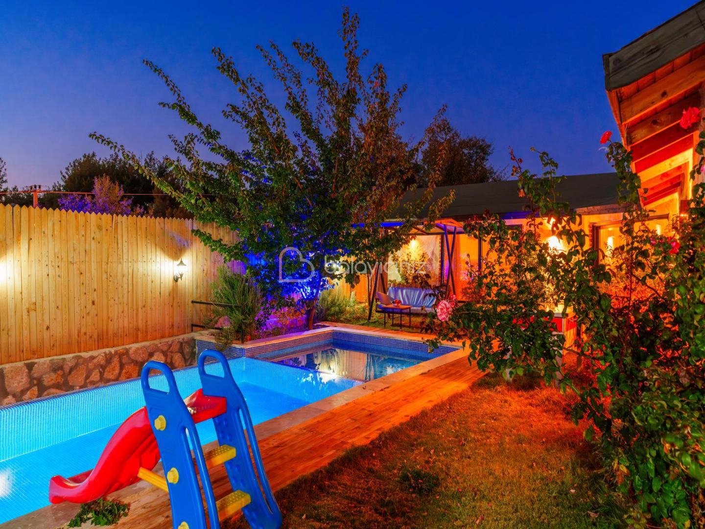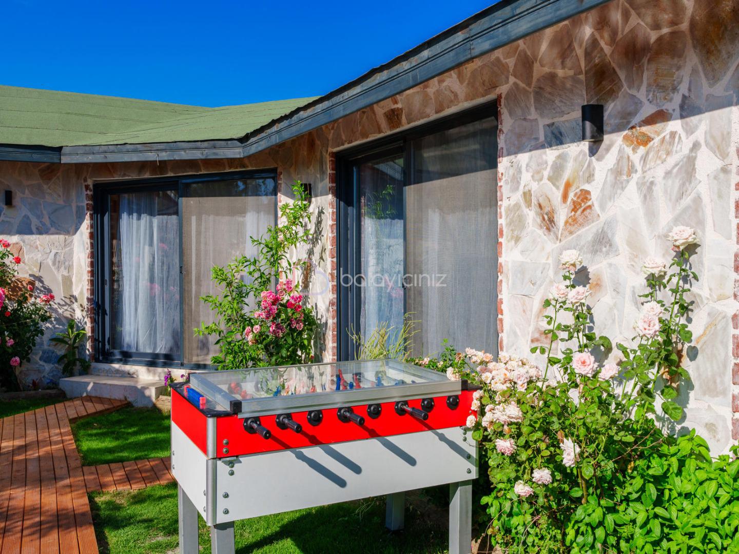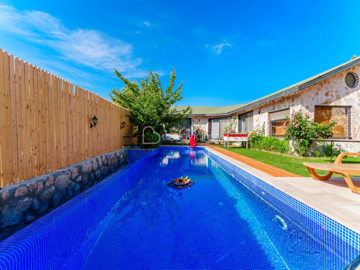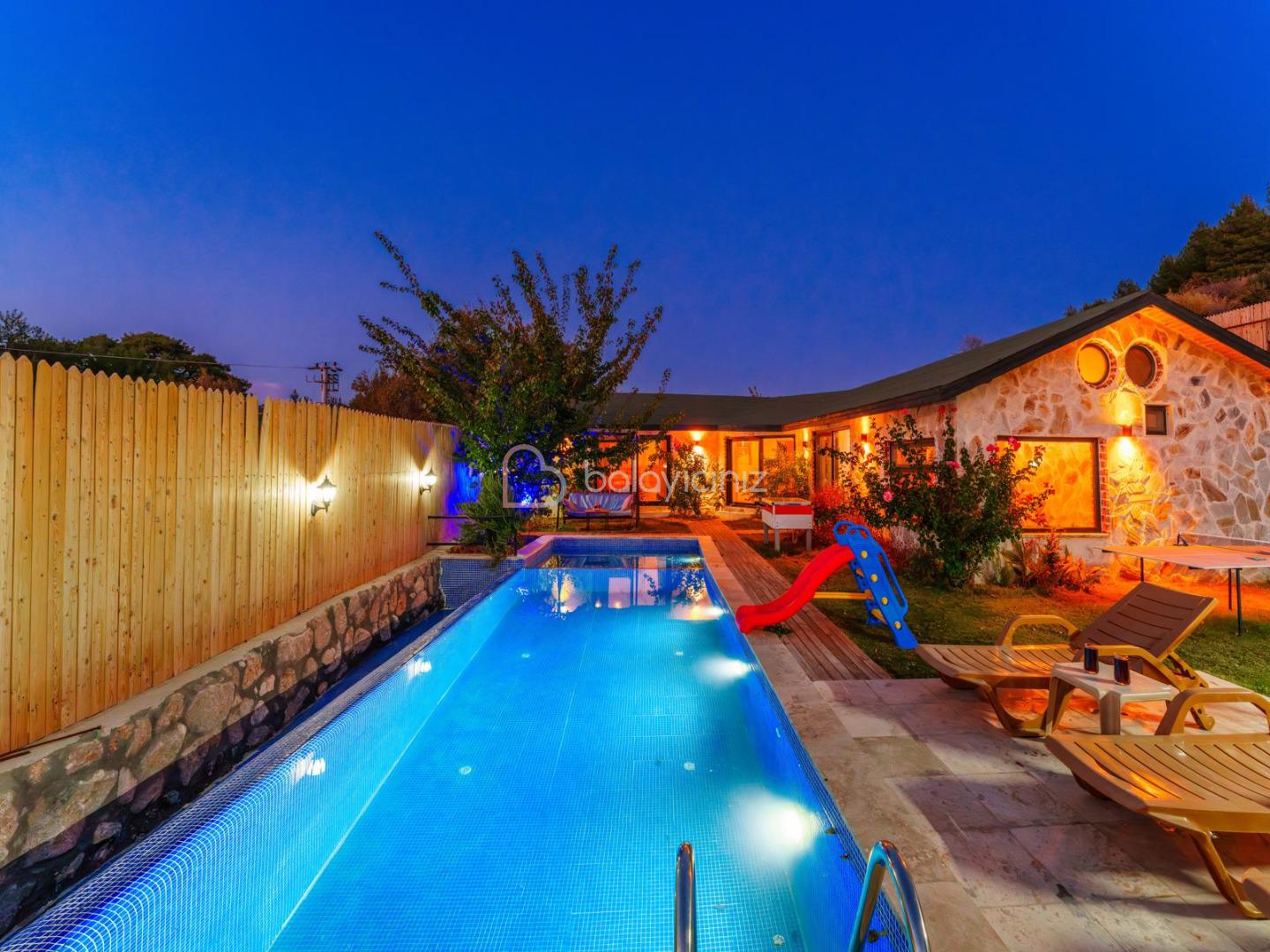 Villa Akbas bahçesinde özel yüzme havuzu, sezlong, semsiye, oturma grubu, mangal ve yemek masasi, salincak bulunmaktadir.