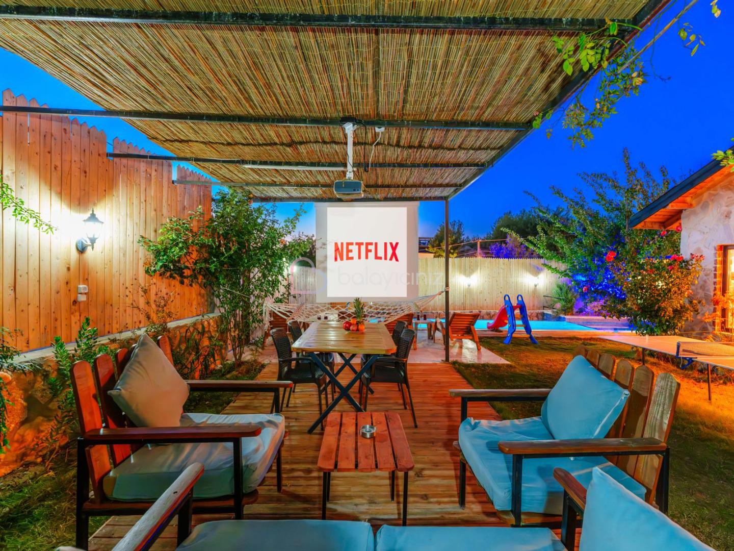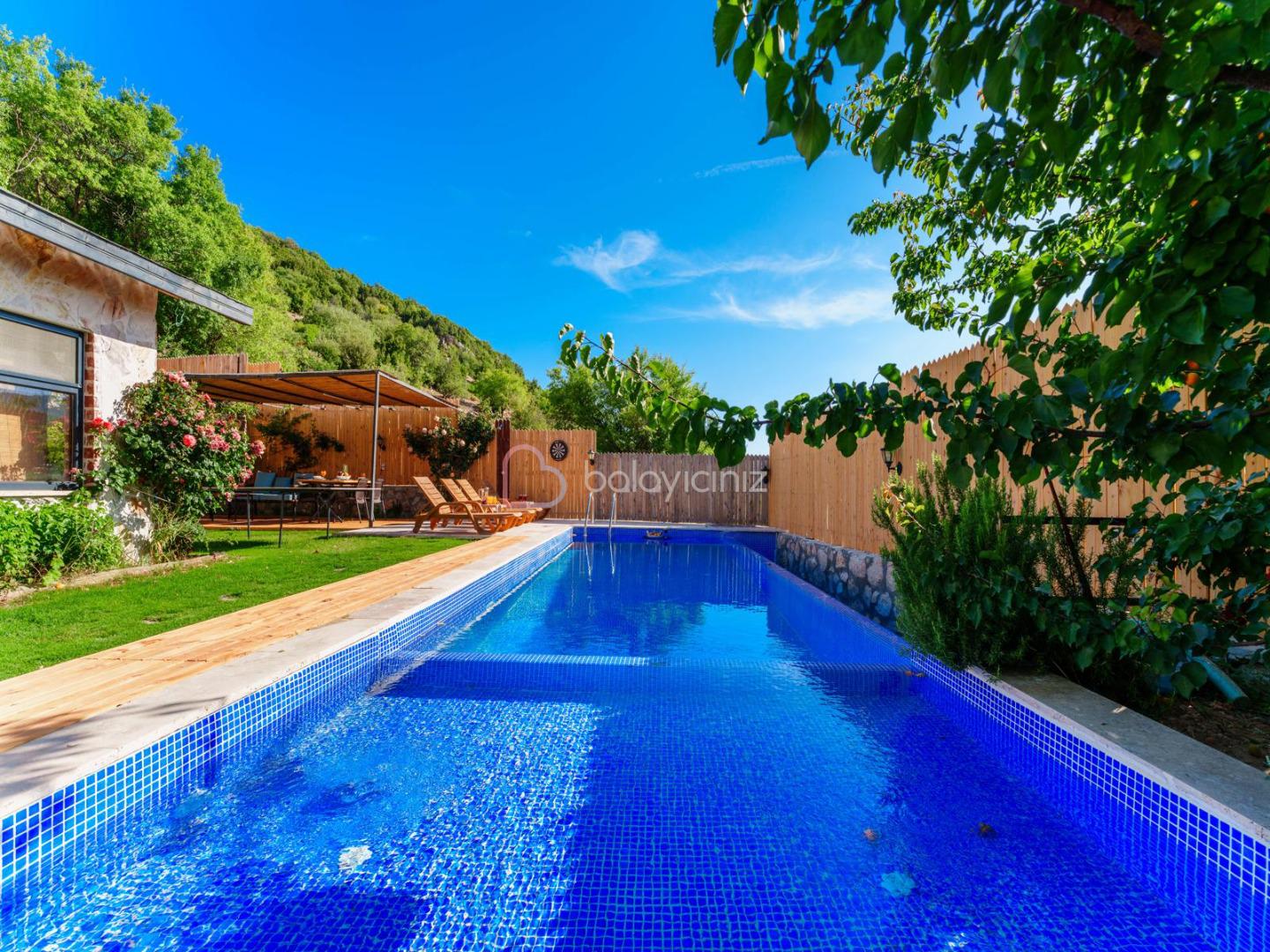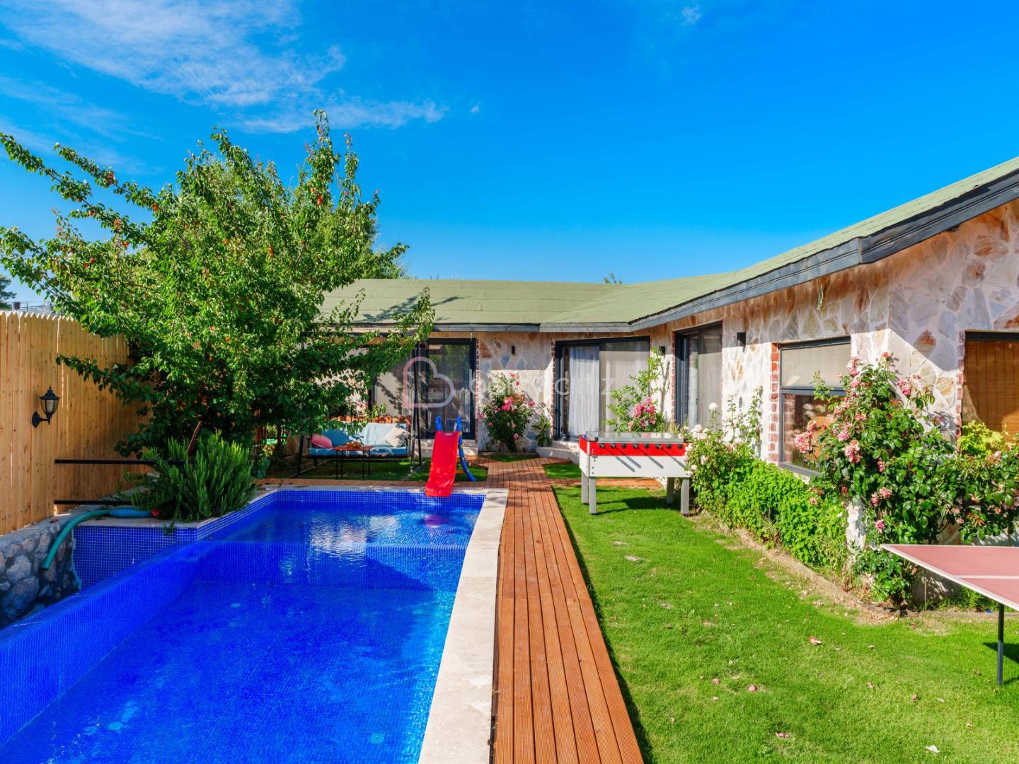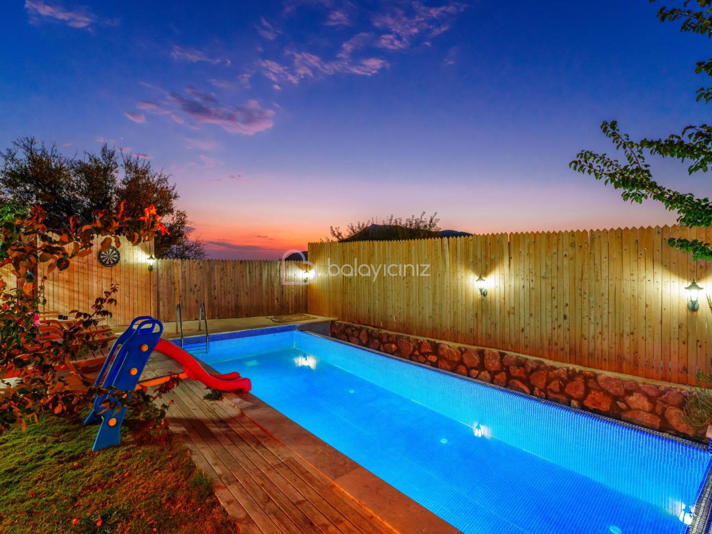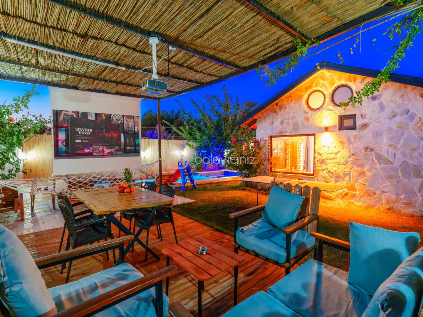 Villa Akbas bahçesinde özel yüzme havuzu, sezlong, semsiye, oturma grubu, mangal ve yemek masasi, salincak bulunmaktadir.