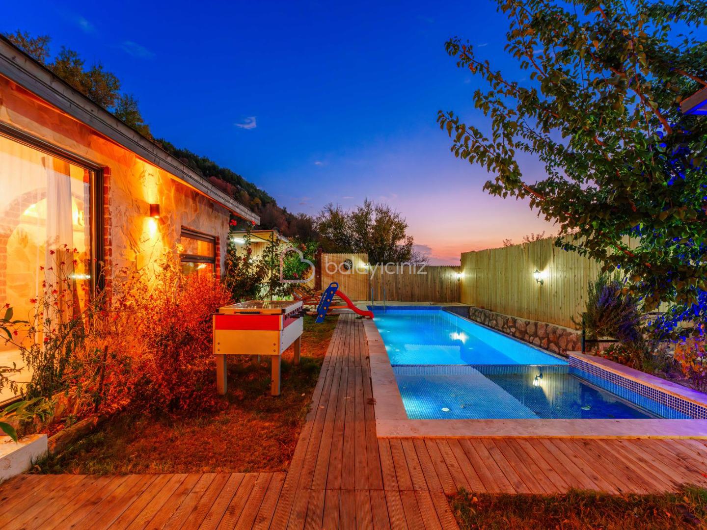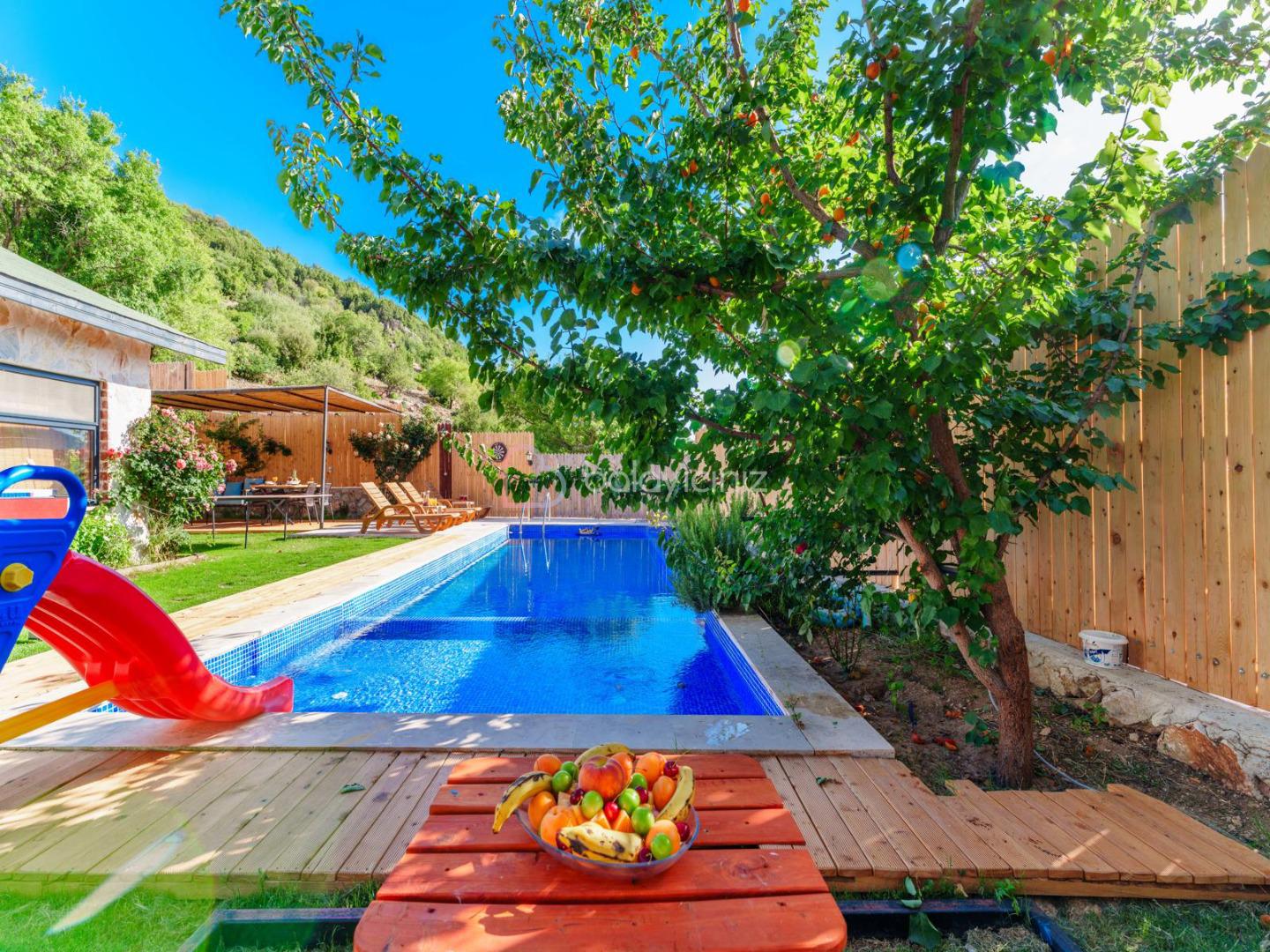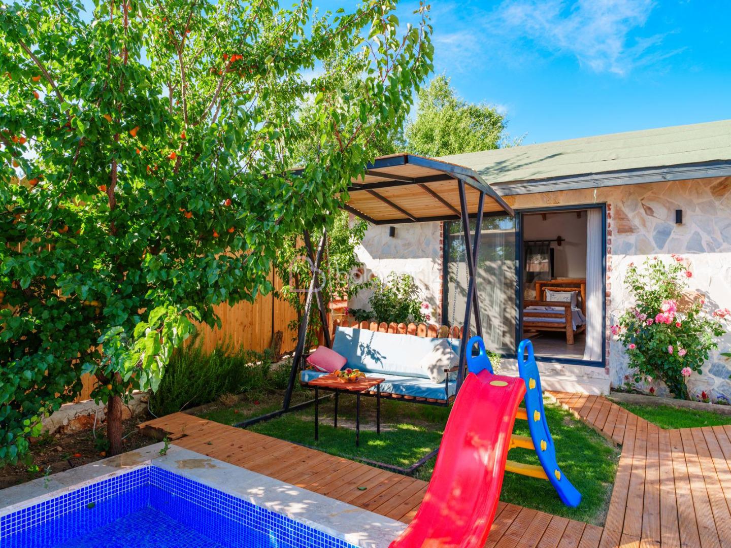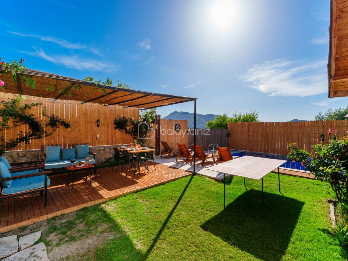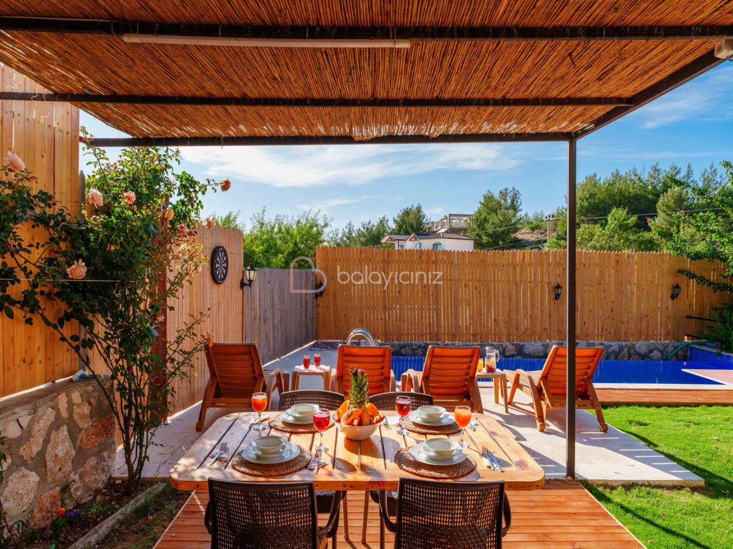 Villa Akbas bahçesinde özel yüzme havuzu, sezlong, semsiye, oturma grubu, mangal ve yemek masasi, salincak bulunmaktadir.