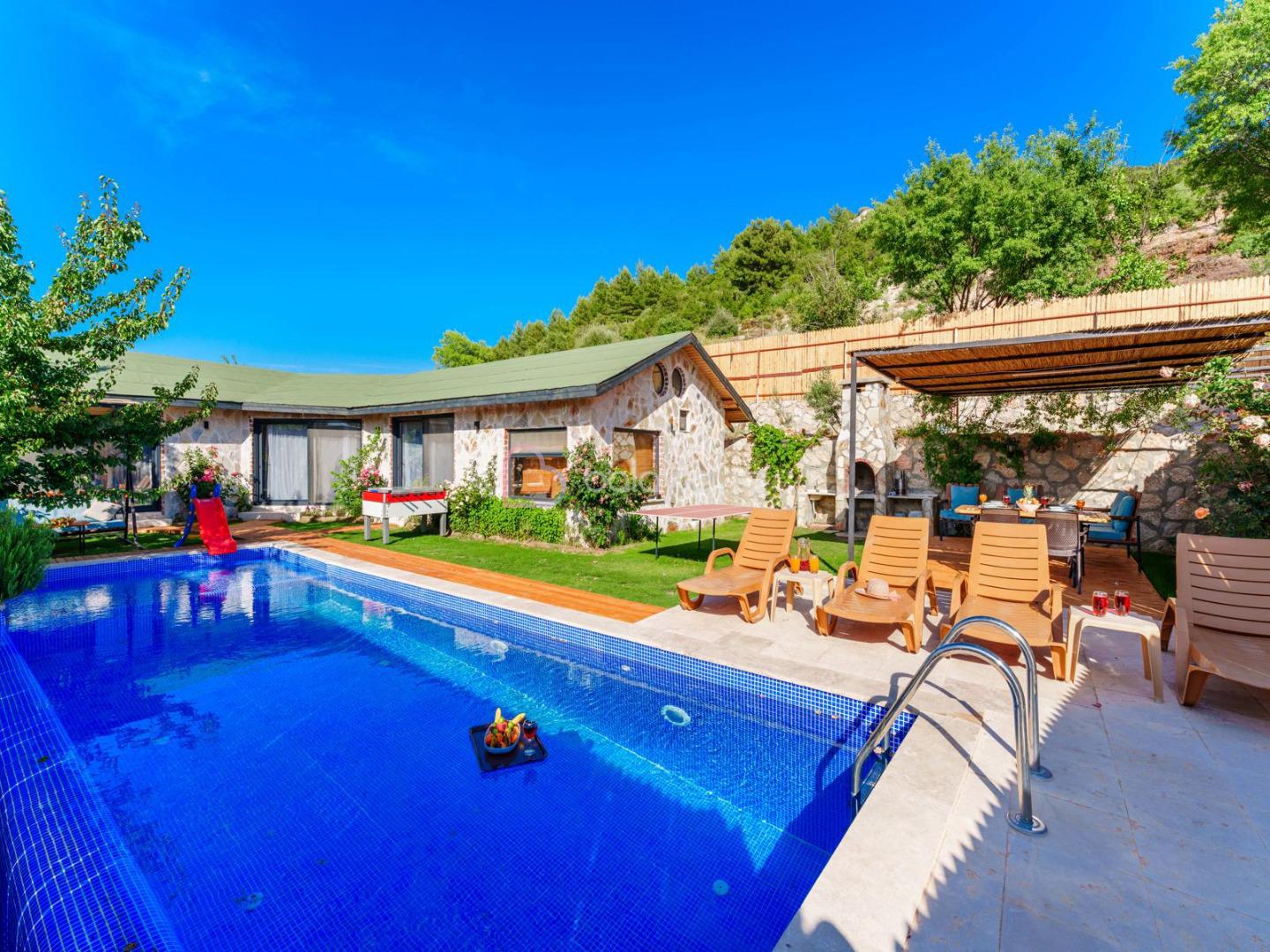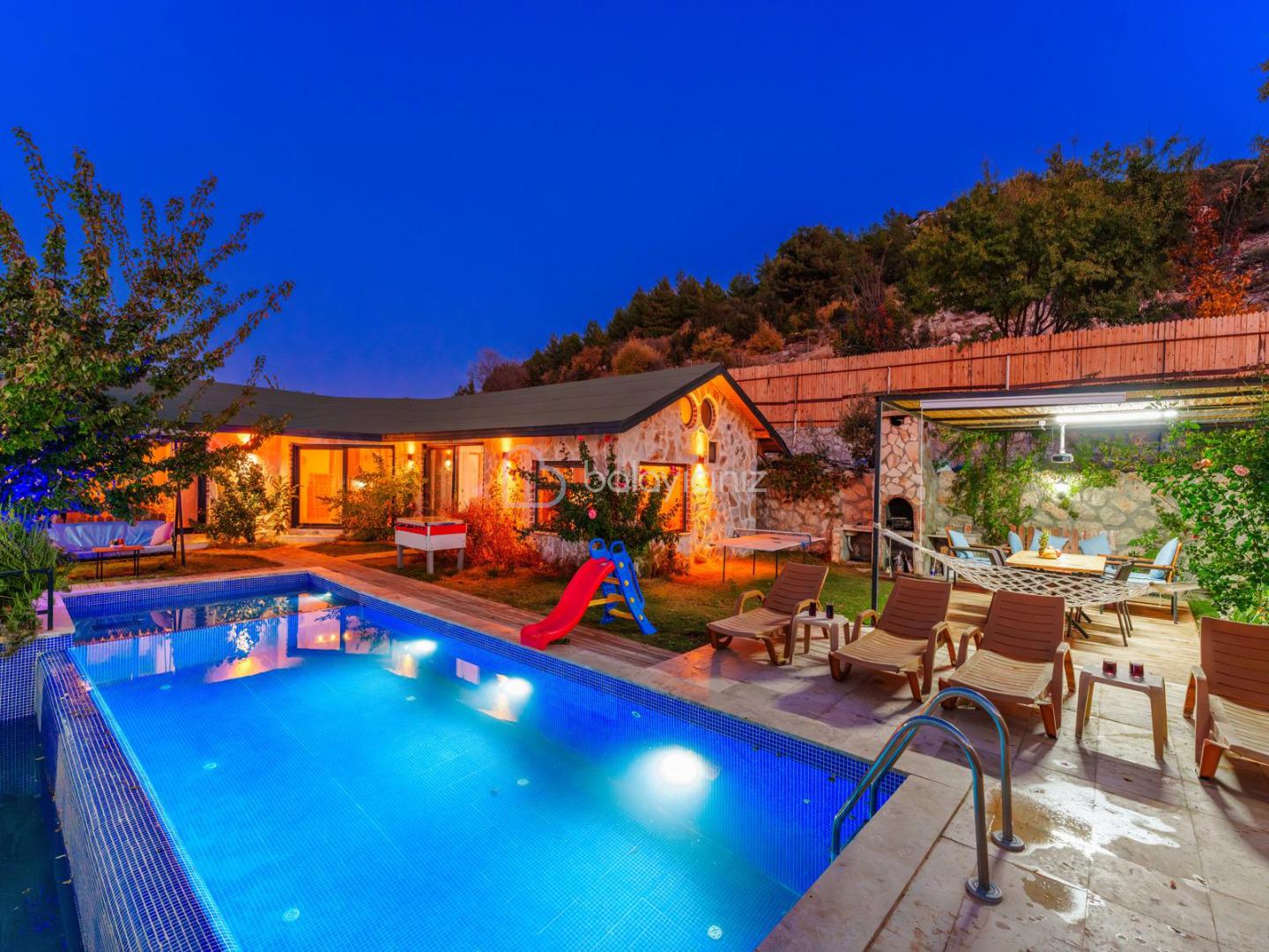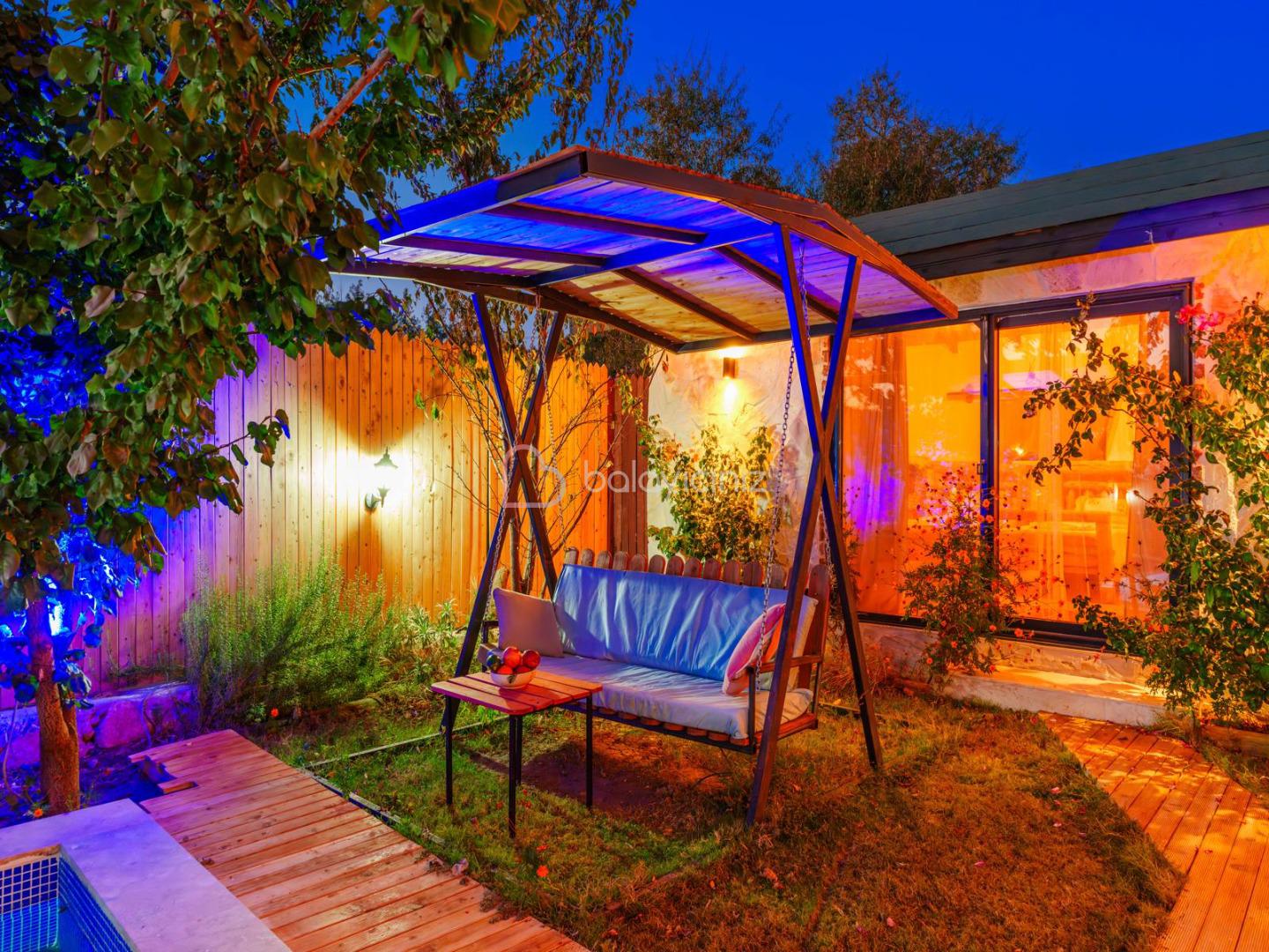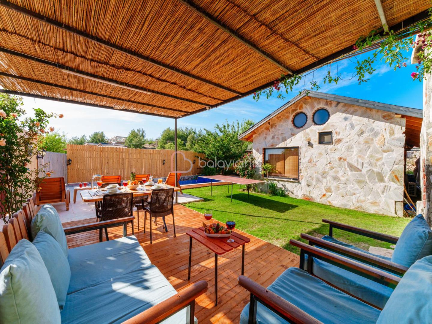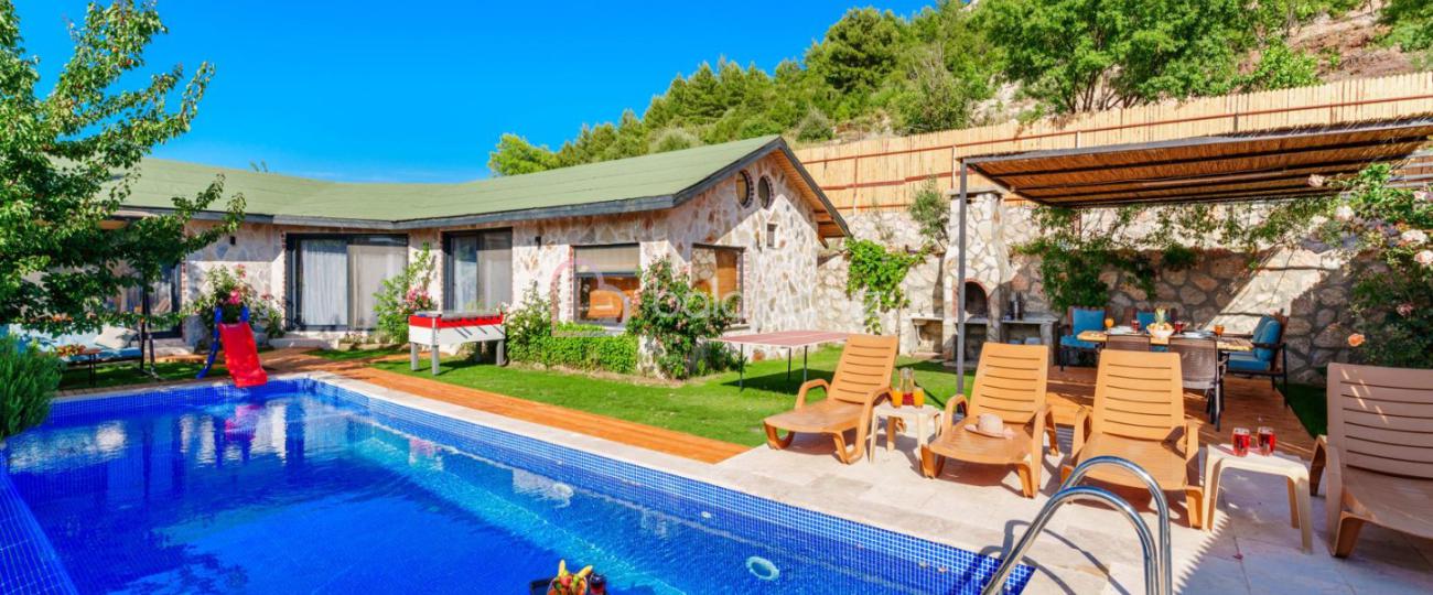 Villa Akbas bahçesinde özel yüzme havuzu, sezlong, semsiye, oturma grubu, mangal ve yemek masasi, salincak bulunmaktadir.