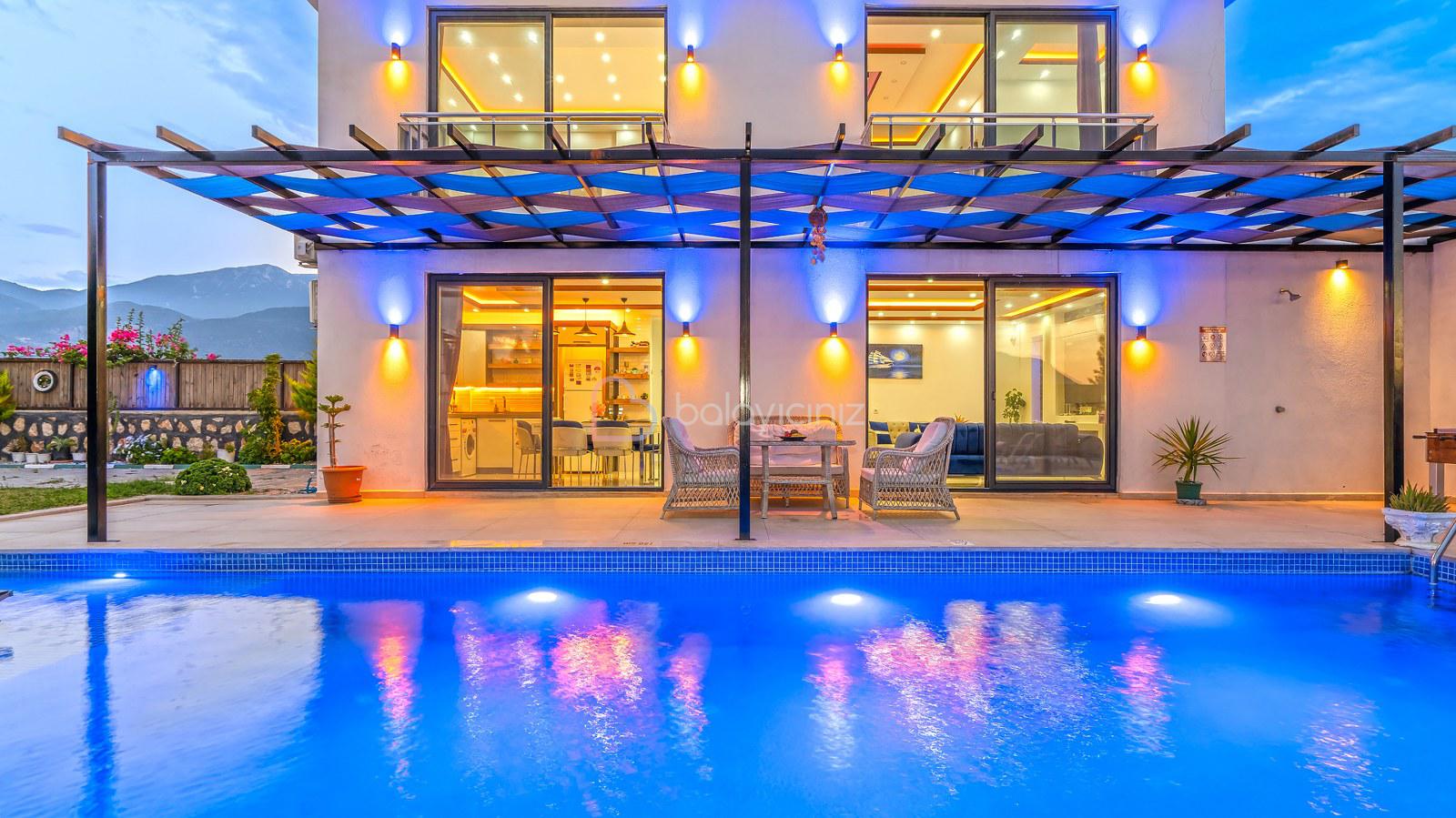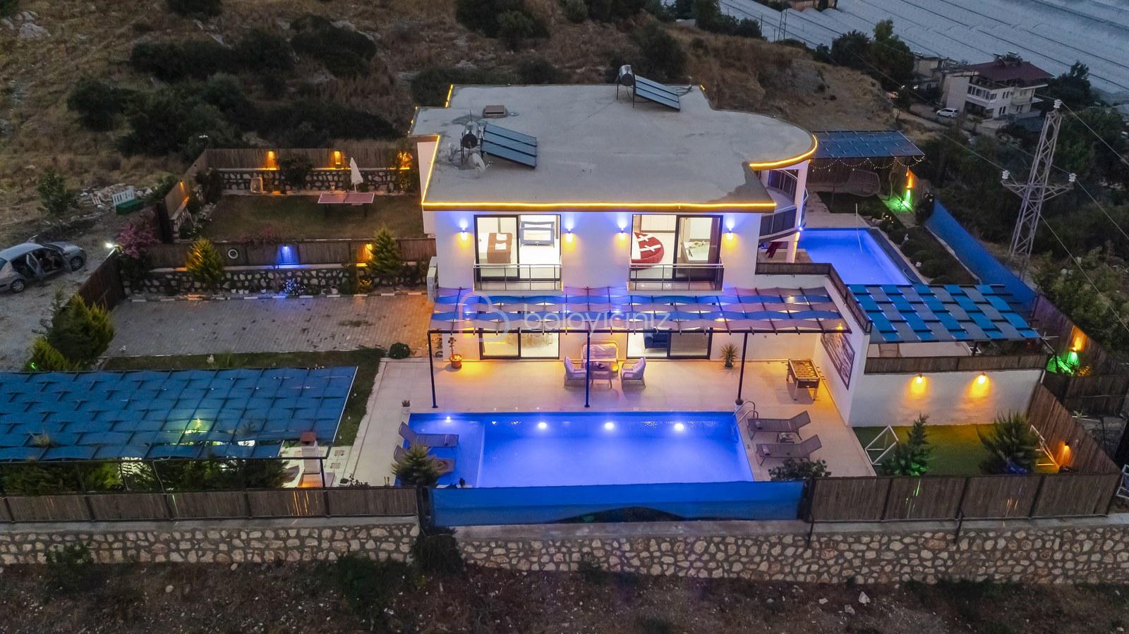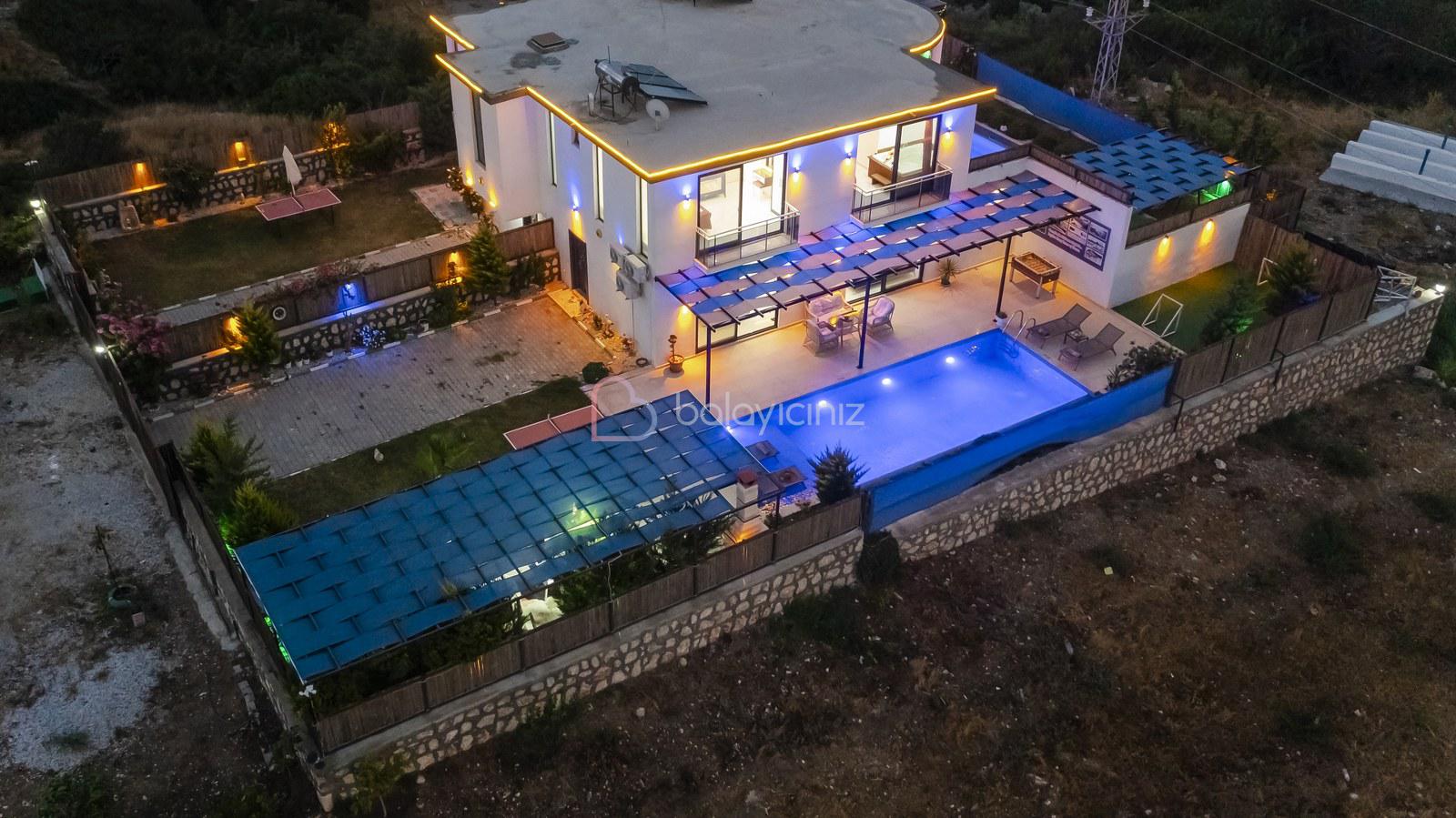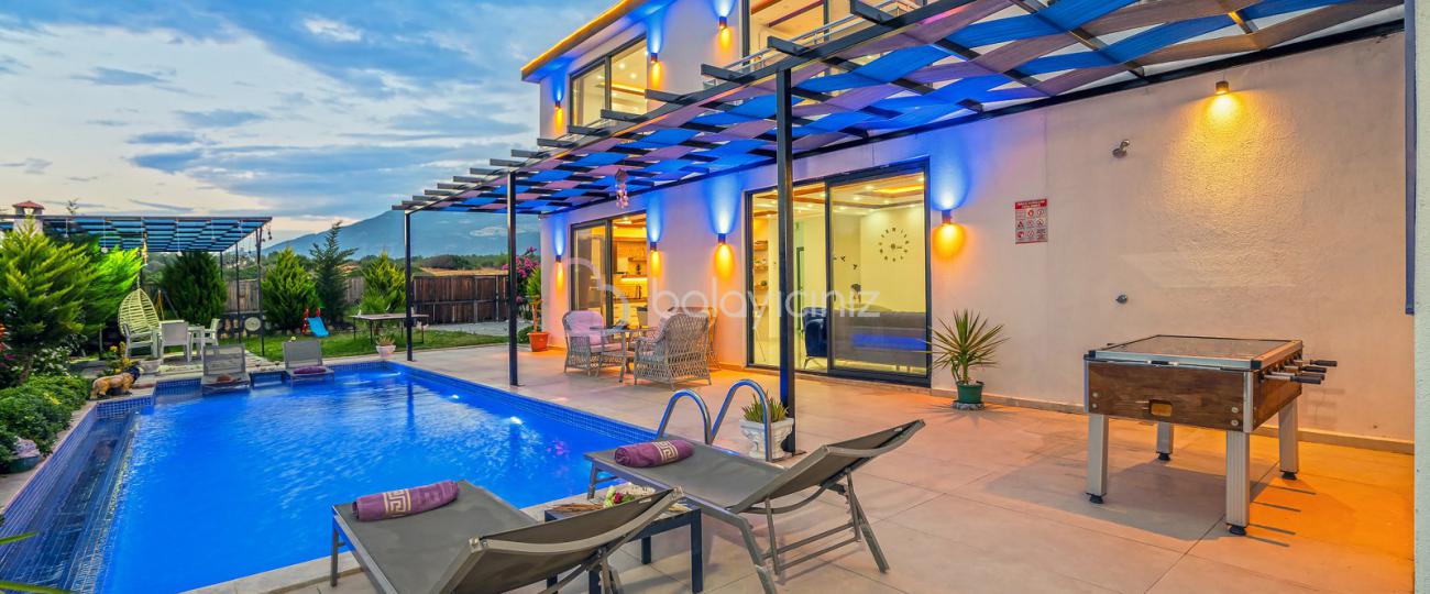 Villa Aksoy Kınık 2 Kalkan Kınık bölgesinde konumlanmış 2 yatak odalı muhteşem doğa manzaralı korunaklı özel havuzlu ve geniş bahçe alanına sahip tatil villasıdır. Oldukça modern ve şık dekore edilmiş olan villamızda eğlenceli vakitler geçirebileceğiniz masa tenisi, langırt bulunmaktadır. Ayrıca çocuklar içinde oyun parkı ve mini kale bulunmaktadır. Havuz terasında bulunan perdeleme sistemi ile korunaklı hale gelen villamız, muhafazakar çekirdek aileler ve balayı çiftlerimiz için uygun bir seçenektir. Ebeveyn yatak odasında bulunan jakuzisi ile bütün yılın stresini, yorgunluğunu üzerinizden atabilirsiniz. Villamız dünyaca ünlü Saklıkent Kanyonuna 15 km mesafede olup Patara Plajına 10 km mesafededir. Villamızda siz değerli misafirlerimizin ihtiyacı olan her şey düşünülerek dekore edilmiştir.