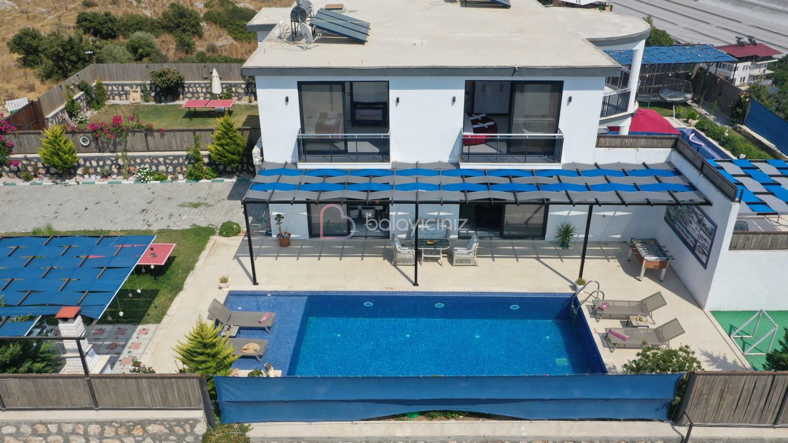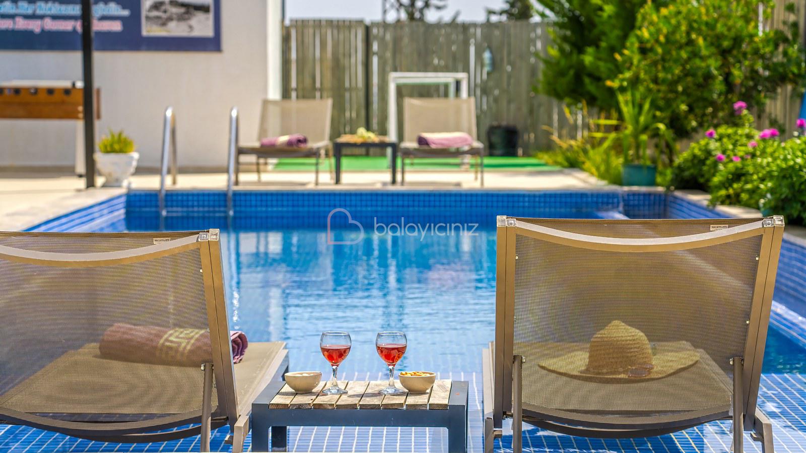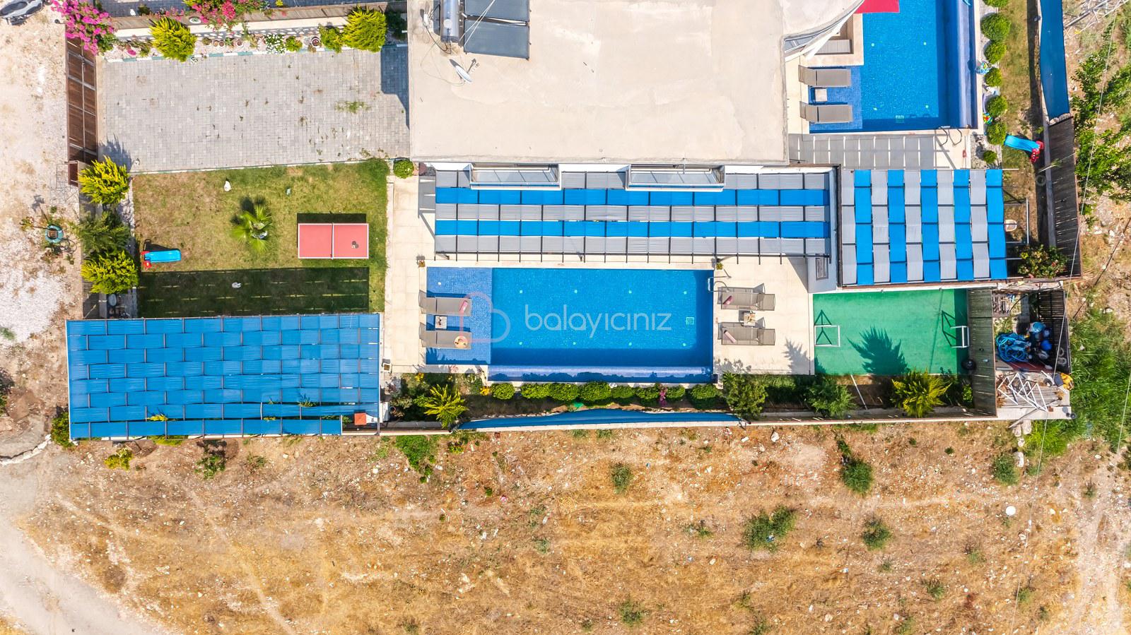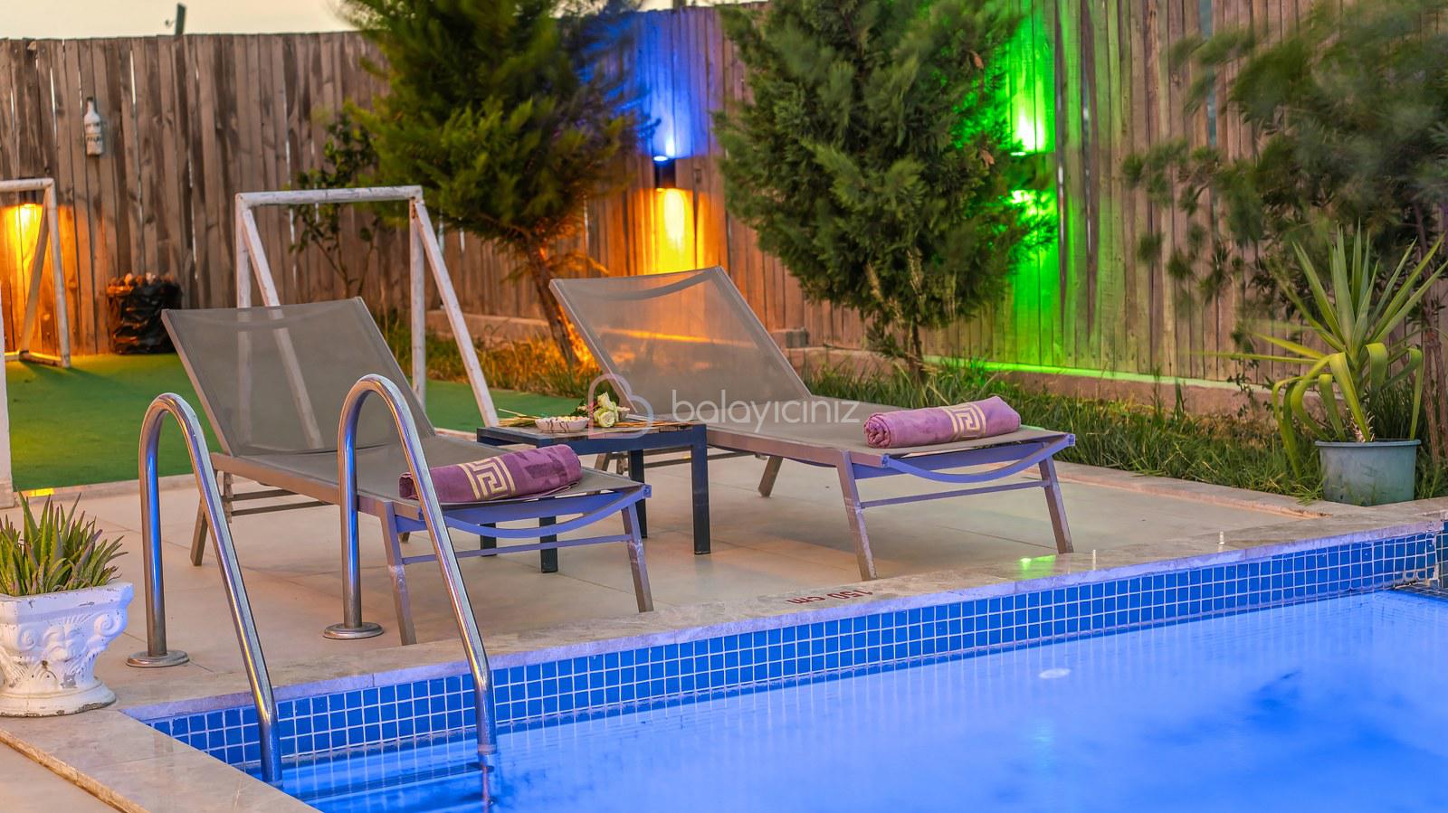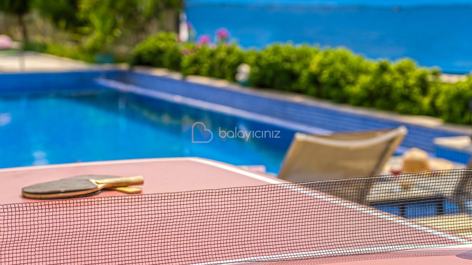 Havuz terasında; Özel korunaklı yüzme havuzu, masa tenisi, şezlong, şemsiye, salıncak, bahçe oturma grubu, çocuk oyun parkı, mini kale, barbekü bulunmaktadır.