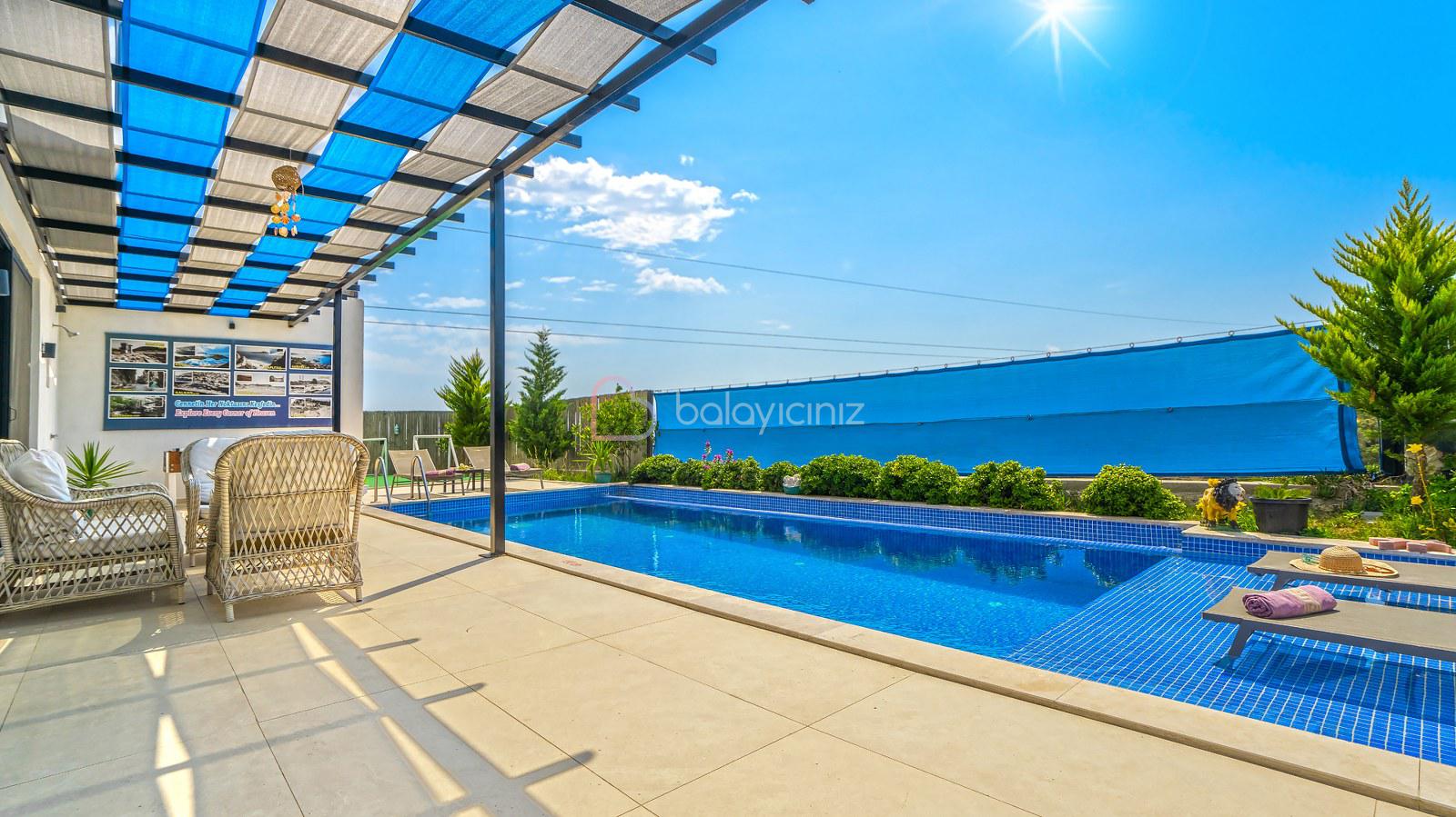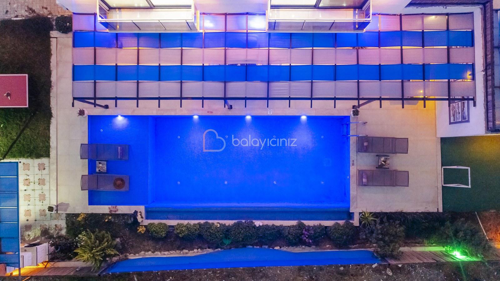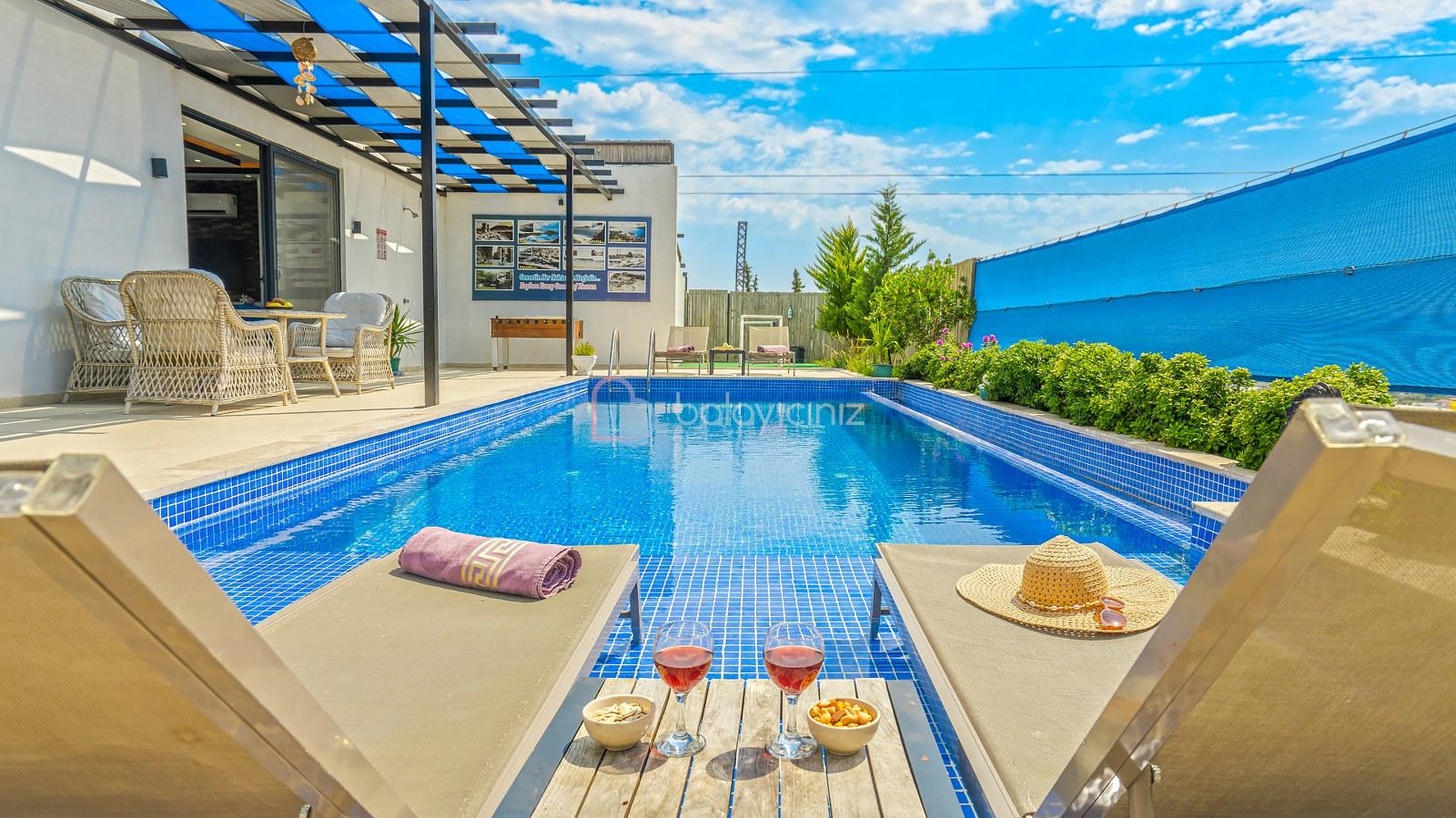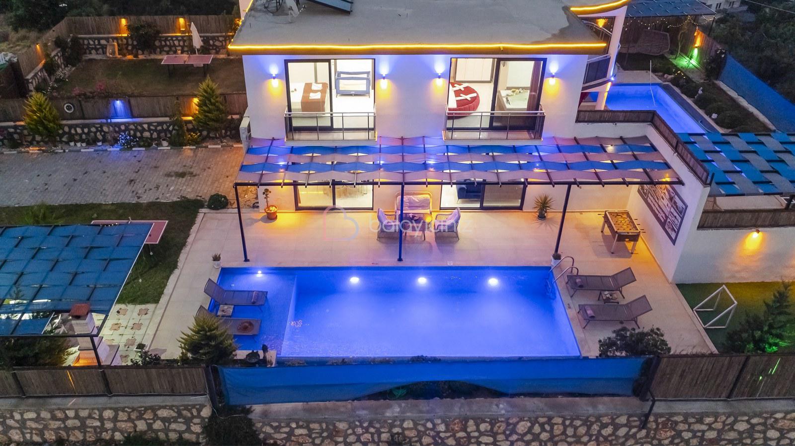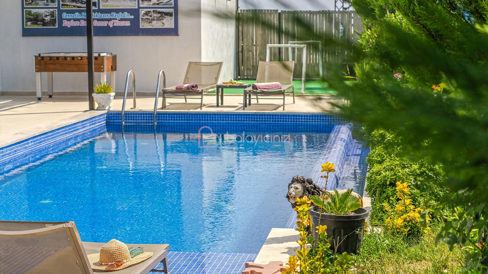 Havuz terasında; Özel korunaklı yüzme havuzu, masa tenisi, şezlong, şemsiye, salıncak, bahçe oturma grubu, çocuk oyun parkı, mini kale, barbekü bulunmaktadır.