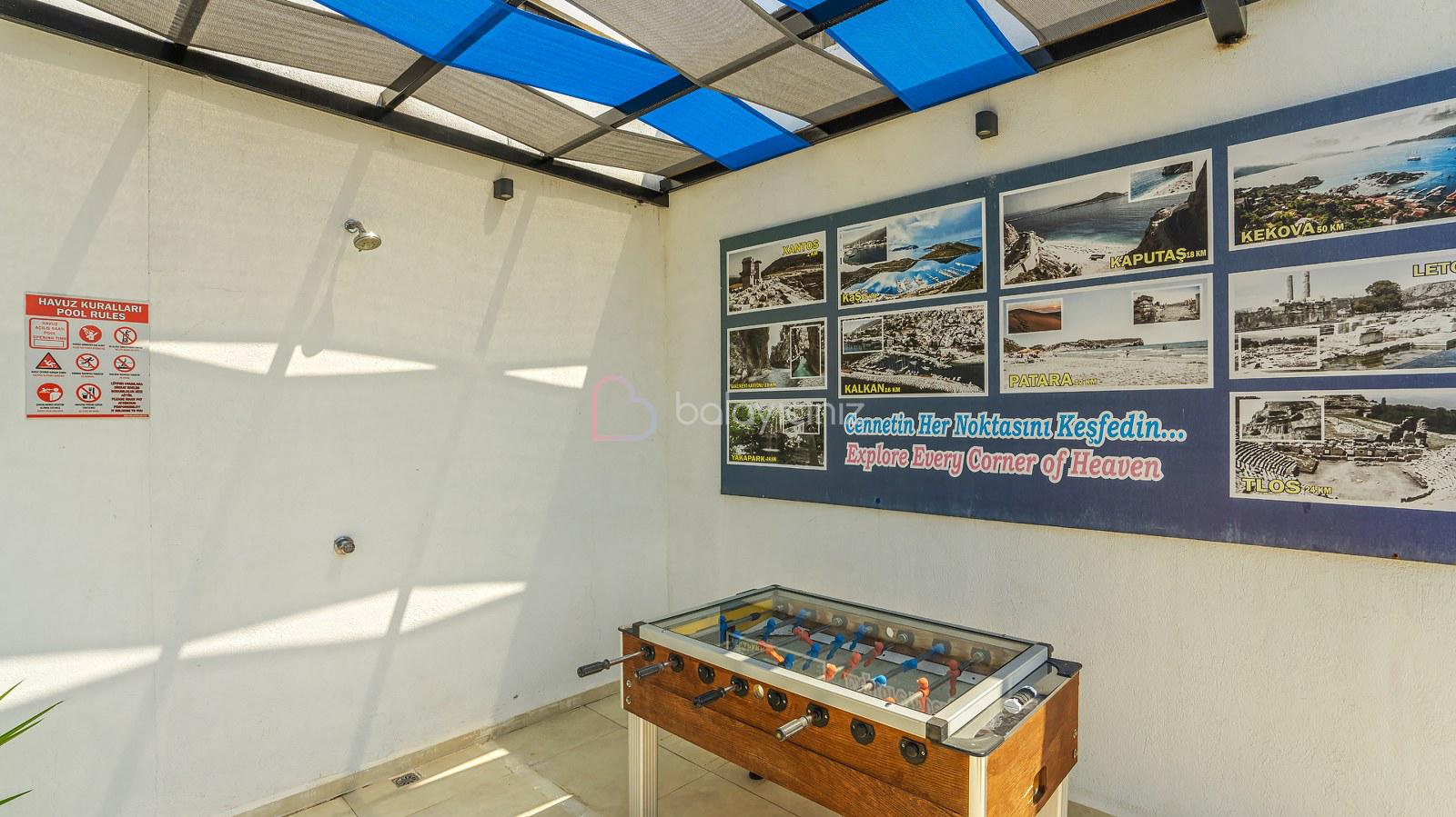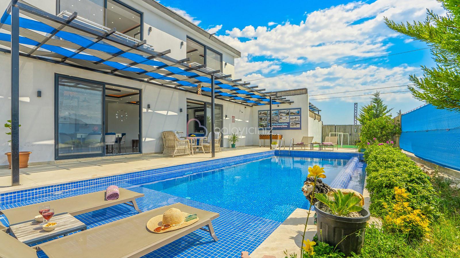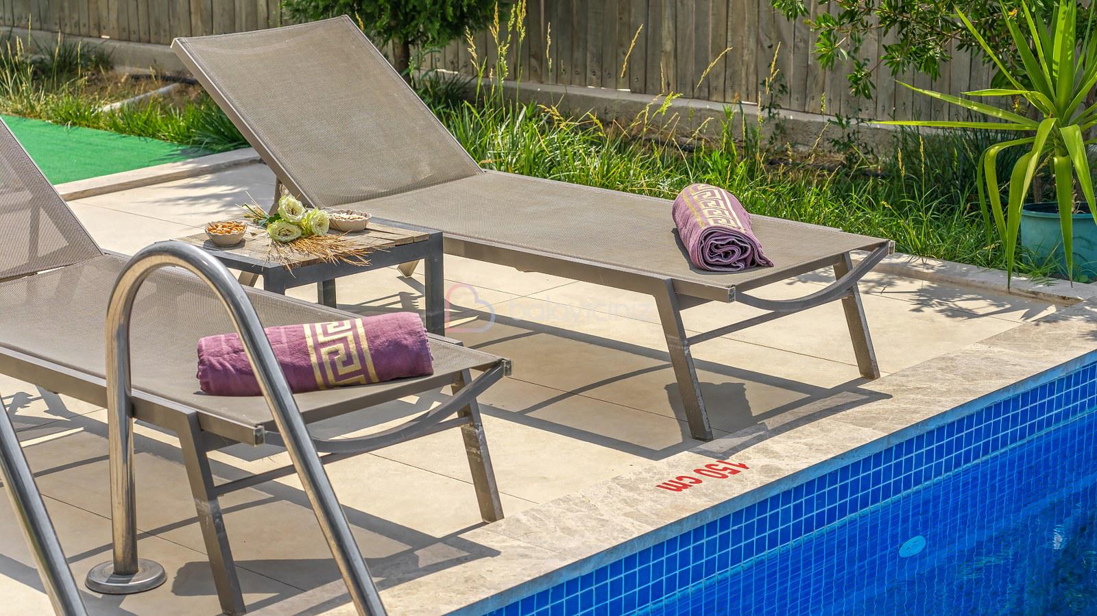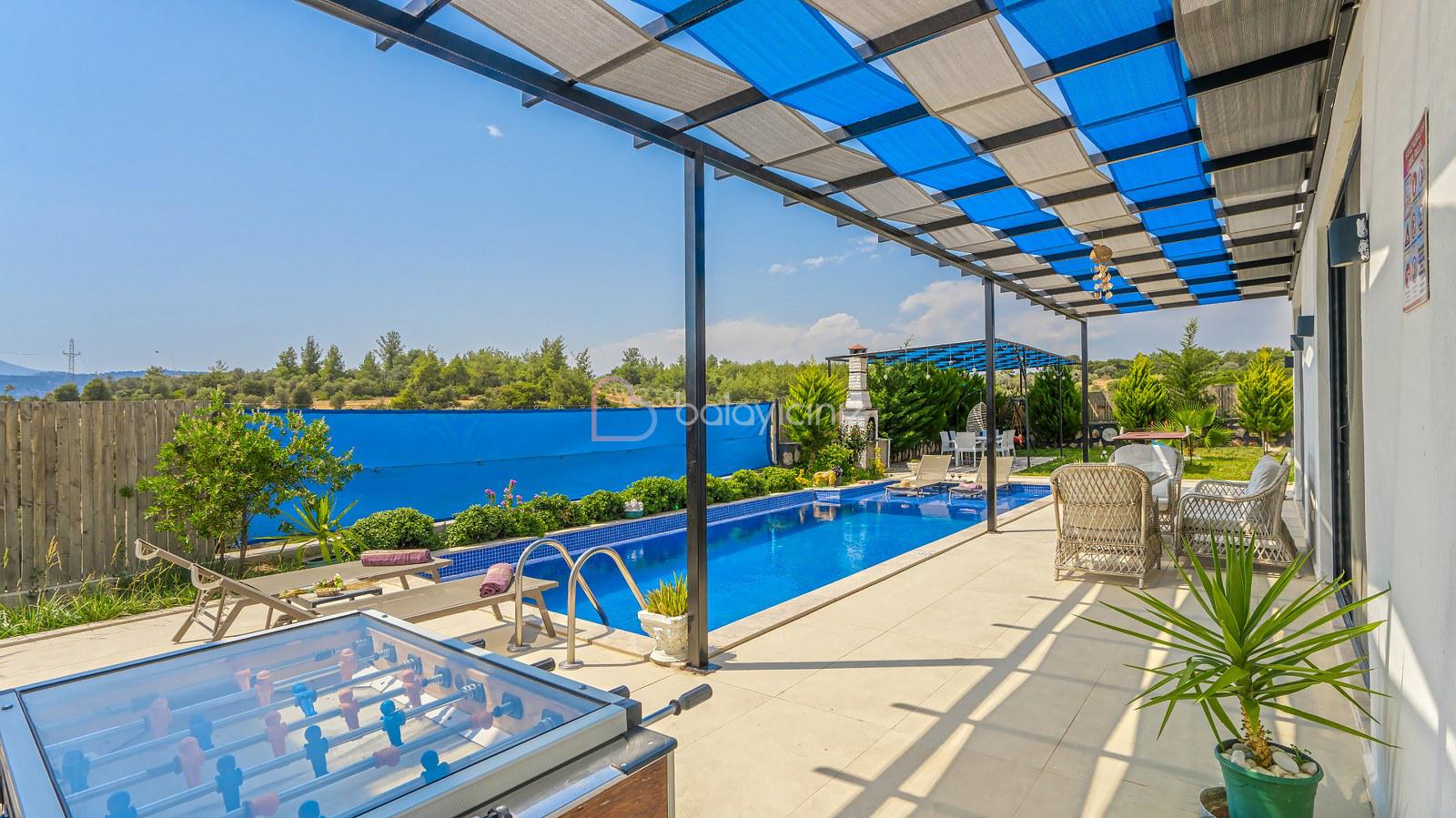 Havuz terasında; Özel korunaklı yüzme havuzu, masa tenisi, şezlong, şemsiye, salıncak, bahçe oturma grubu, çocuk oyun parkı, mini kale, barbekü bulunmaktadır.