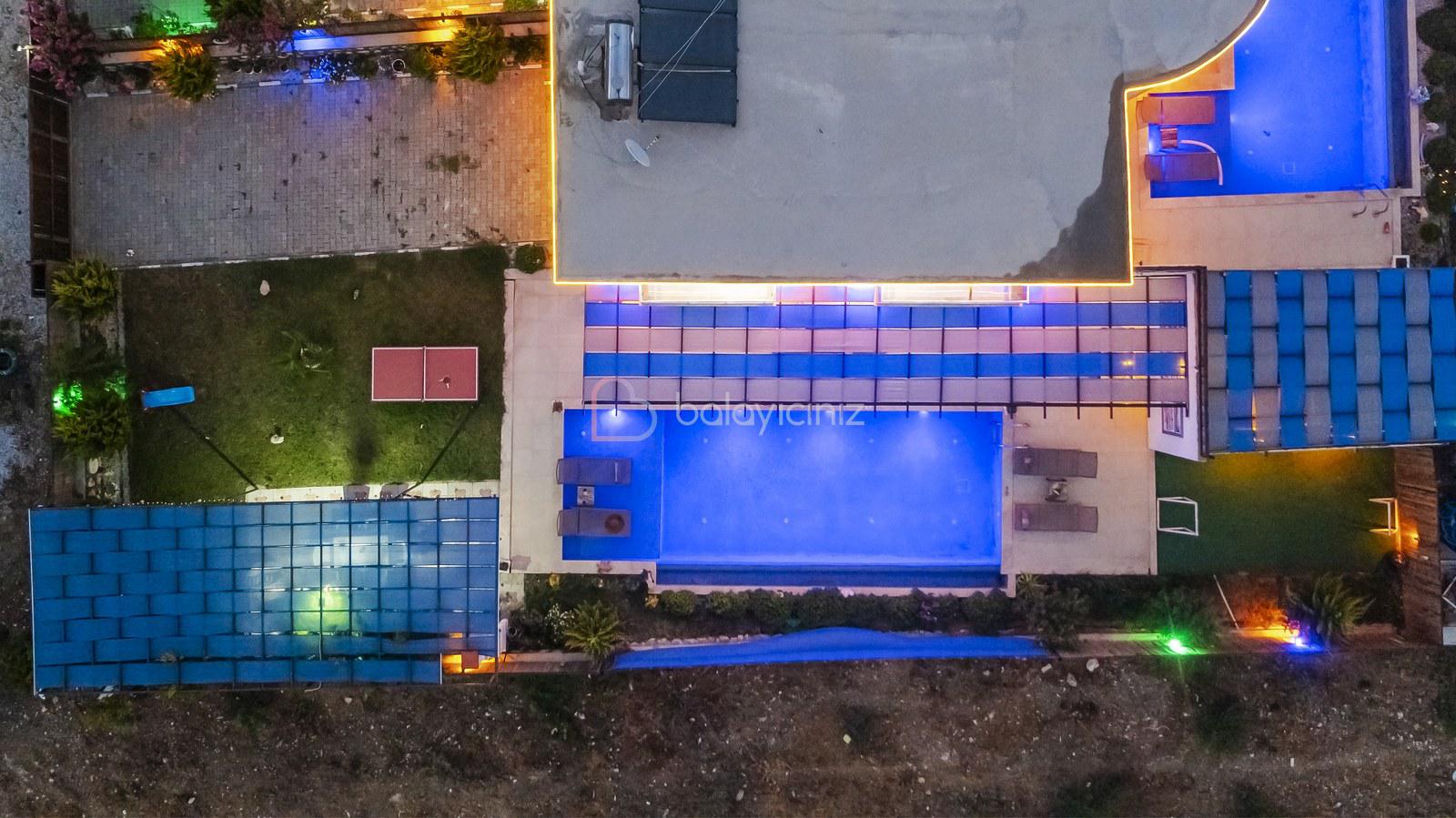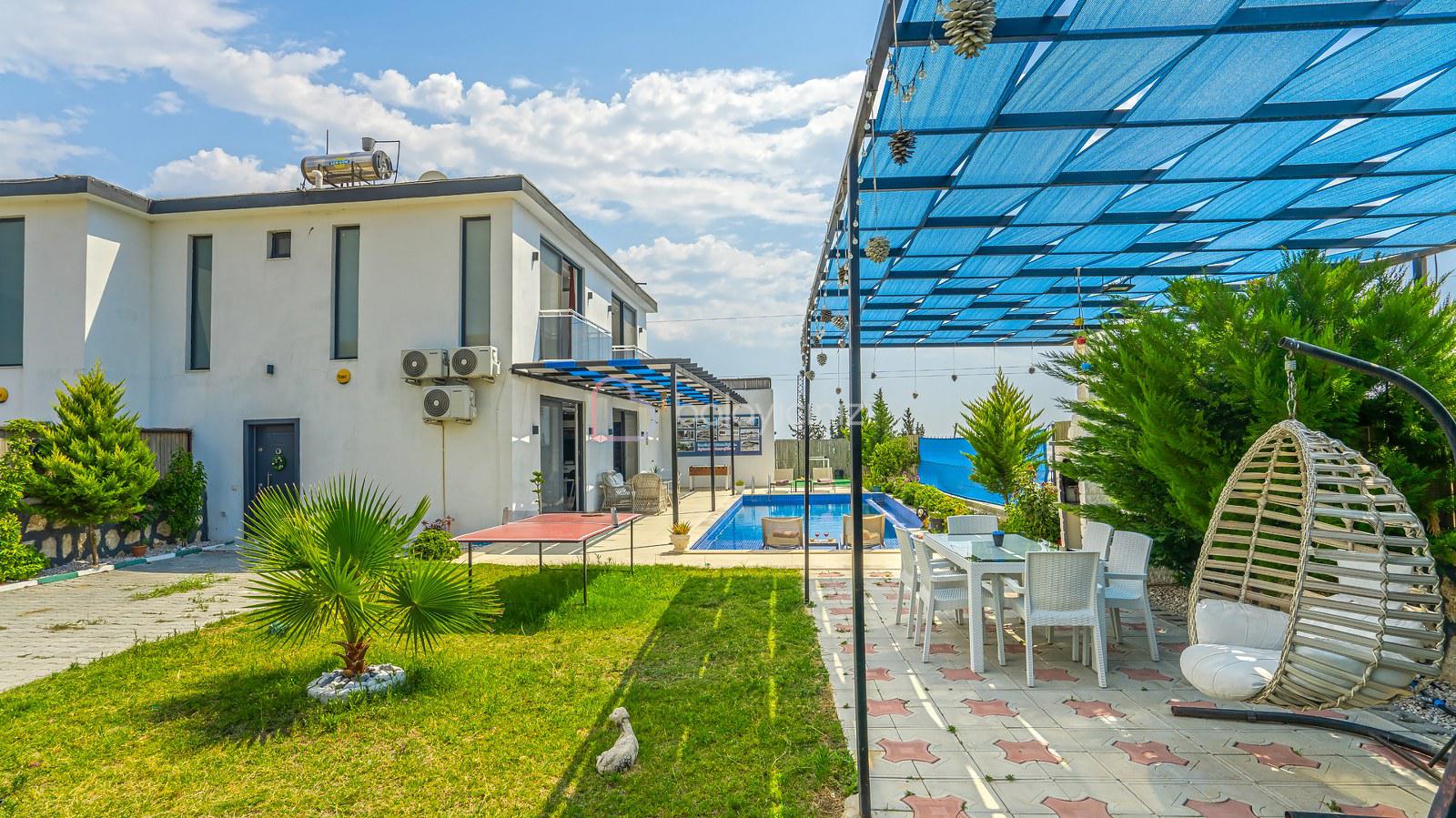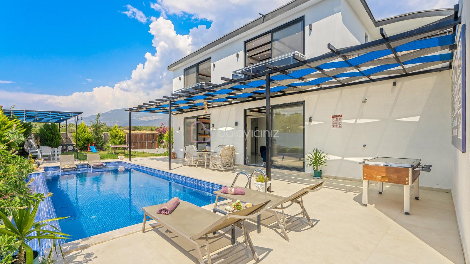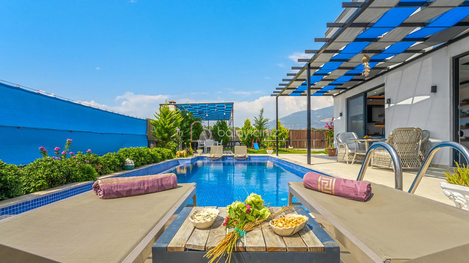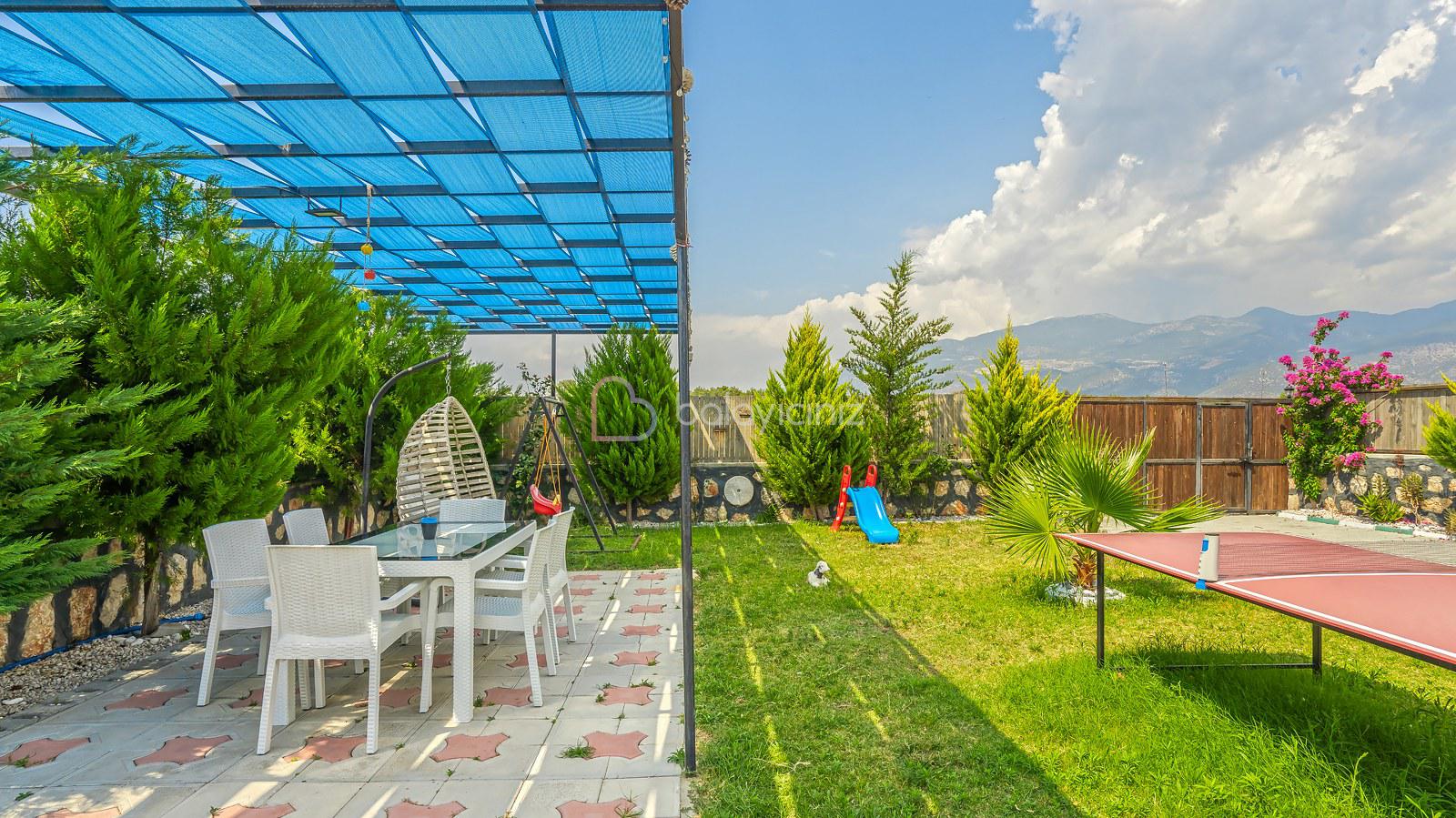 Havuz terasında; Özel korunaklı yüzme havuzu, masa tenisi, şezlong, şemsiye, salıncak, bahçe oturma grubu, çocuk oyun parkı, mini kale, barbekü bulunmaktadır.