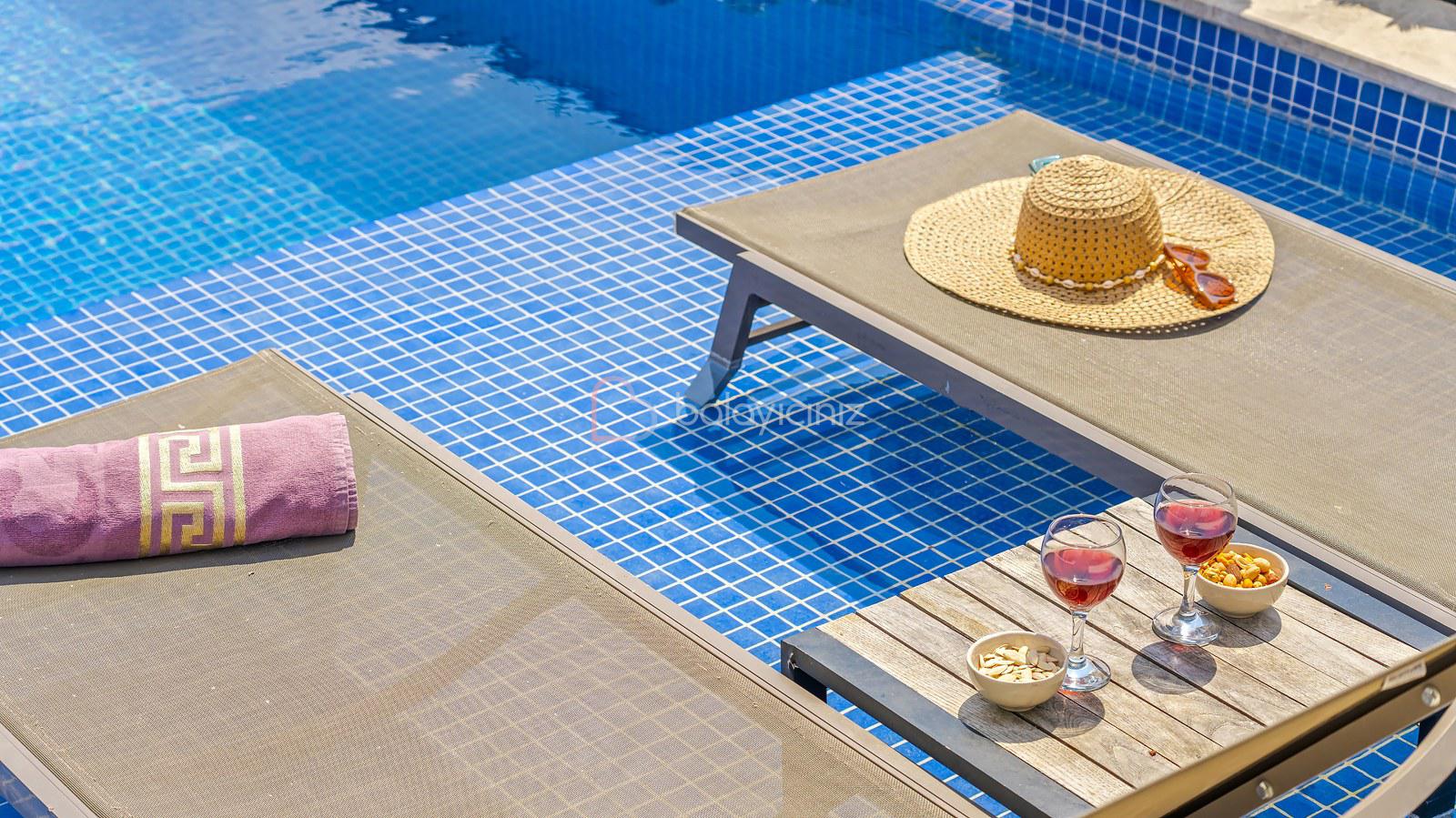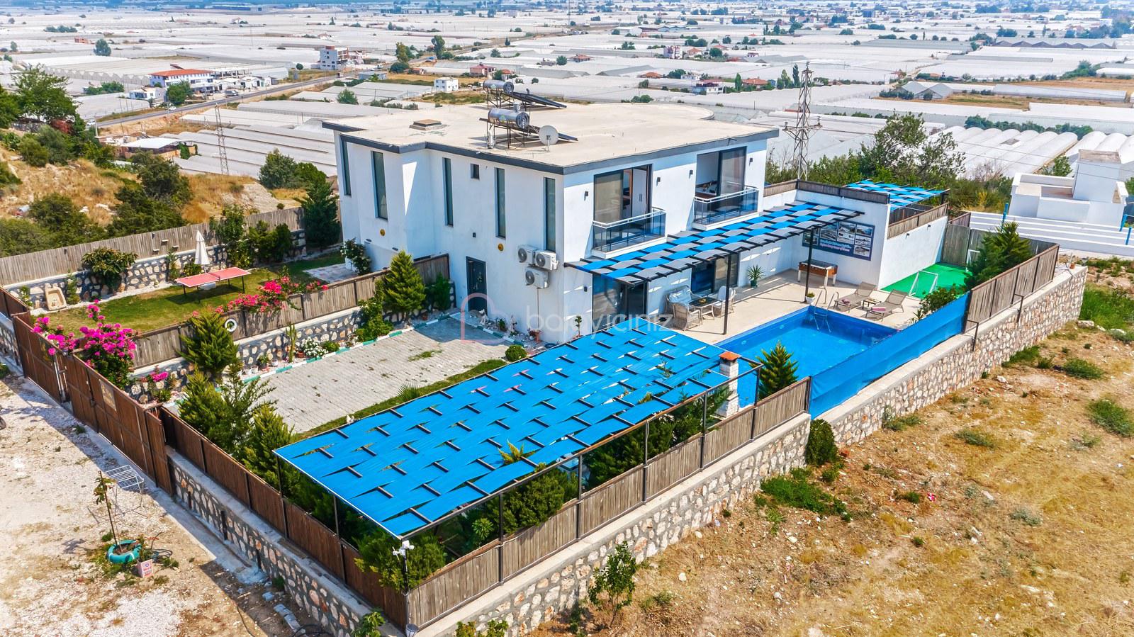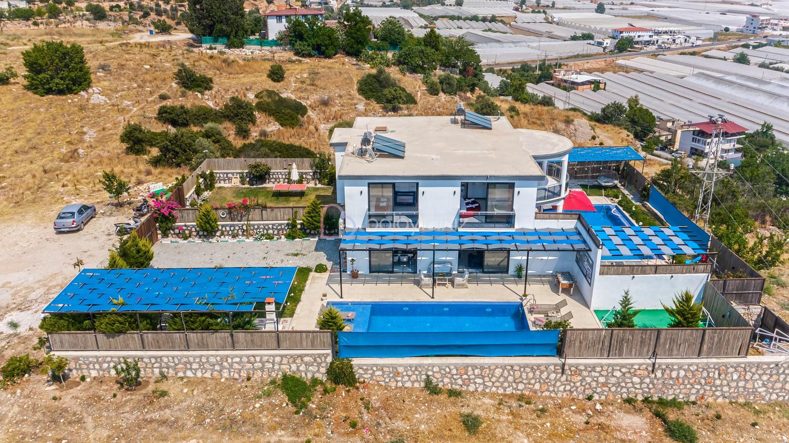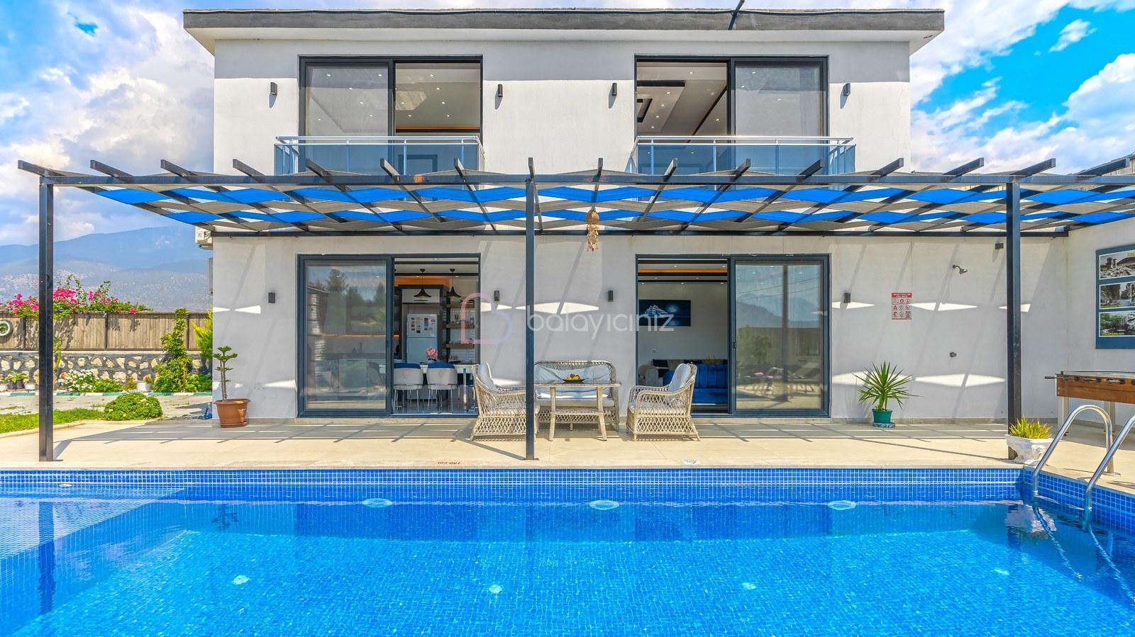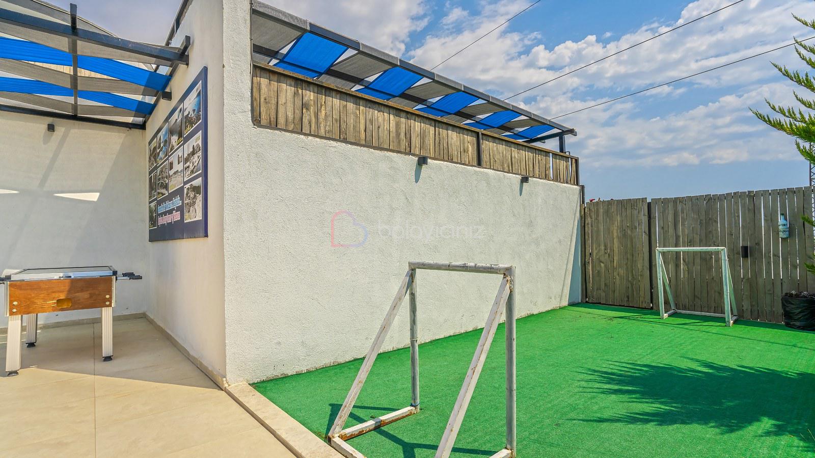 Havuz terasında; Özel korunaklı yüzme havuzu, masa tenisi, şezlong, şemsiye, salıncak, bahçe oturma grubu, çocuk oyun parkı, mini kale, barbekü bulunmaktadır.