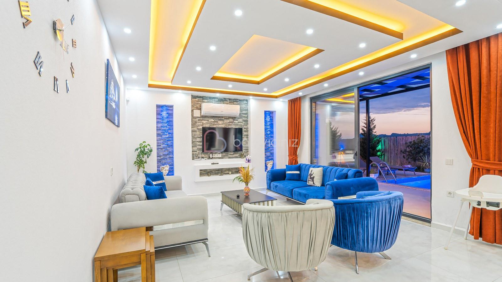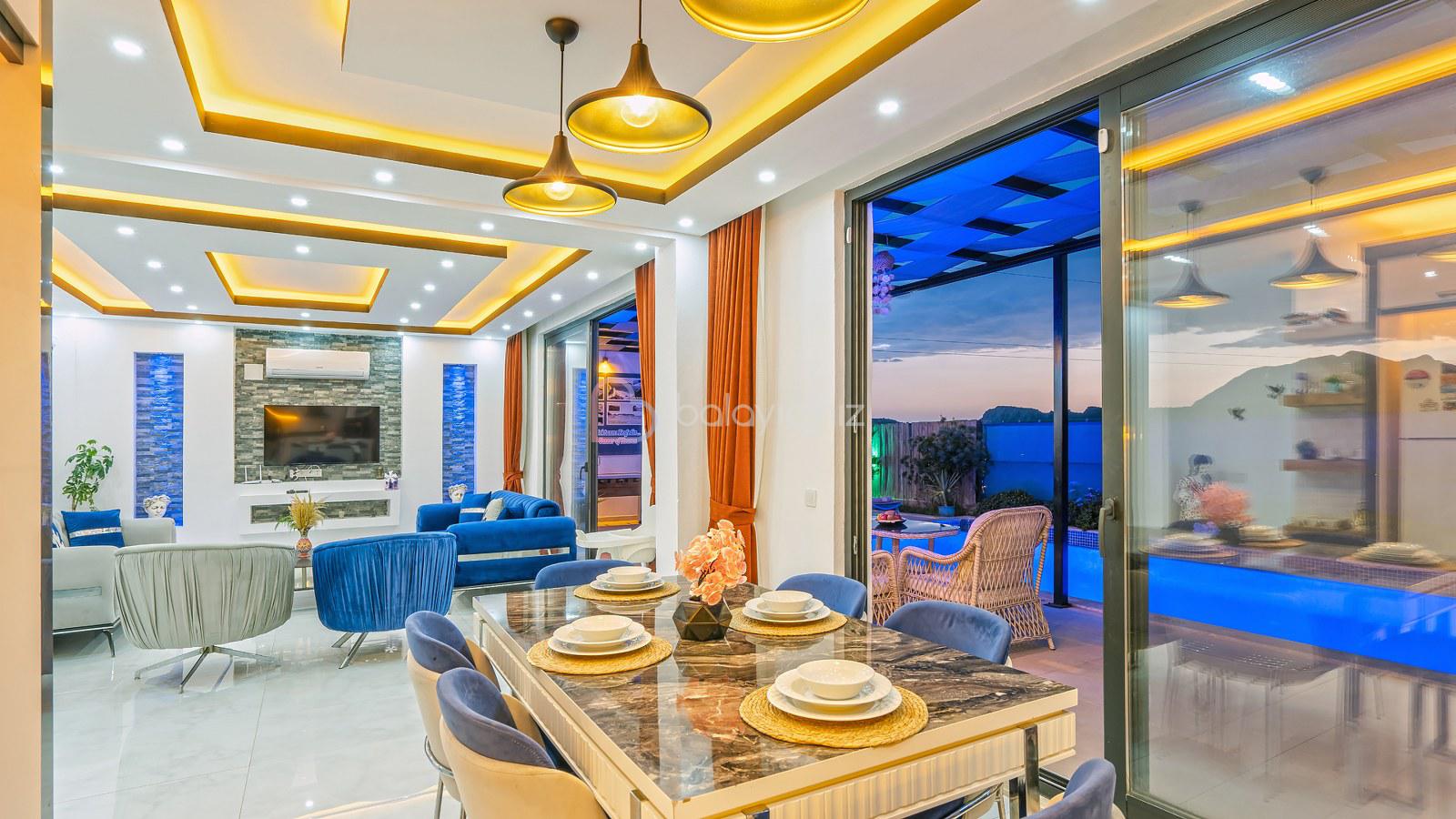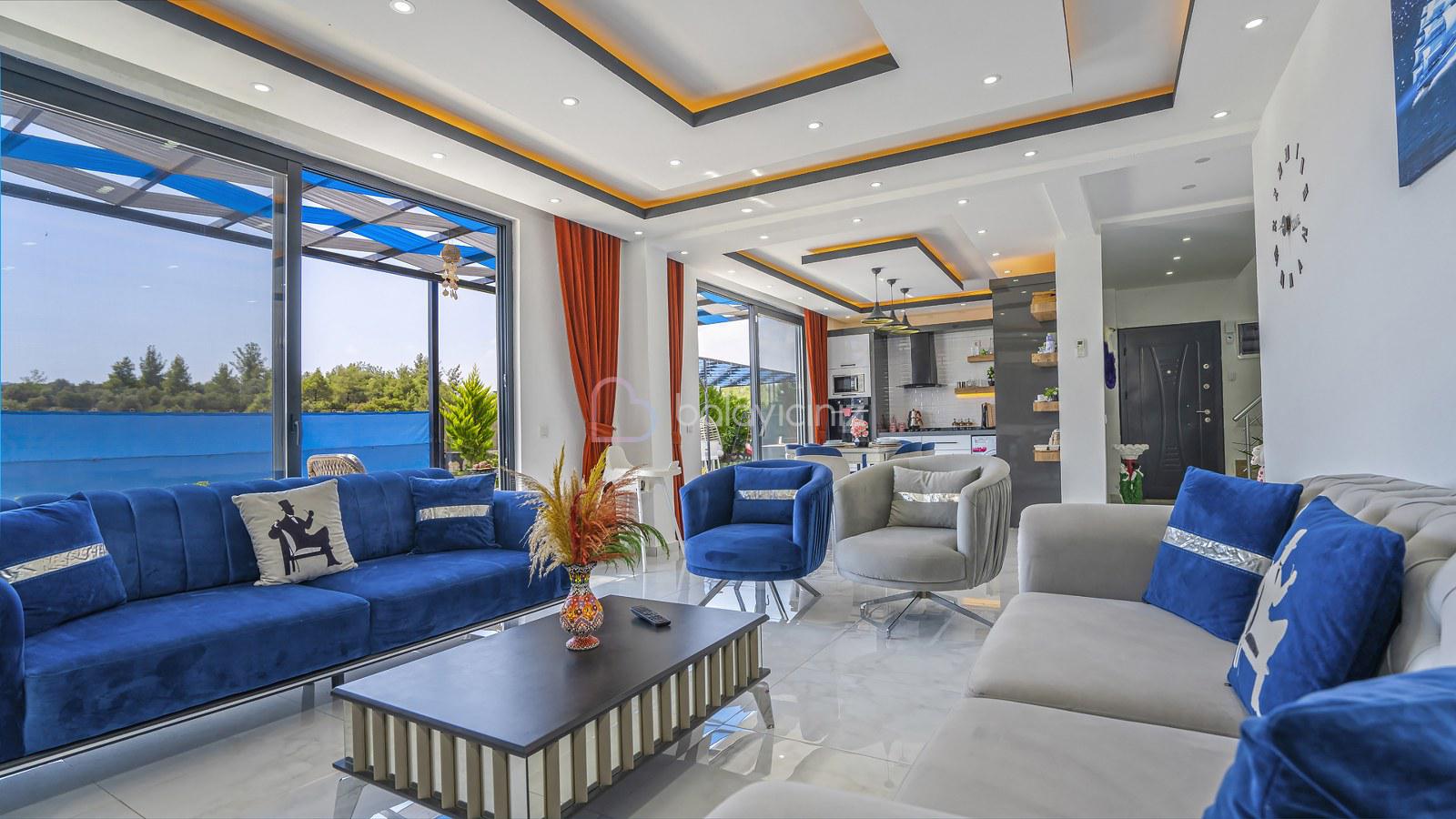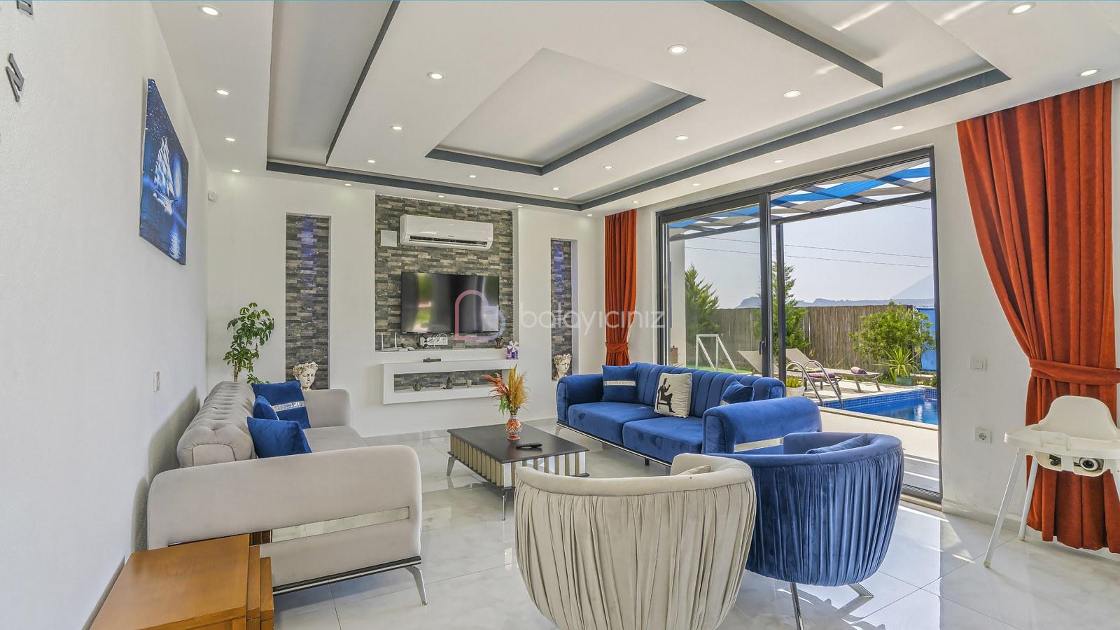 Muhteşem doğa manzaralı salonunda; lüks oturma grubu, uydu alıcı, televizyon, klima, orta sehpa, internet ve havuza çıkış bulunmaktadır.
