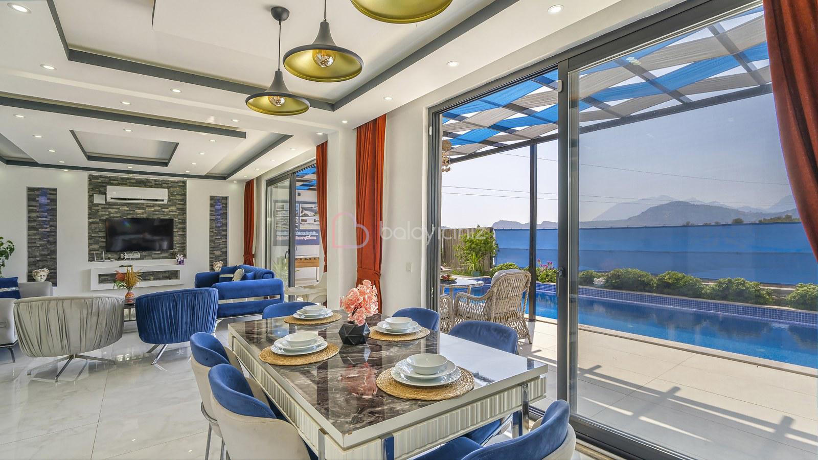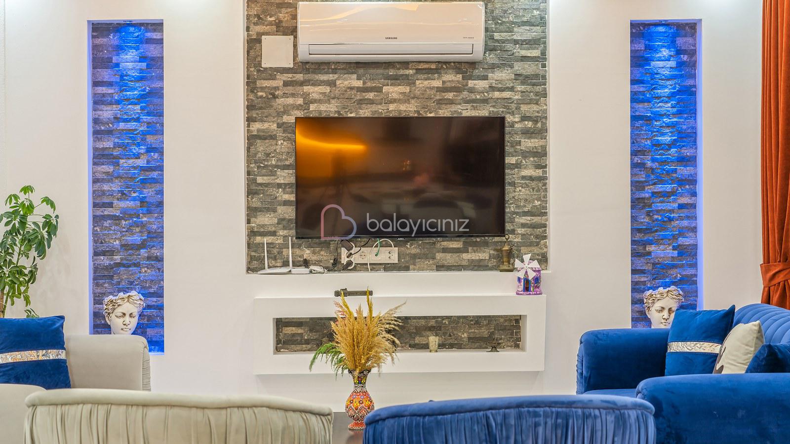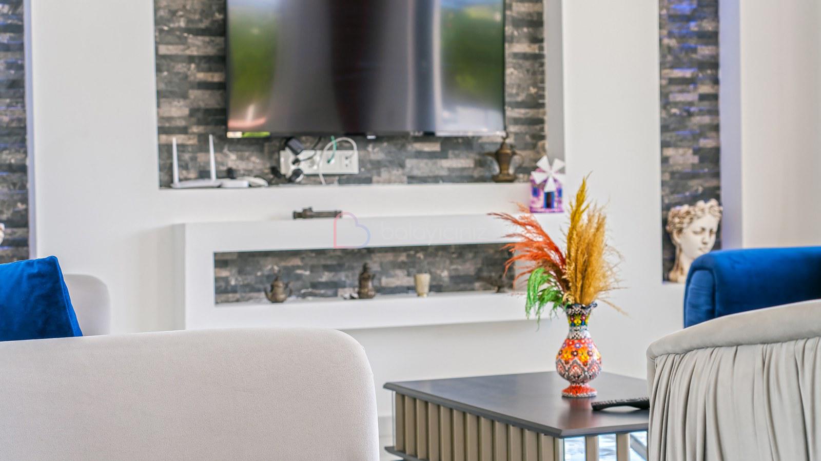 Muhteşem doğa manzaralı salonunda; lüks oturma grubu, uydu alıcı, televizyon, klima, orta sehpa, internet ve havuza çıkış bulunmaktadır.
