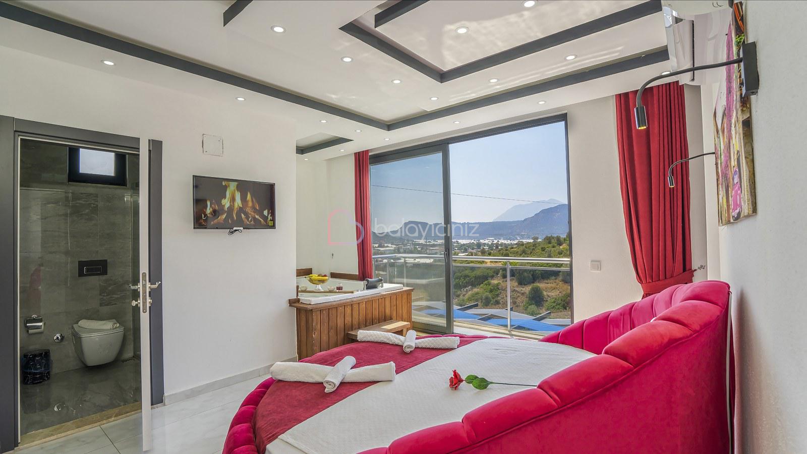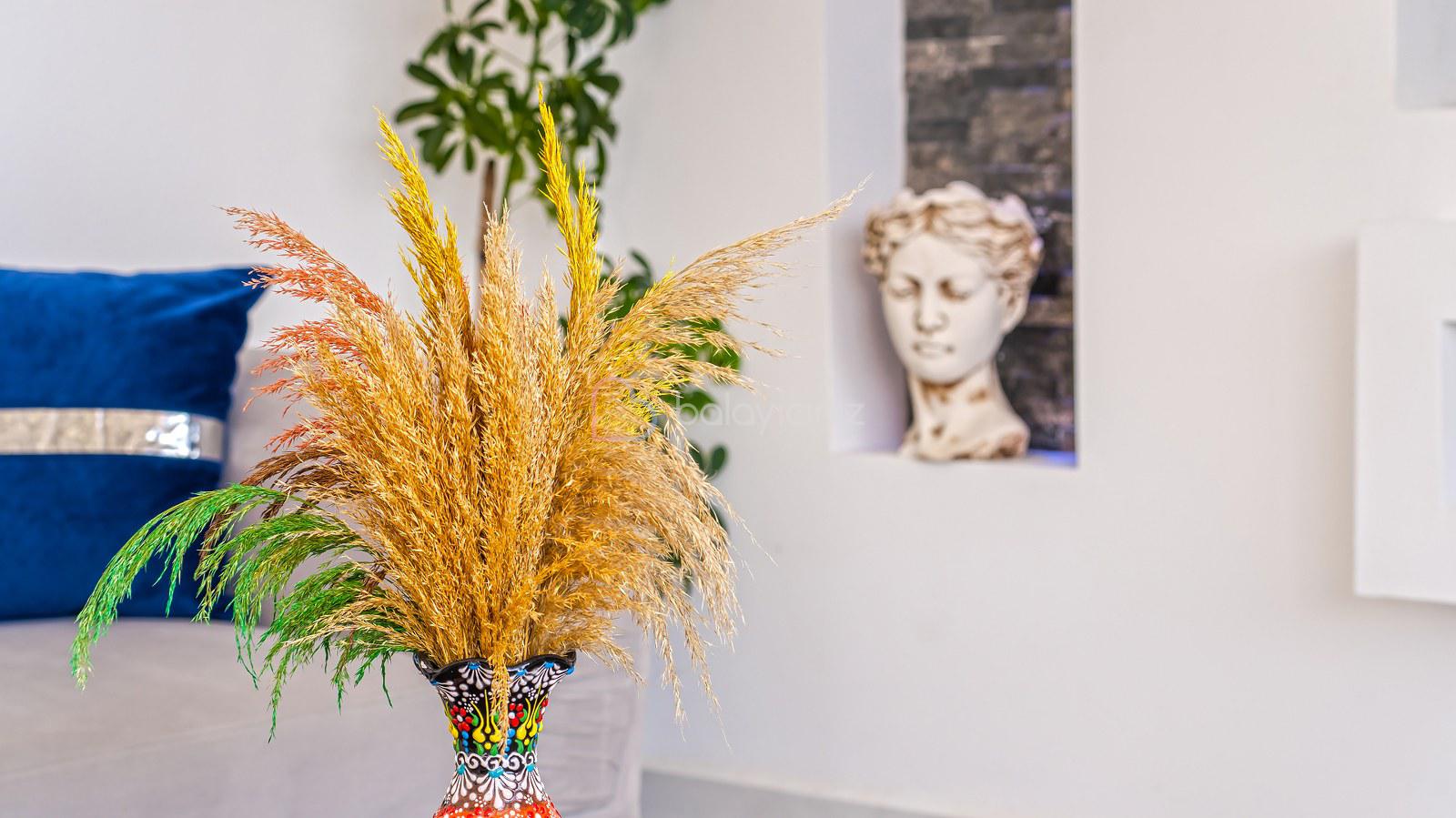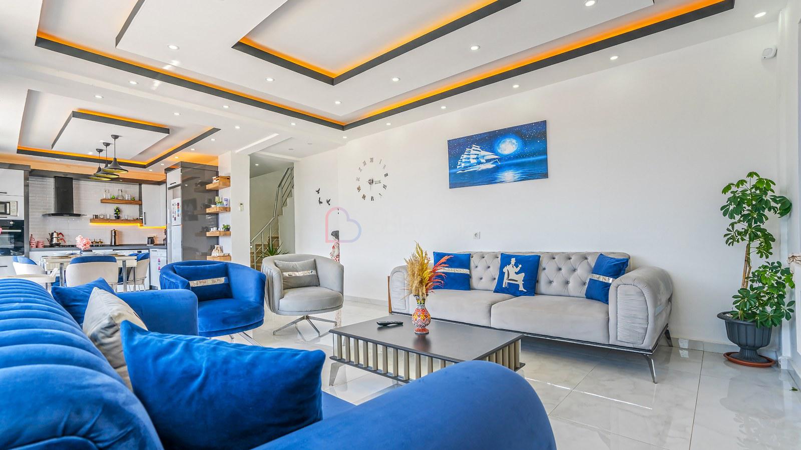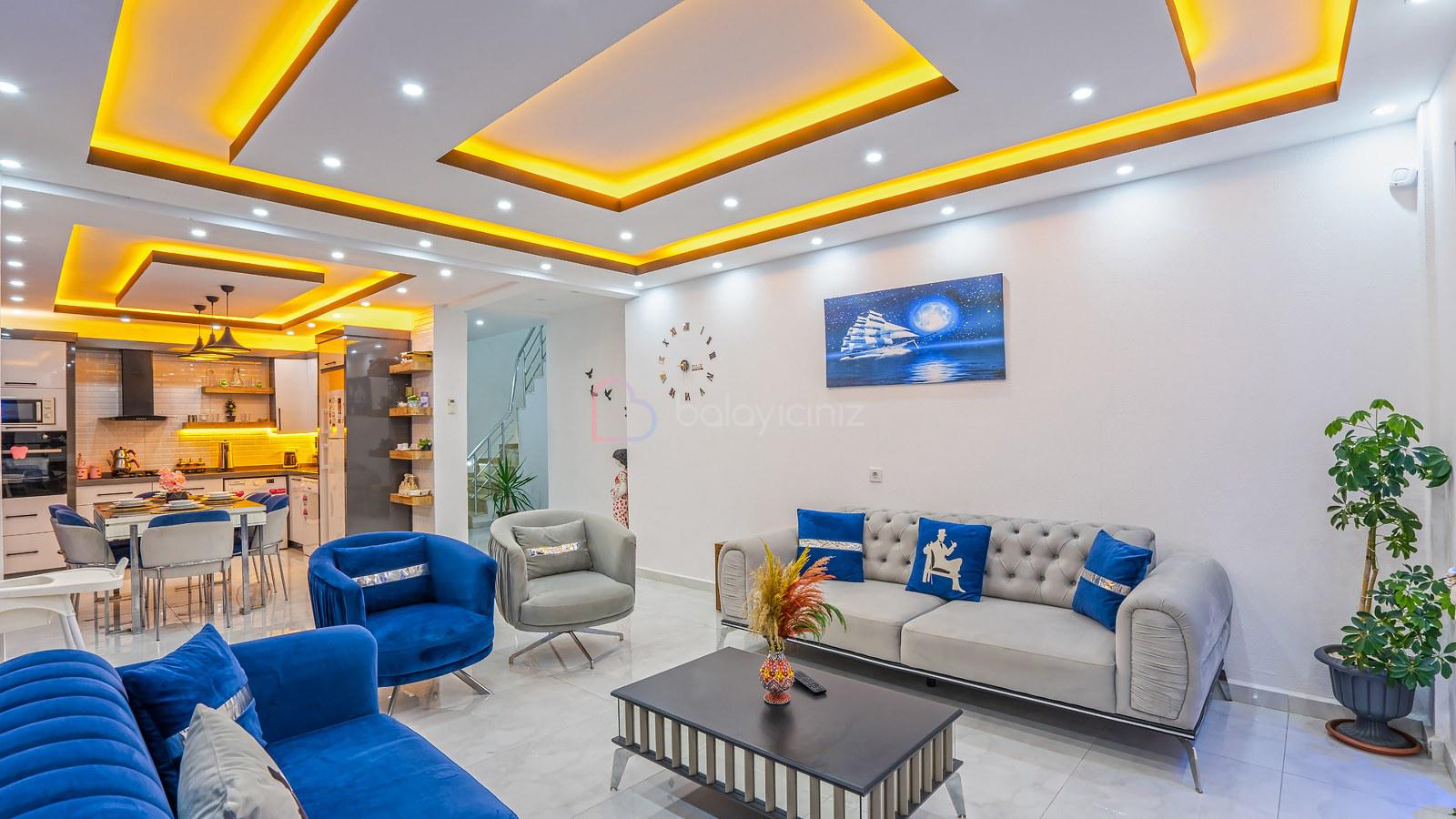 Muhteşem doğa manzaralı salonunda; lüks oturma grubu, uydu alıcı, televizyon, klima, orta sehpa, internet ve havuza çıkış bulunmaktadır.