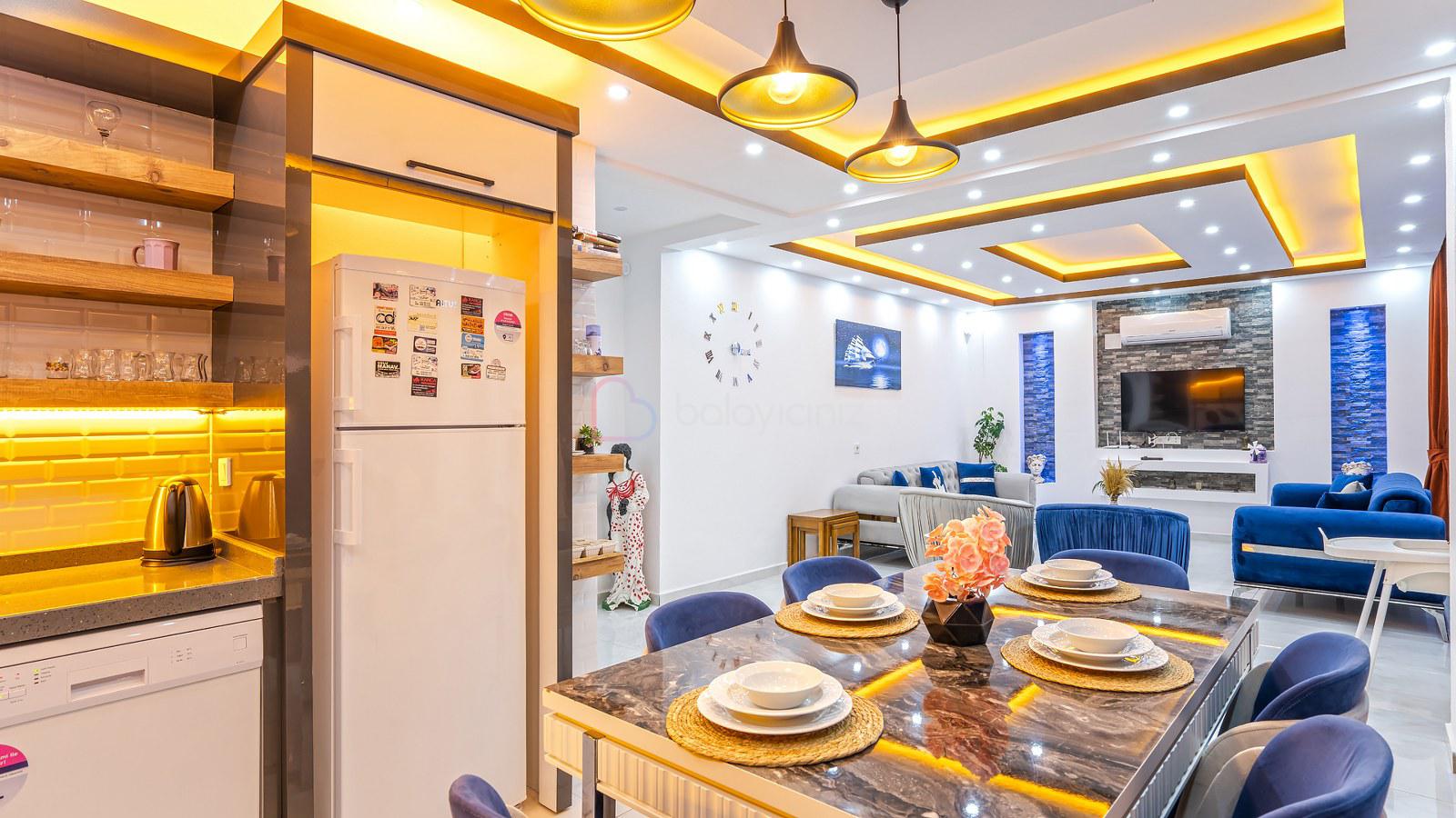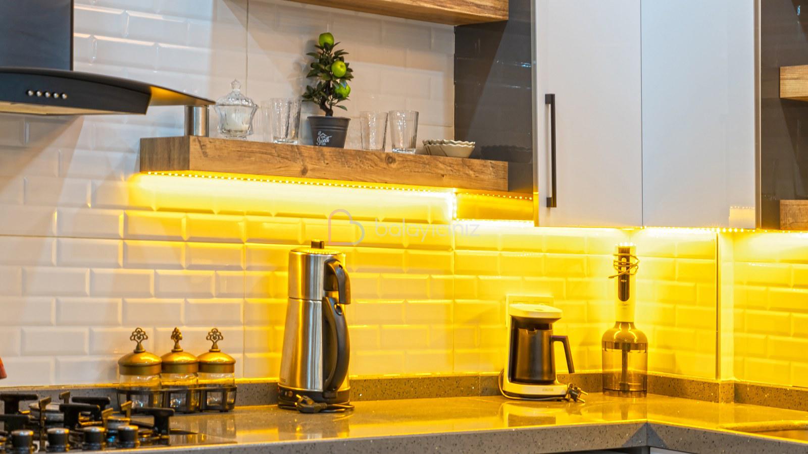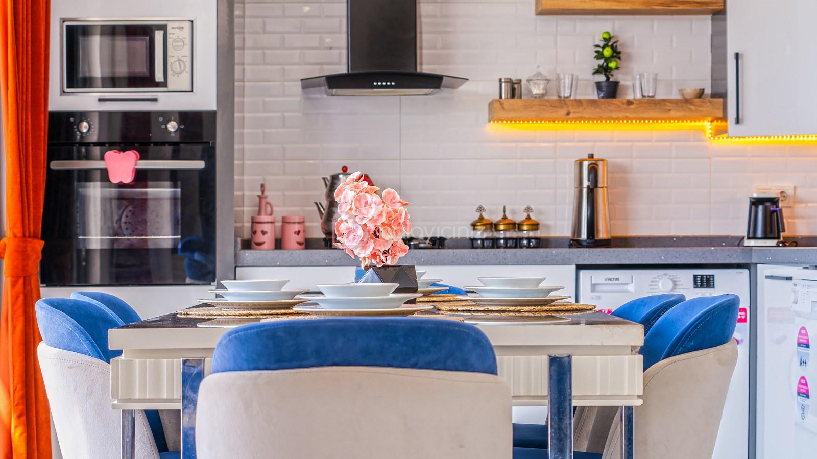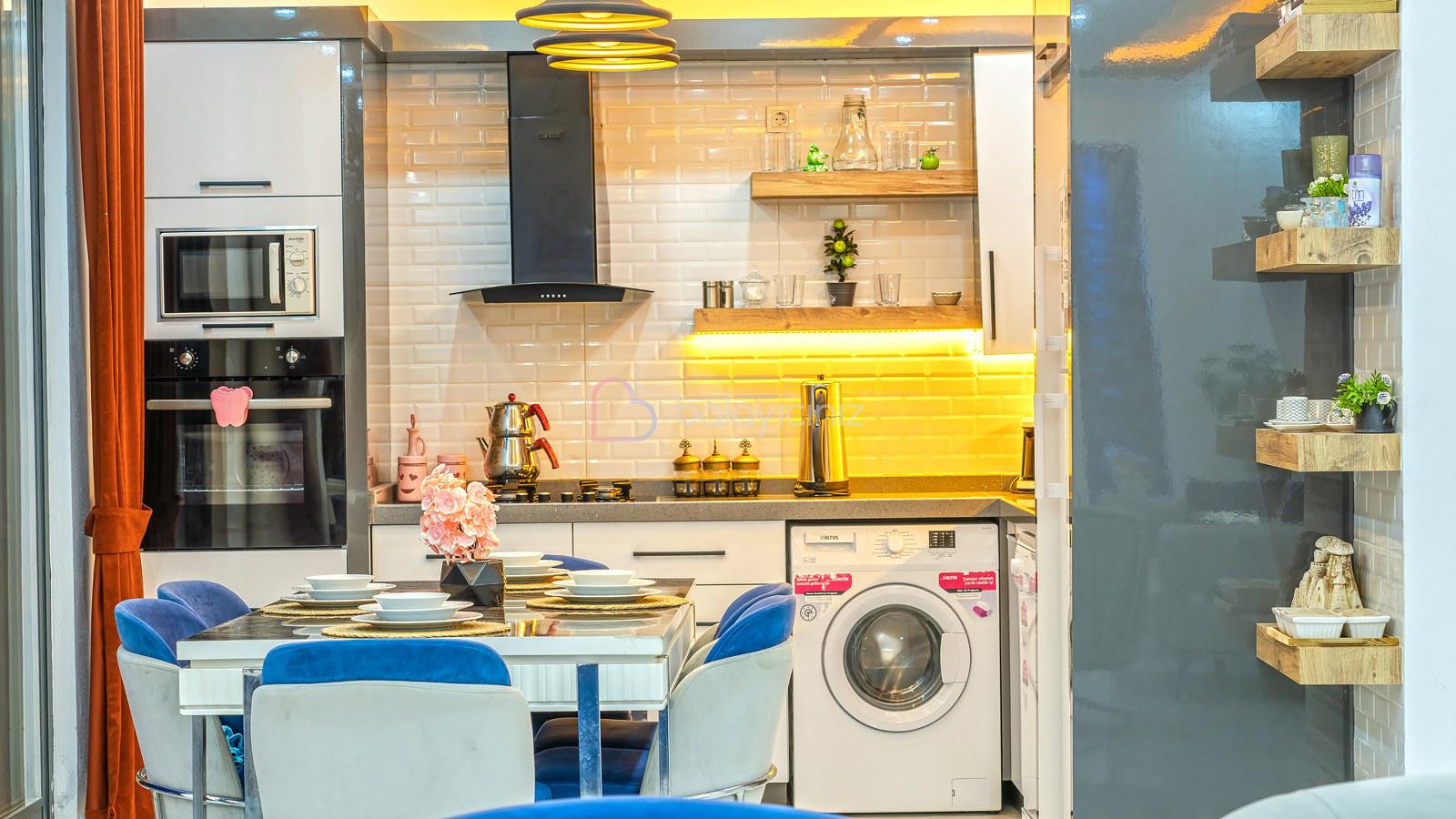 Modern Amerikan mutfak, buzdolabı, bulaşık makinesi, çamaşır makinesi, ankastre fırın, tost makinesi, kahve makinesi, çaycı, mama sandalyesi, yemek masası, ankastre 4’lü ocak, elektrikli su ısıtıcısı(kettle), 4 kişilik yemek takımı, çeşitli mutfak araç gereçleri bulunmaktadır.