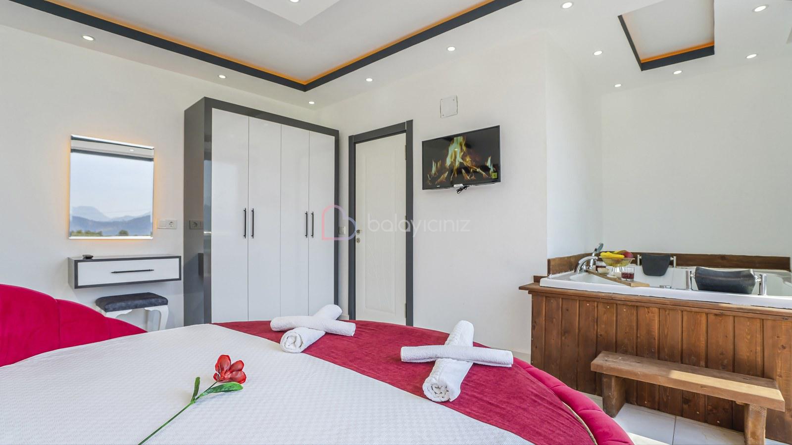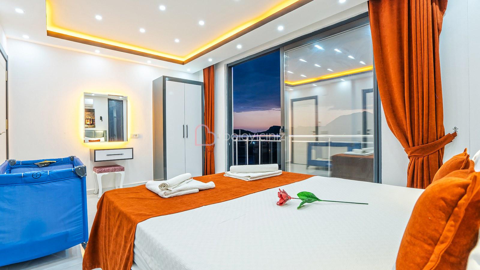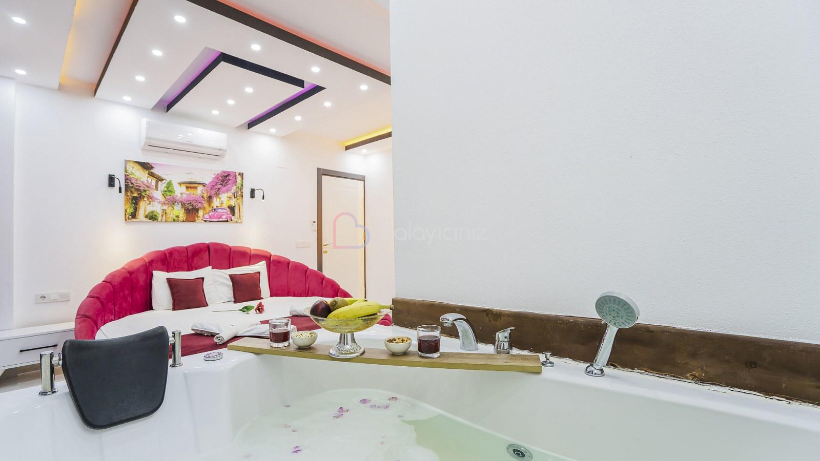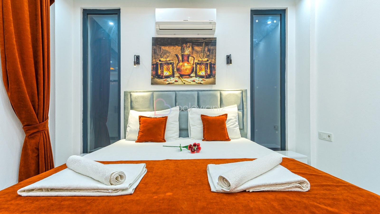 1. Yatak Odası: 1 adet çift kişilik yatak, jakuzi, klima, bebek yatağı, elbise dolabı, komodin, makyaj masası, banyo ve tuvalet bulunmaktadır.
