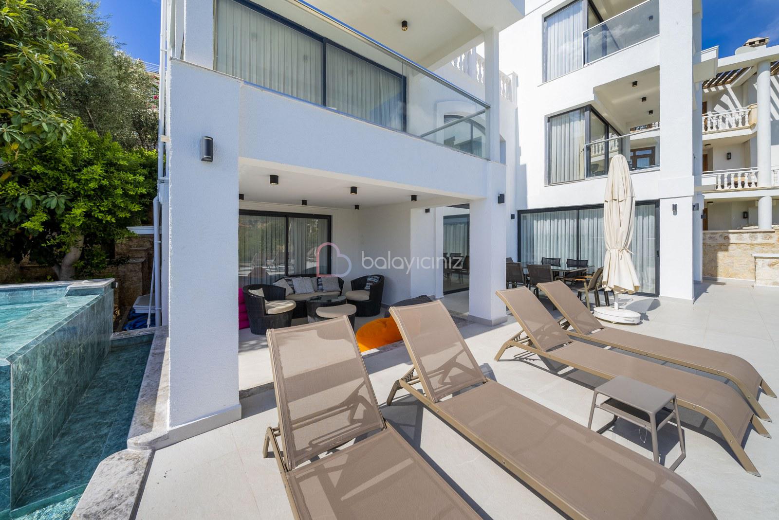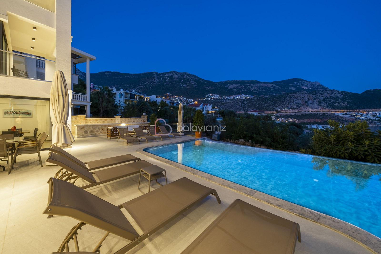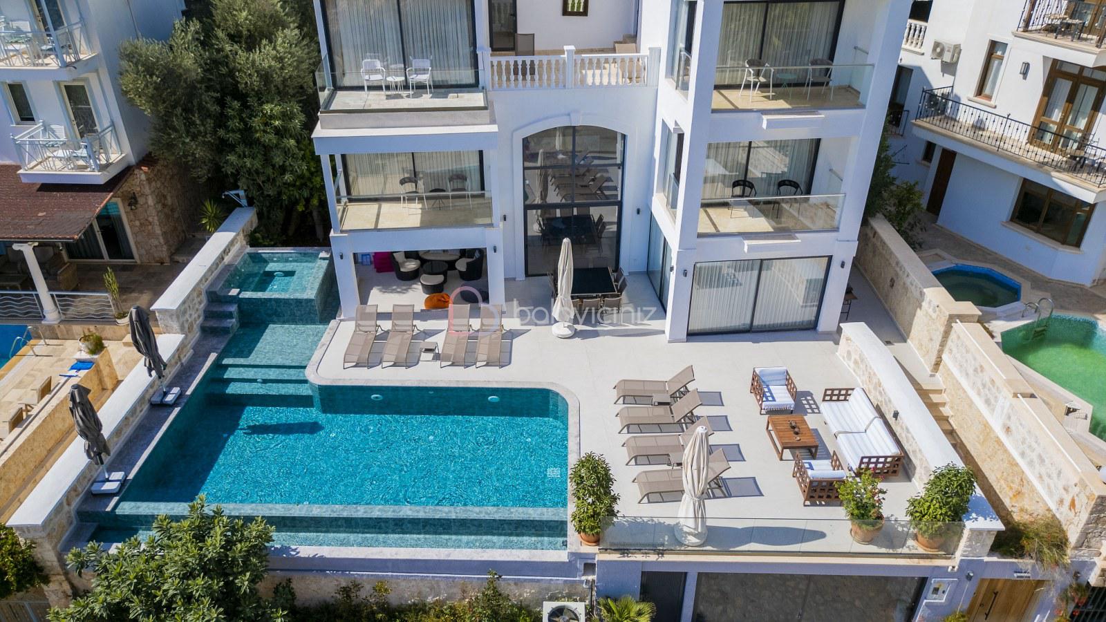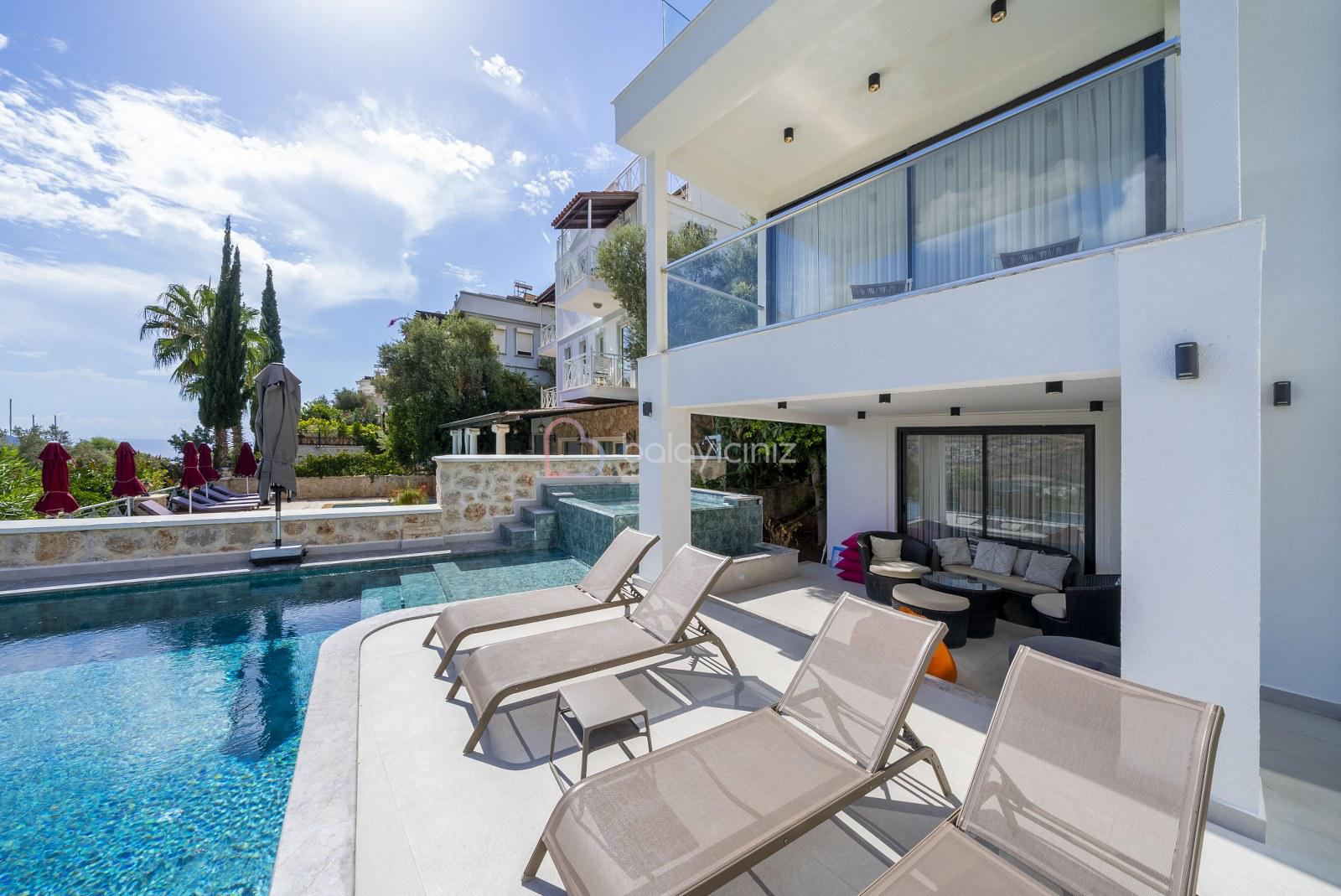 Boy :9 mt. Eni: 4 mt. Derinliği 155 cm. olan deniz manzaralı havuzu bulunmaktadır. Havuz terası şezlong, şemsiye, bahçe mobilyası, salıncak, pergole, mangal, duş bulunmaktadır.