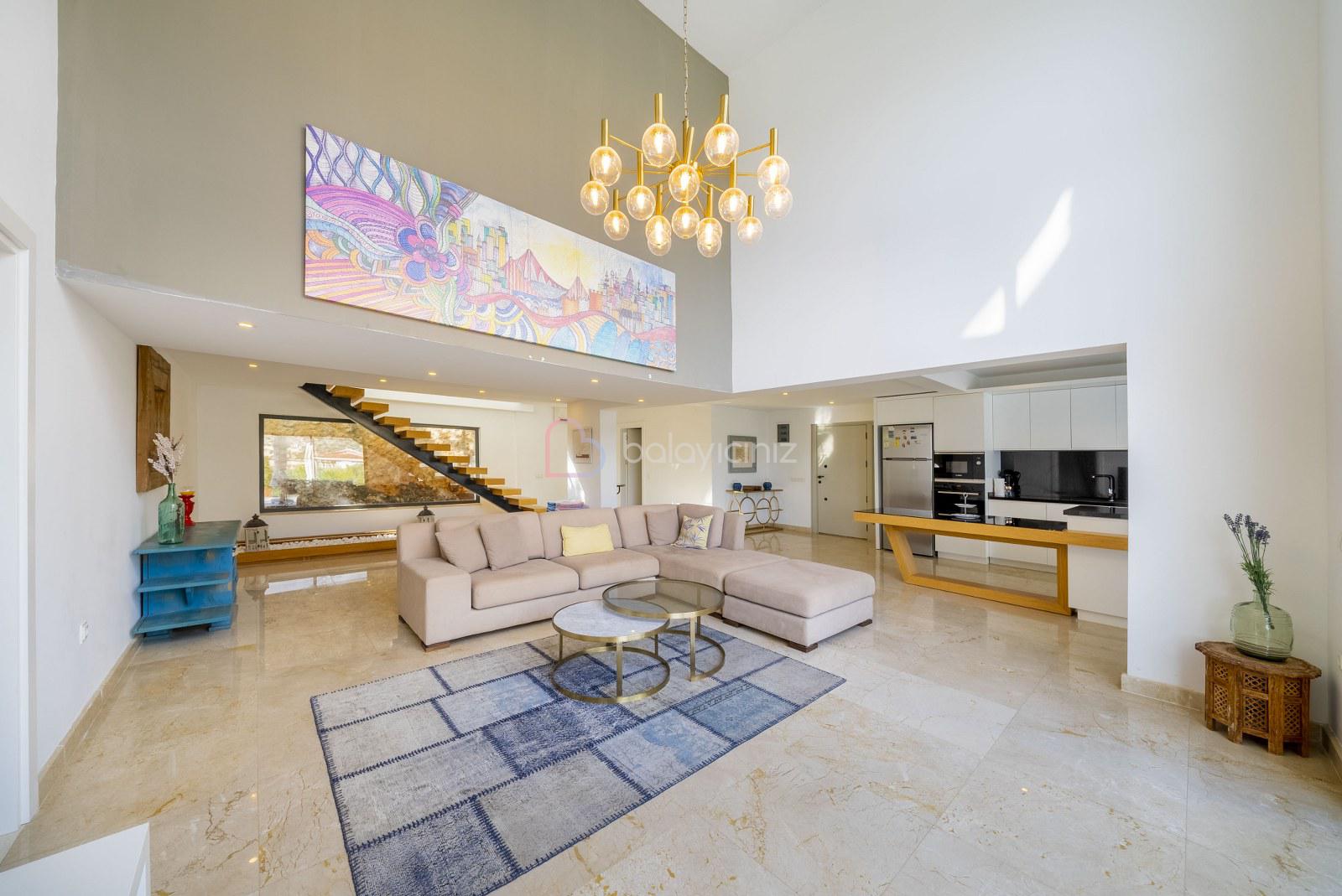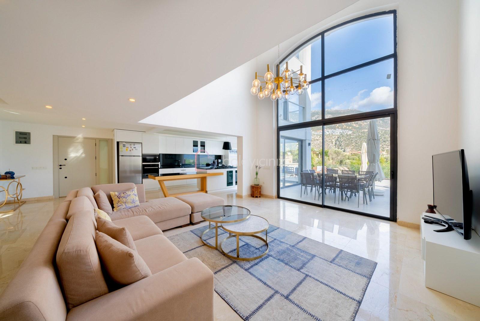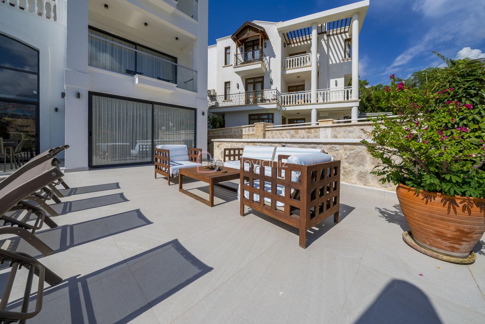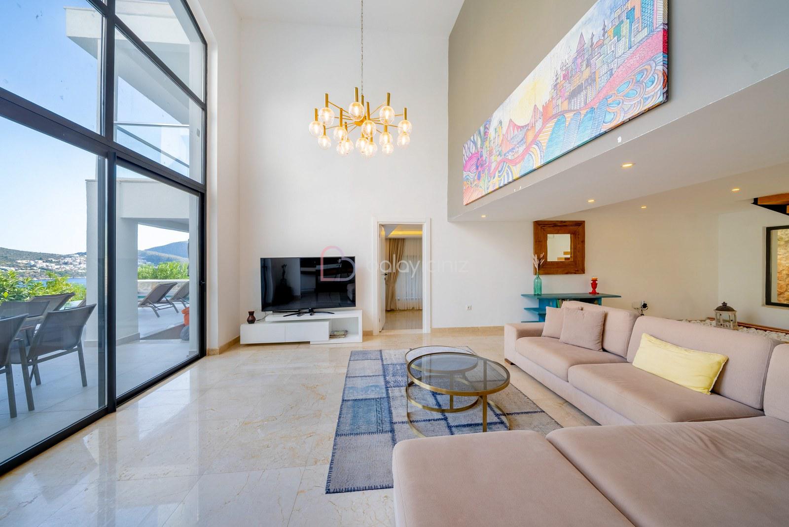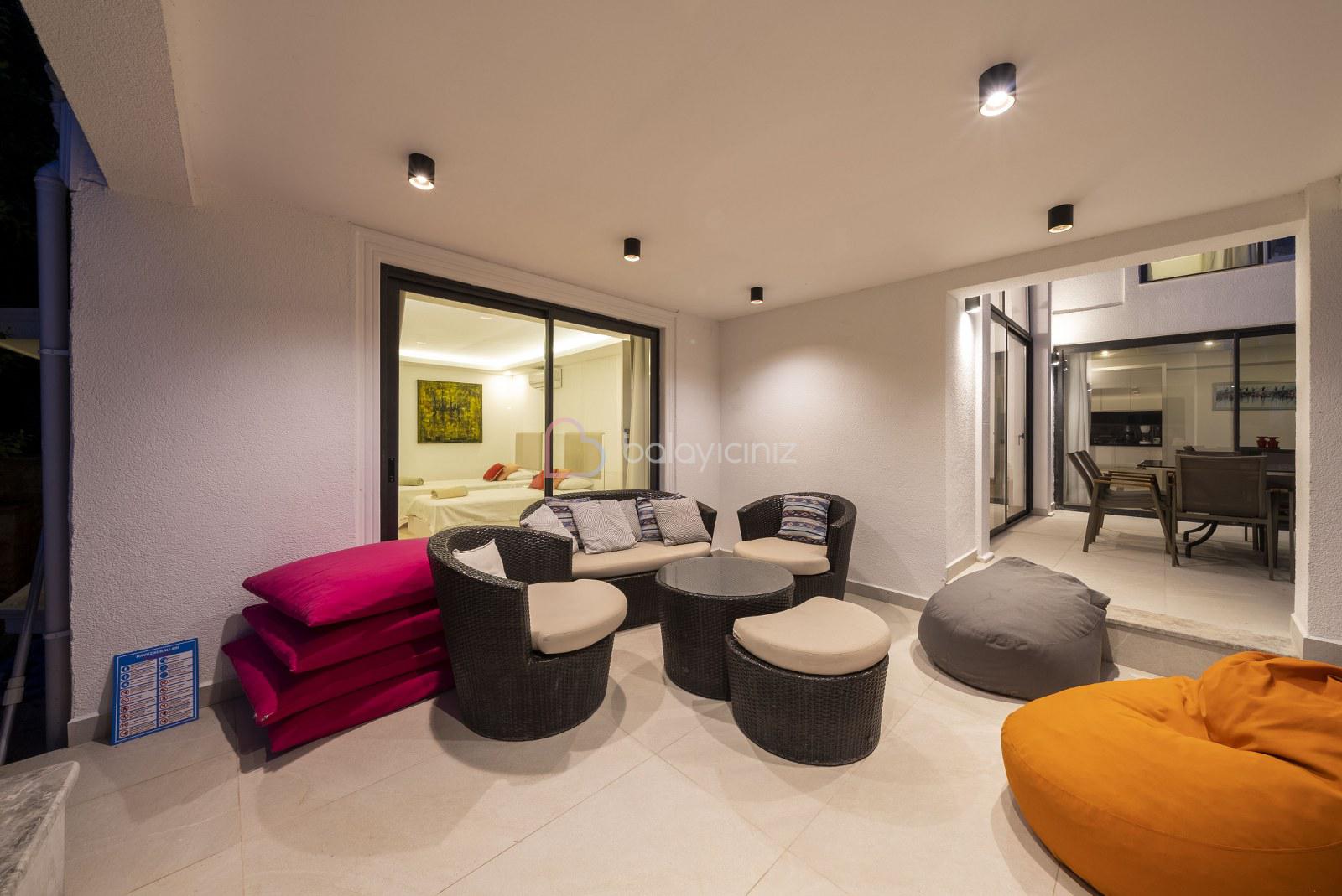 Deniz manzaralı salonunda oturma grubu, televizyon, uydu alıcısı, klima, yemek masası, ütü ve ütü masası, havuz terasına çıkış bulunmaktadır.