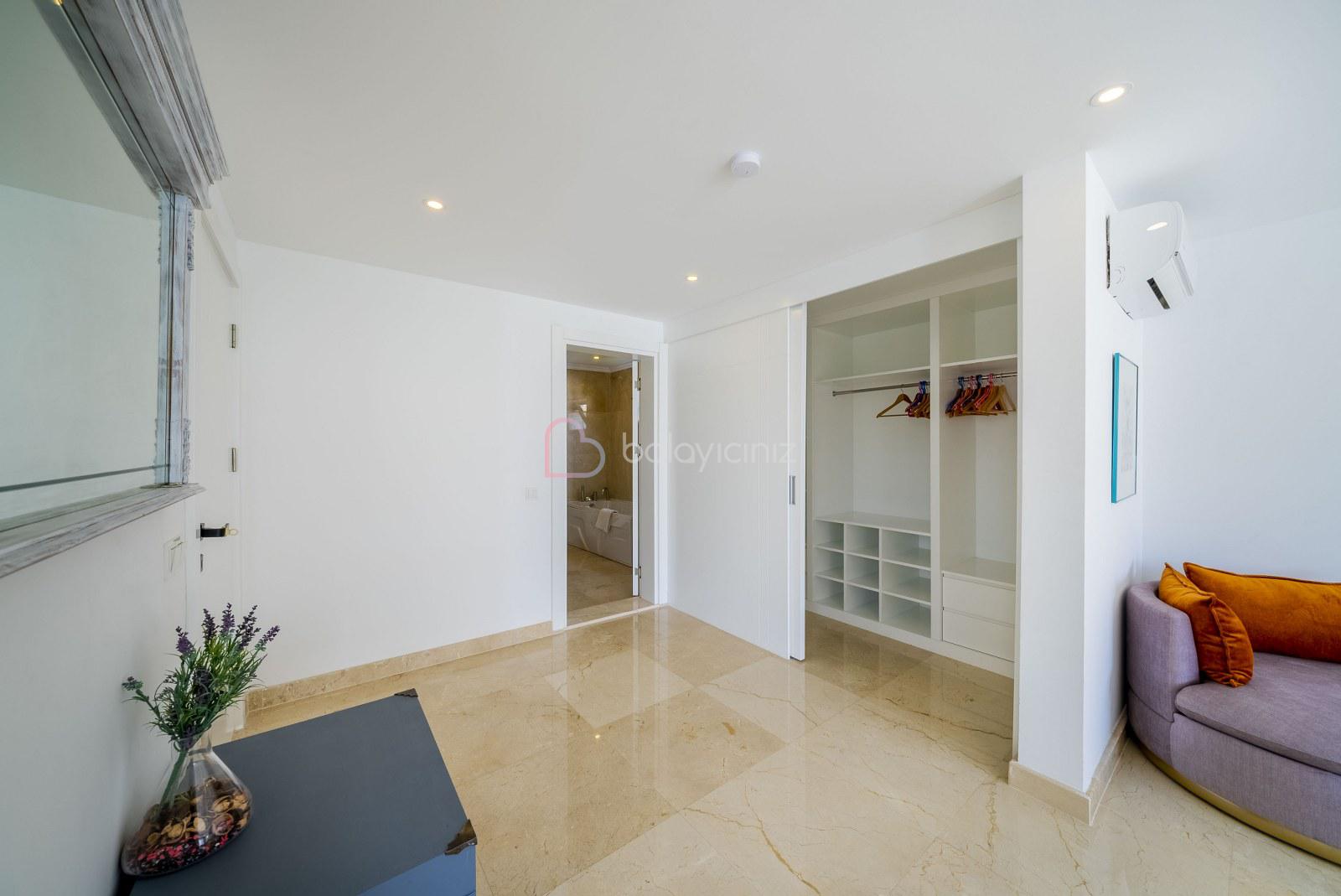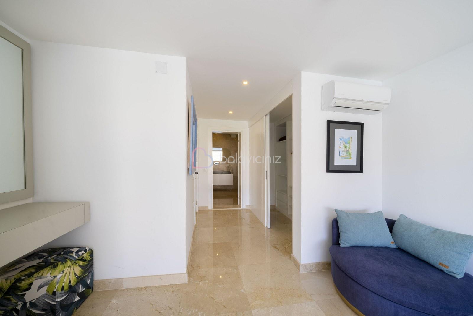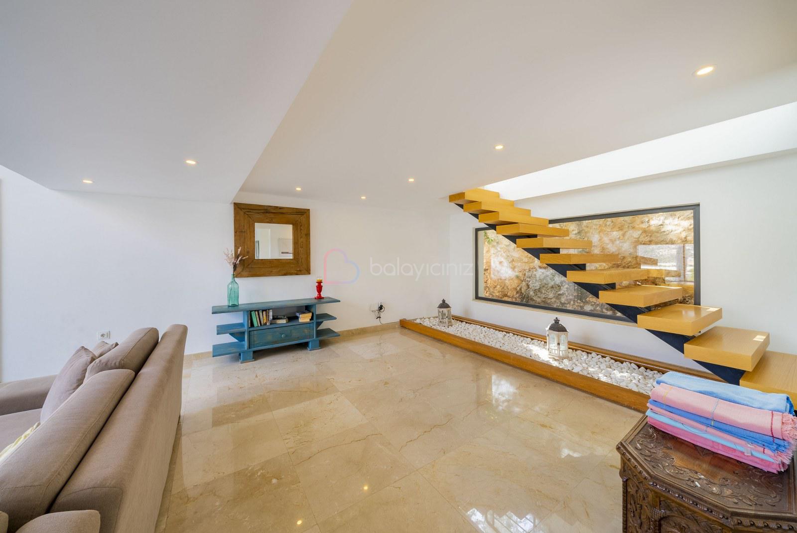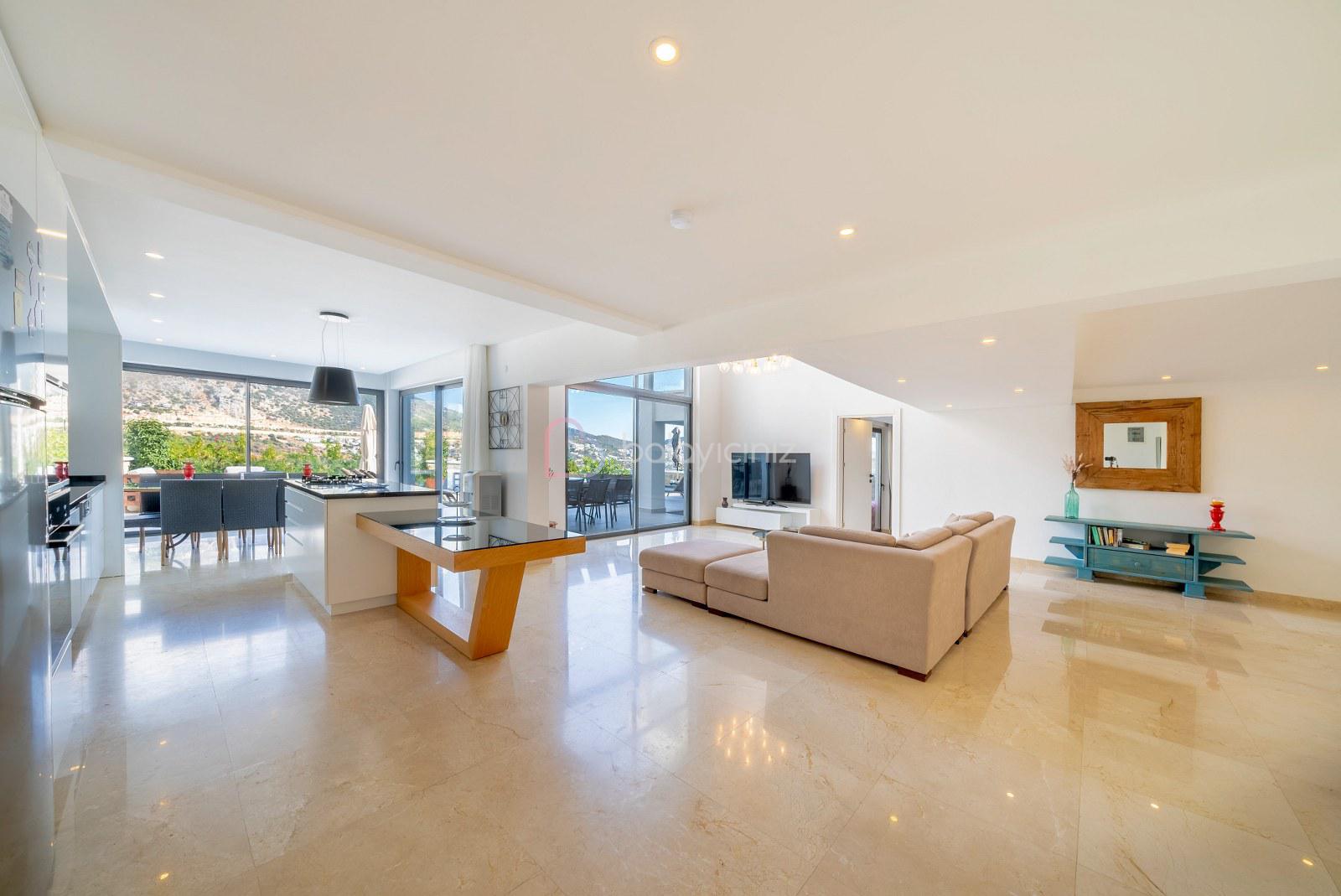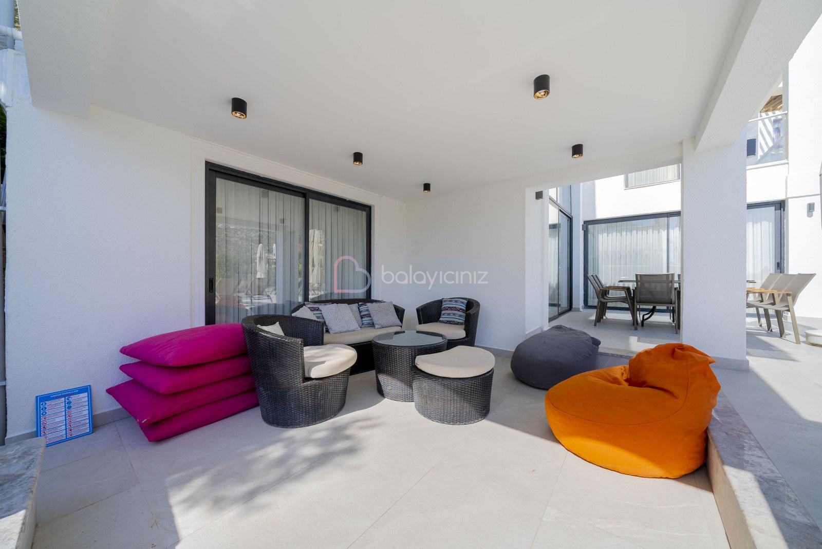 Deniz manzaralı salonunda oturma grubu, televizyon, uydu alıcısı, klima, yemek masası, ütü ve ütü masası, havuz terasına çıkış bulunmaktadır.