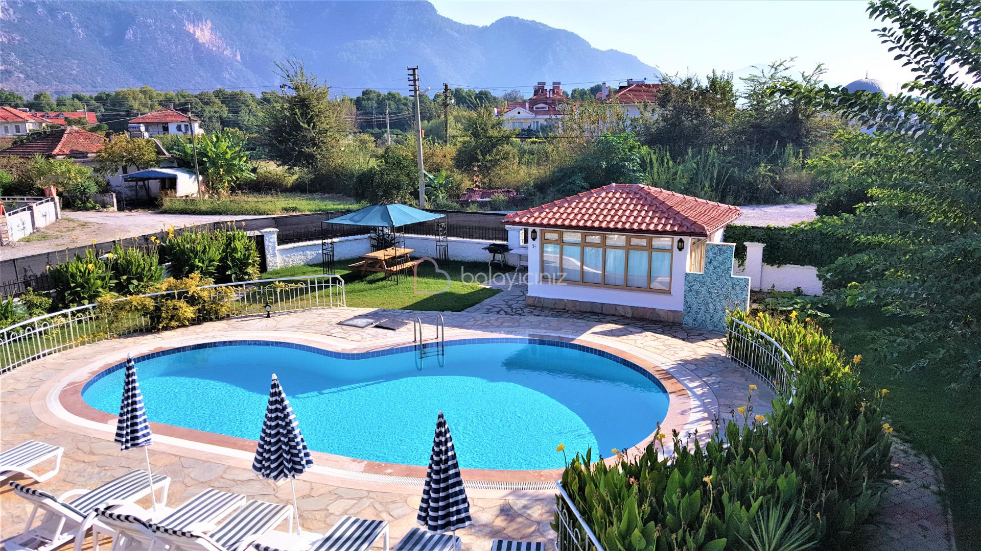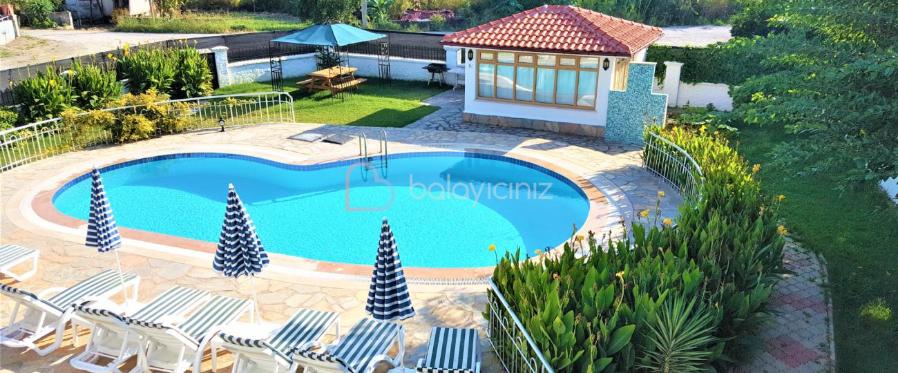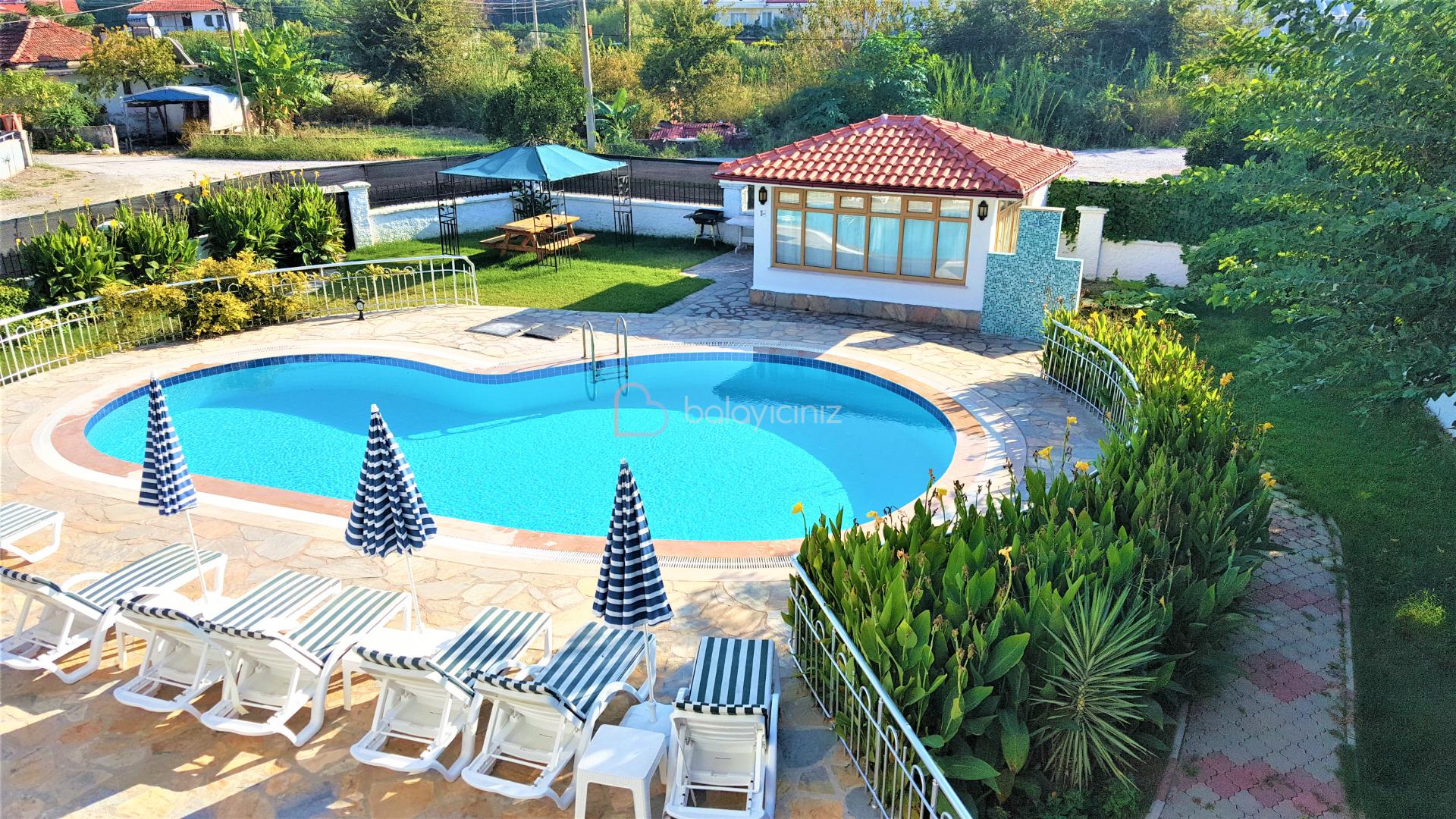 Havuz terasında özel yüzme havuzu, şezlonglar, güneş şemsiyesi, bahçe mobilyaları, mangal bulunmaktadır.