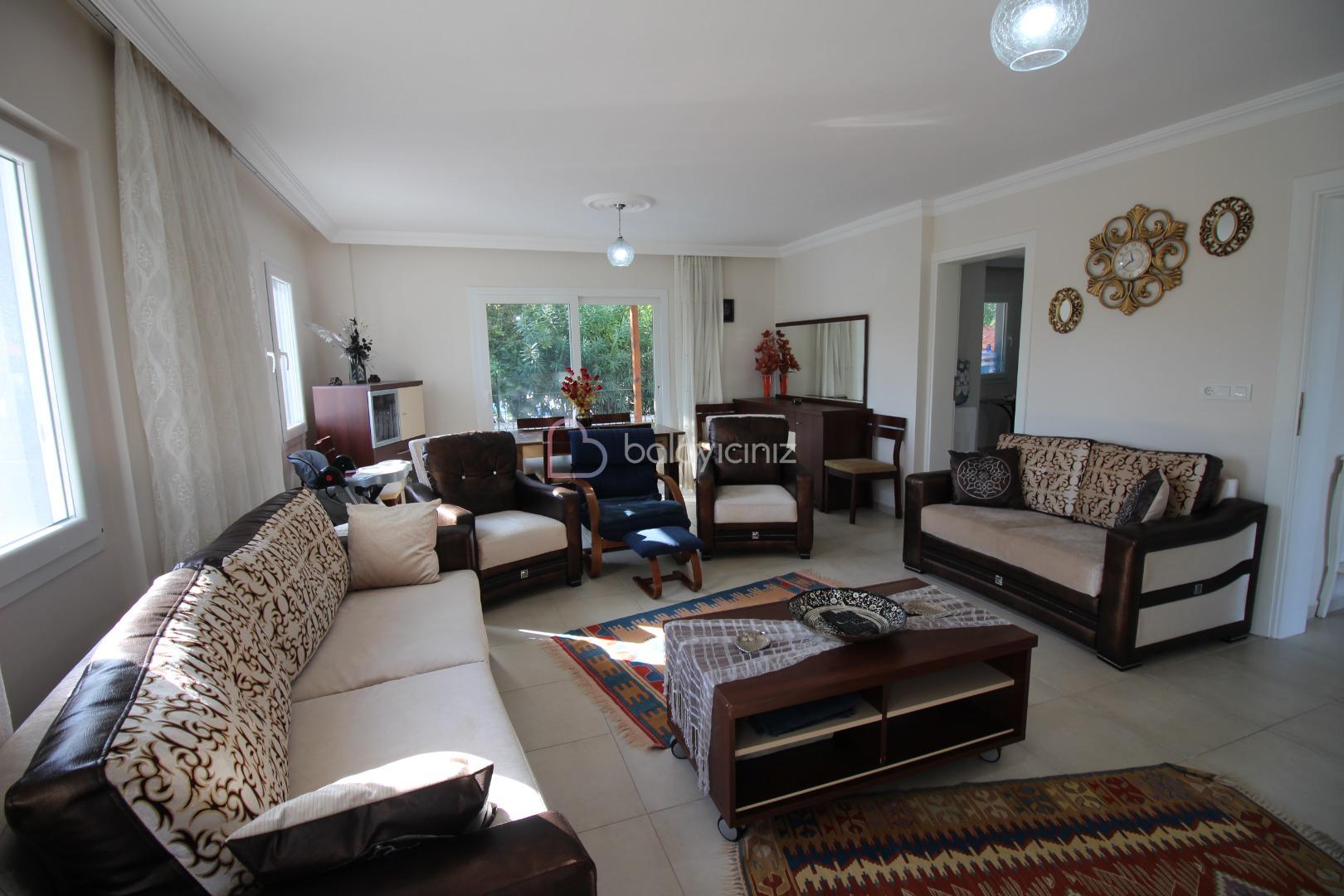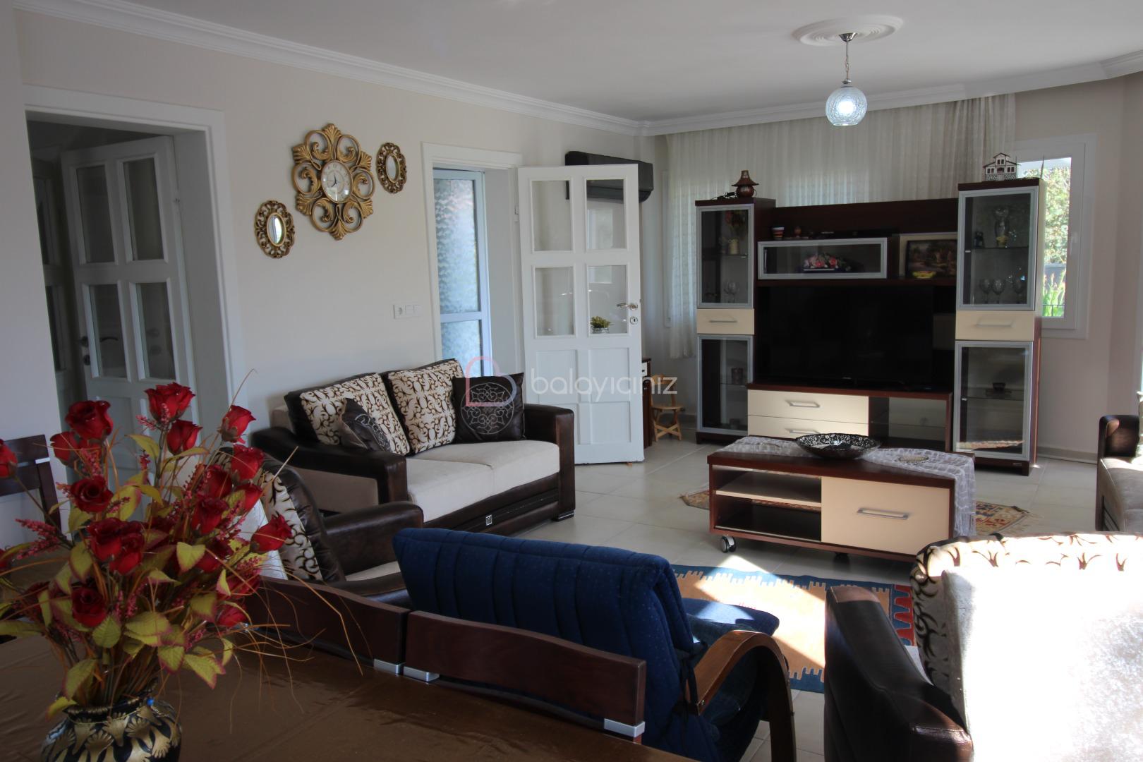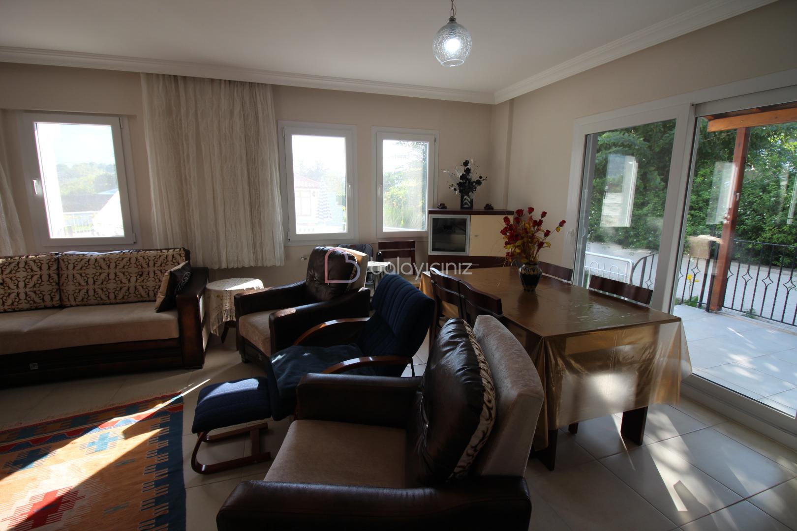 Oturma grubu, televizyon, orta sehpa, klima, yemek masası, internet, Havuz terasına çıkış bulunmaktadır.