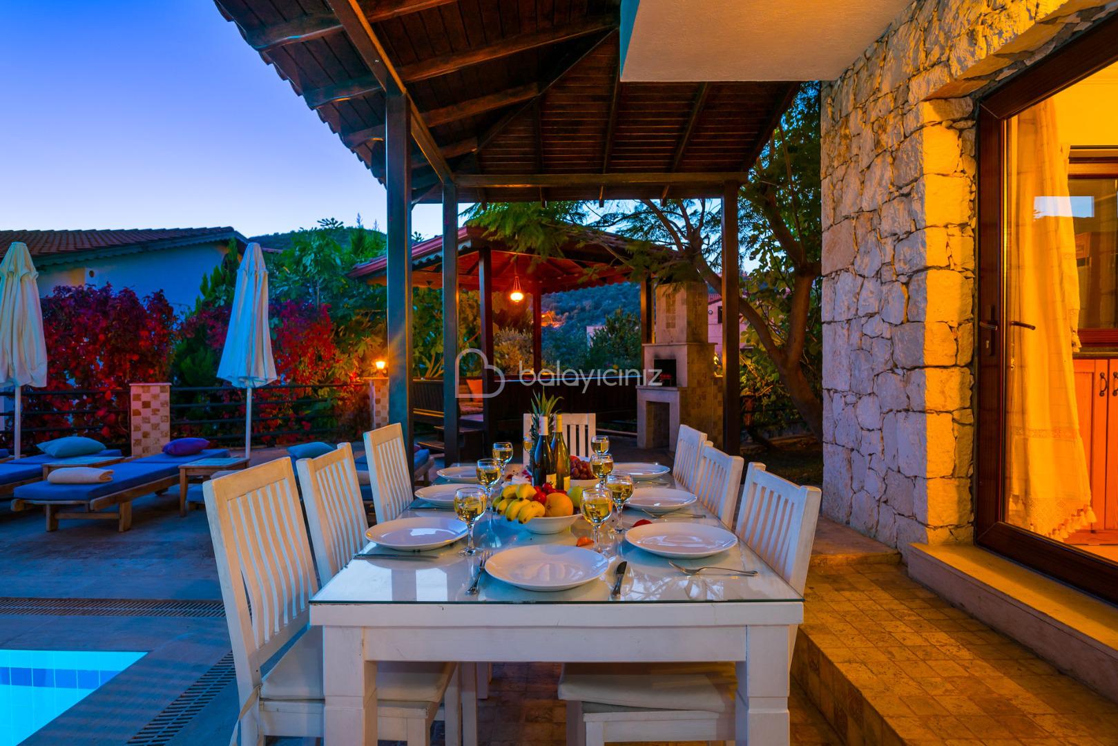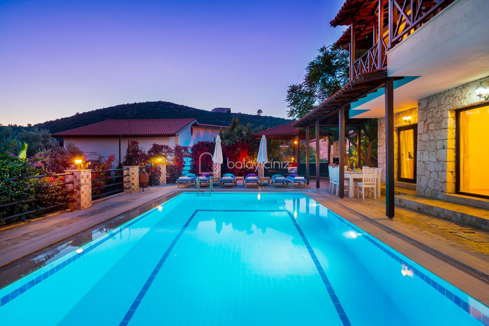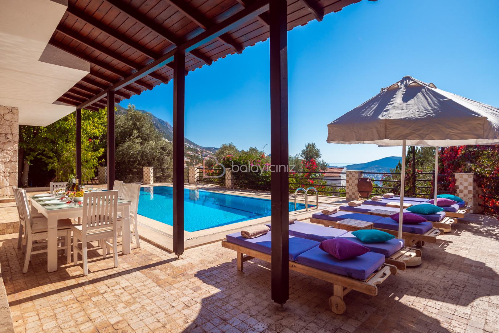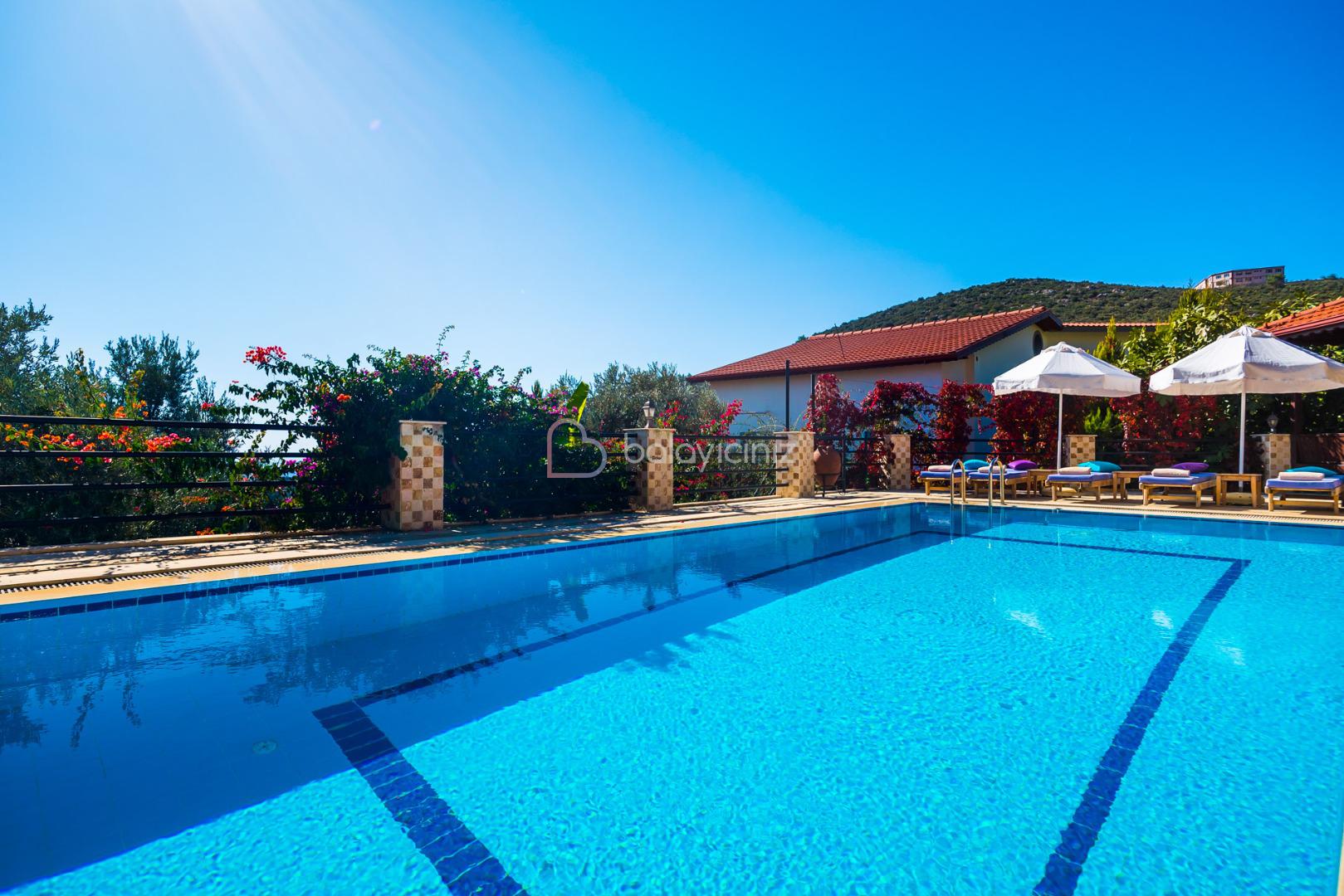 Özel yüzme havuzu, şemsiye, 8 adet şezlong ve keyifli vakit geçirmenize yardımcı olarak köşk ve barbekümüz bulunmaktadır. Bakimle, geniş ve özel bahçede güneşlenme terası bulunmaktadır.