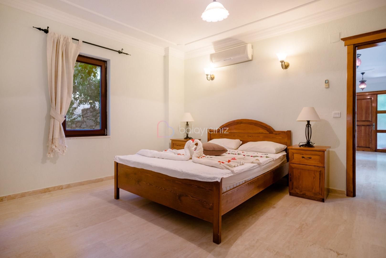 4. Yatak Odası: Süit Klimalı aile yatak odasıdır. Yatak odasında balkon, 1 adet çift kişilik yatak, komodin, banyo ve balkon bulunmaktadır. (1. Kat)