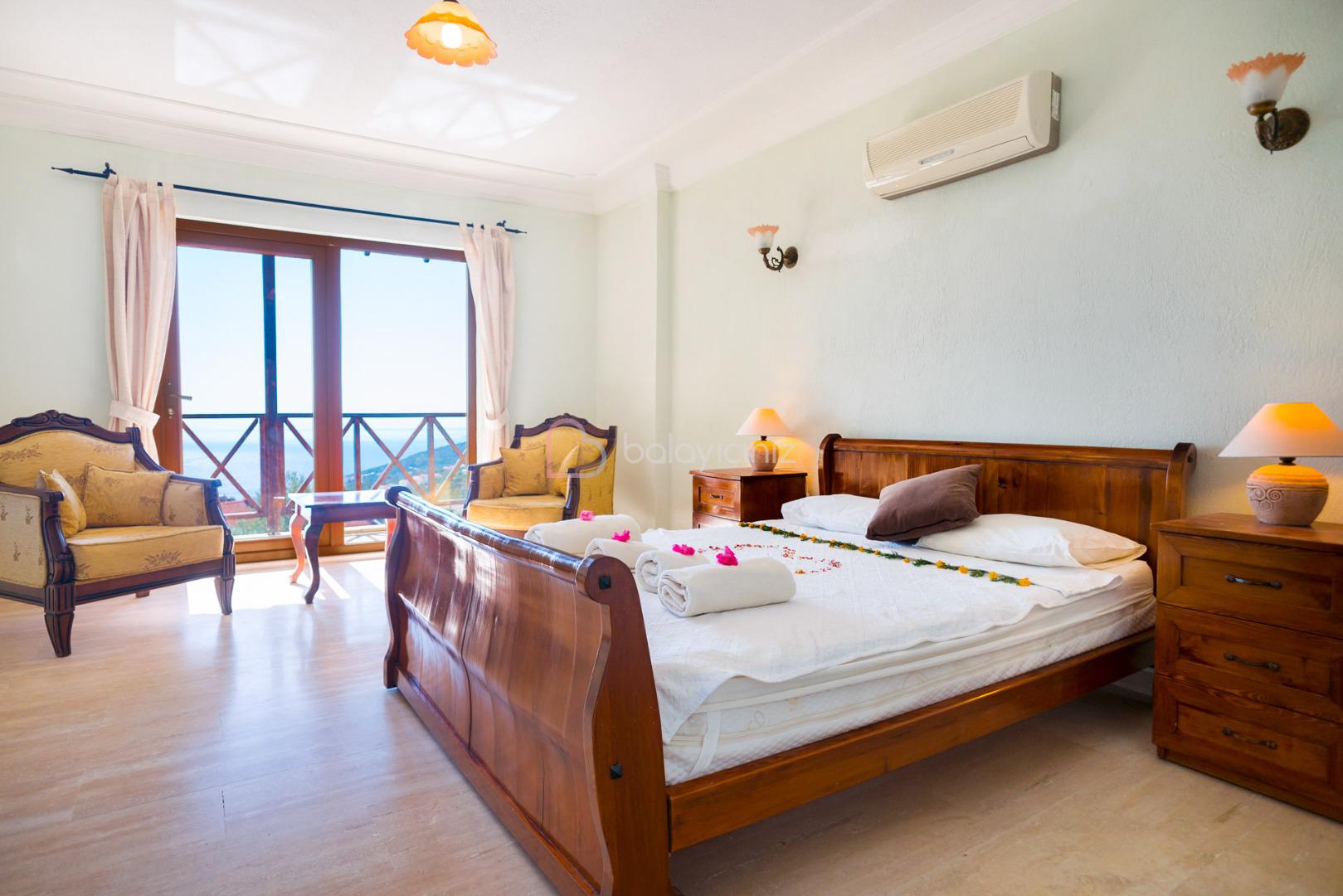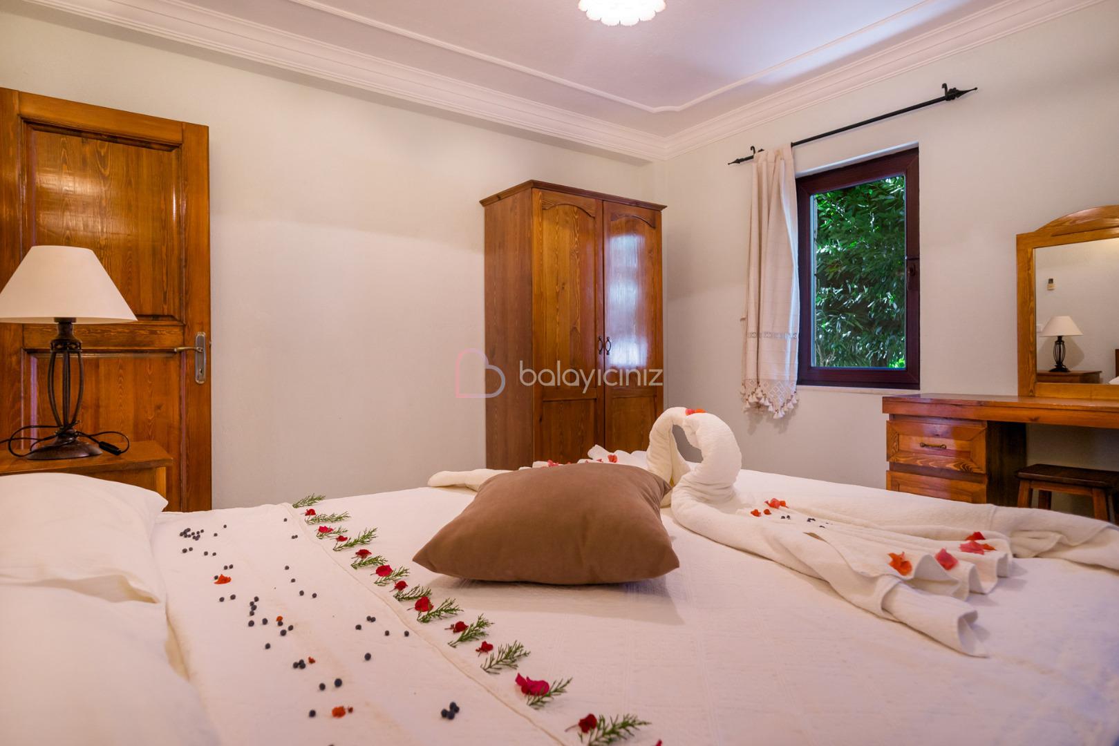 1. Yatak Odası: Klimalı aile yatak odasıdır. Yatak odasında balkon, 1 adet komodin, tuvalet masası, ortak banyo ve oturup kahvenizi yudumlarken manzaranın büyüsüne kapılmanıza yardımcı olacak 2 adet berjer bulunmaktadır. (Zemin Kat)