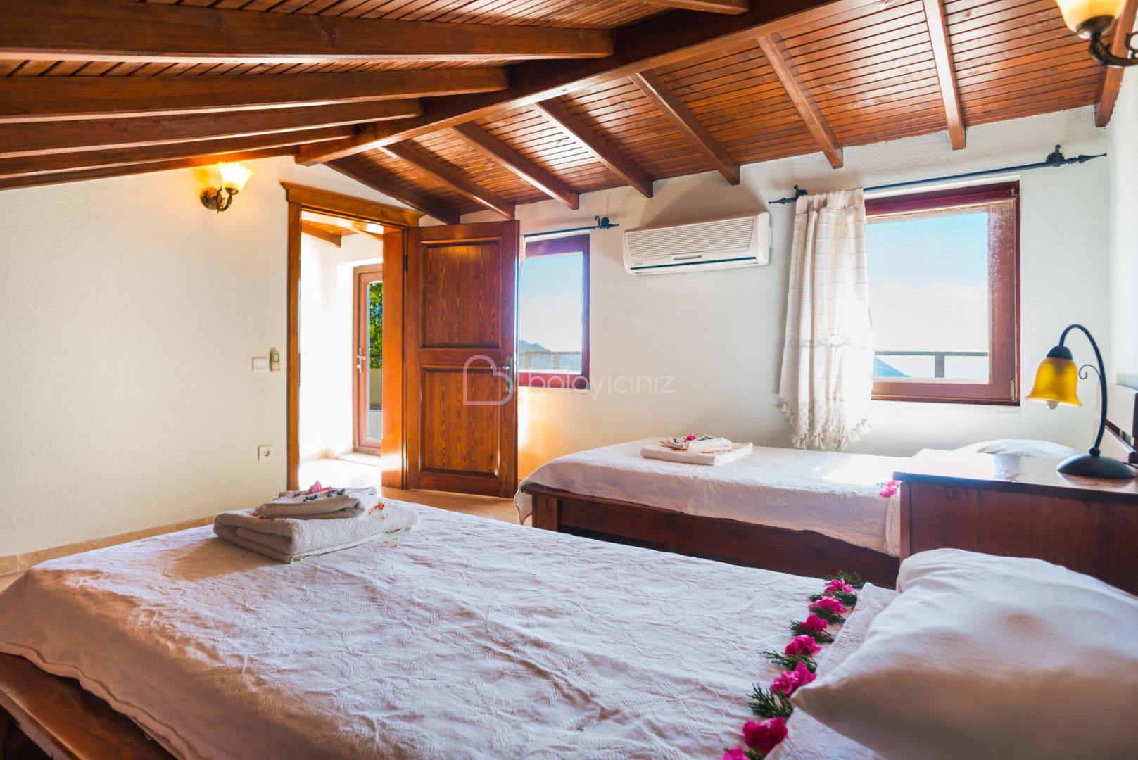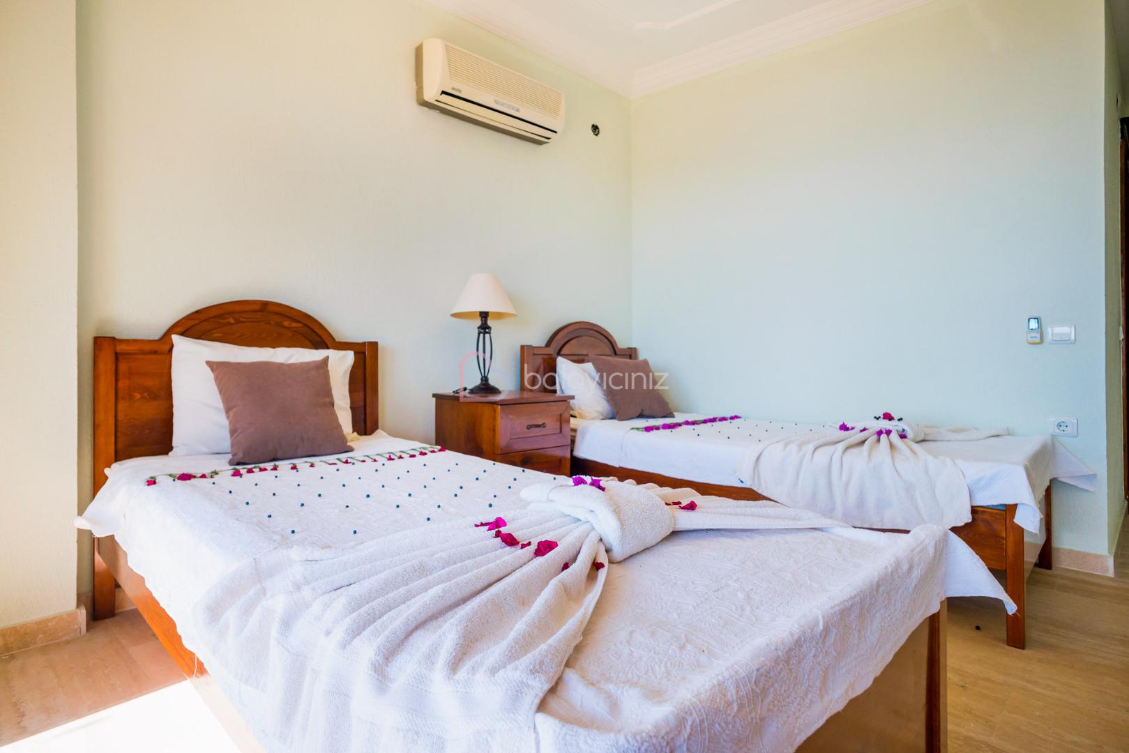 2. Yatak Odası: Süit Klimalı yatak odasıdır. Yatak odasında elbise dolabı, 2 adet tek kişilik yatak, komodin, banyo ve balkon bulunmaktadır. (1. Kat)