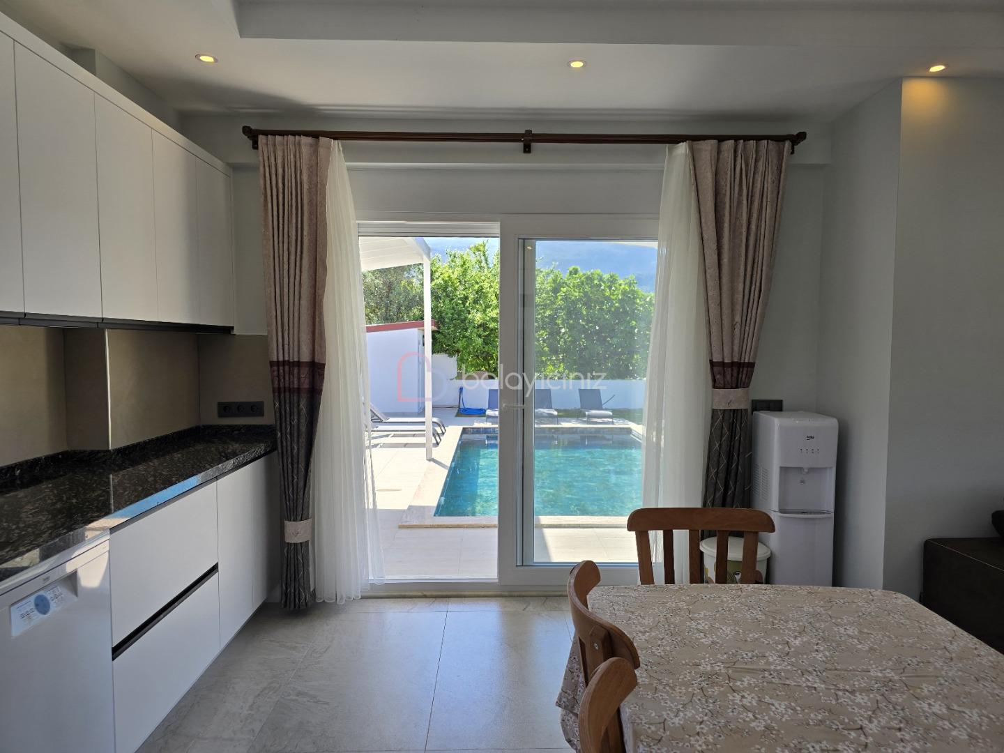 Oturma grubu, televizyon, orta sehpa, yemek masası, internet, Havuz terasına çıkış bulunmaktadır.