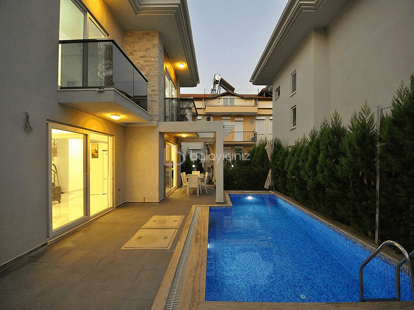 Özel yüzme havuzu , sezlong, semsiye , salincak , yemek masasi ve barbekü bulunmaktadir
