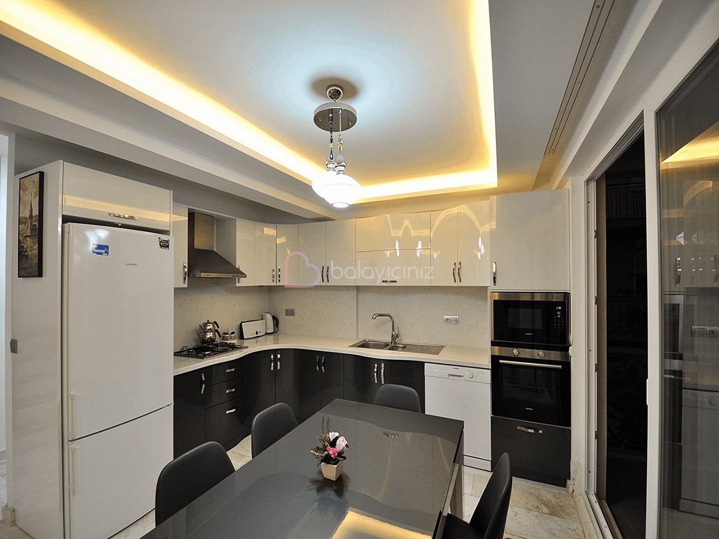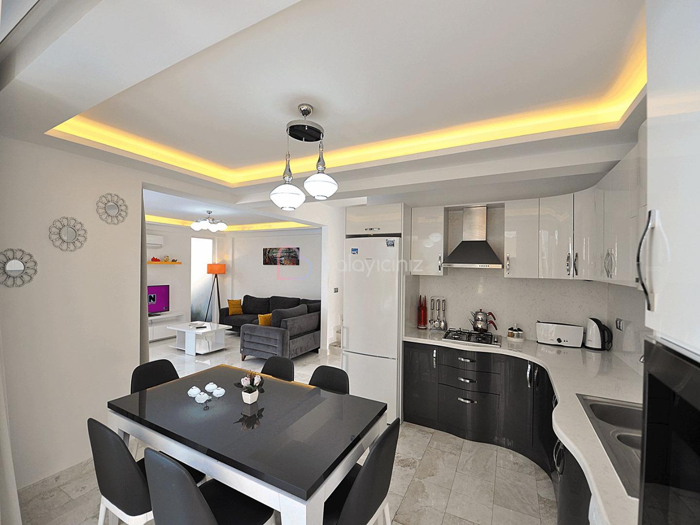 Modern dizaynli, tam donanimli Amerikan mutfak içerisinde buzdolabi, çamasir ve bulasik makinesi, 4lü ocak, mikrodalga firin, kettle, tost makinesi, yemek masasi, yemek takimi, çatal biçak takimi, tava ve tencereler bulunmaktadir.