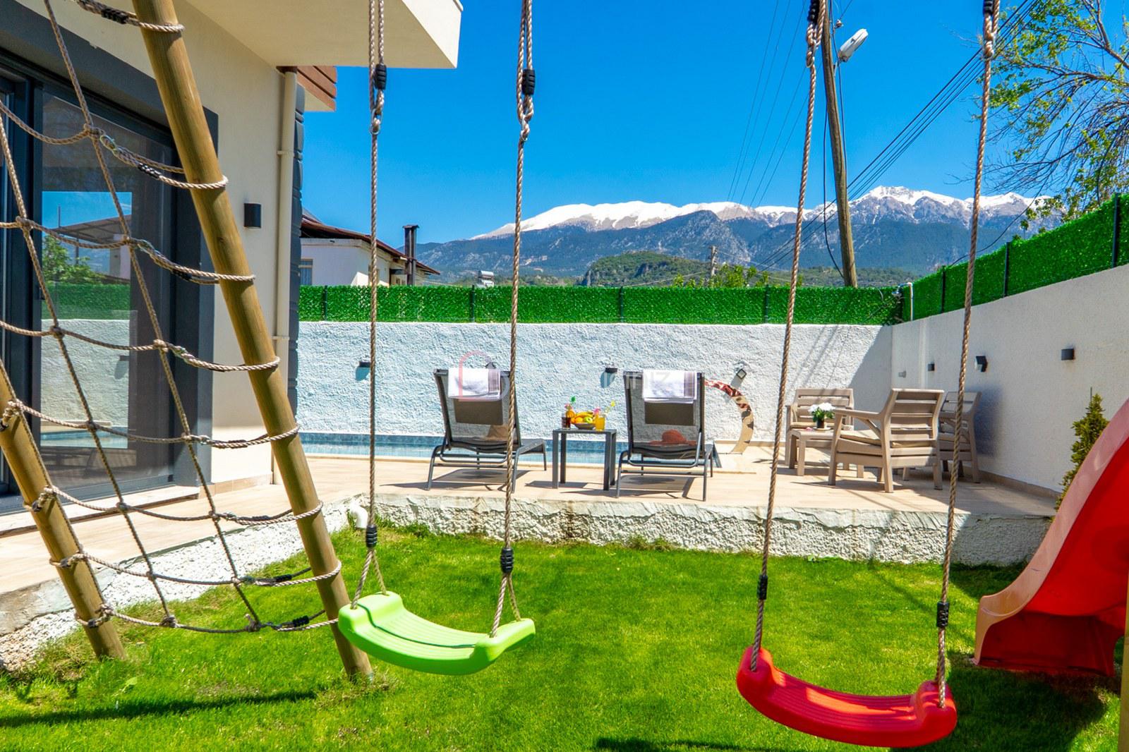 Şezlonglar, güneş şemsiyesi, salıncak, barbekü, langırt, çocuk oyun alanı, yemek masası ve sandalyeler bulunmaktadir.