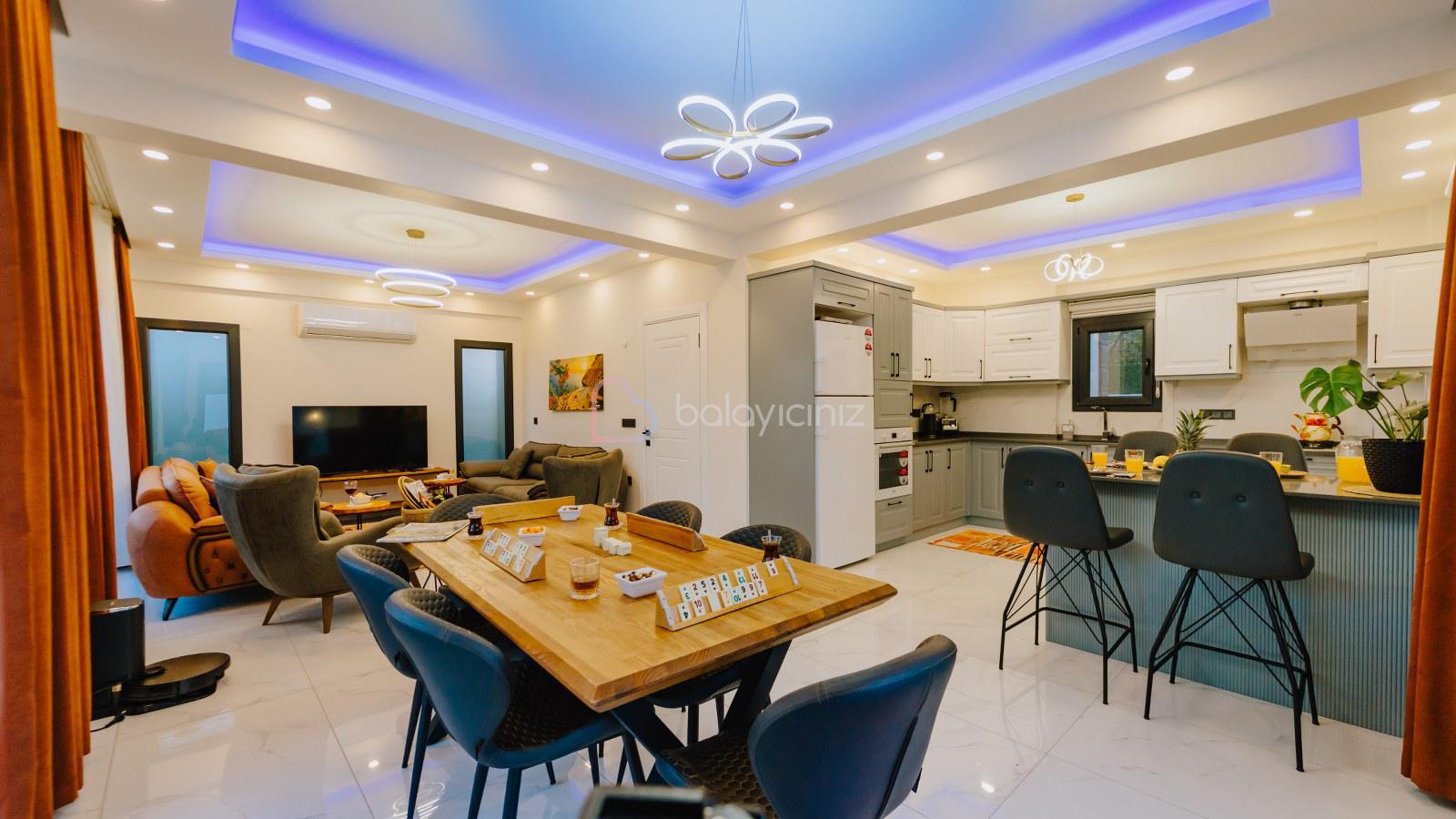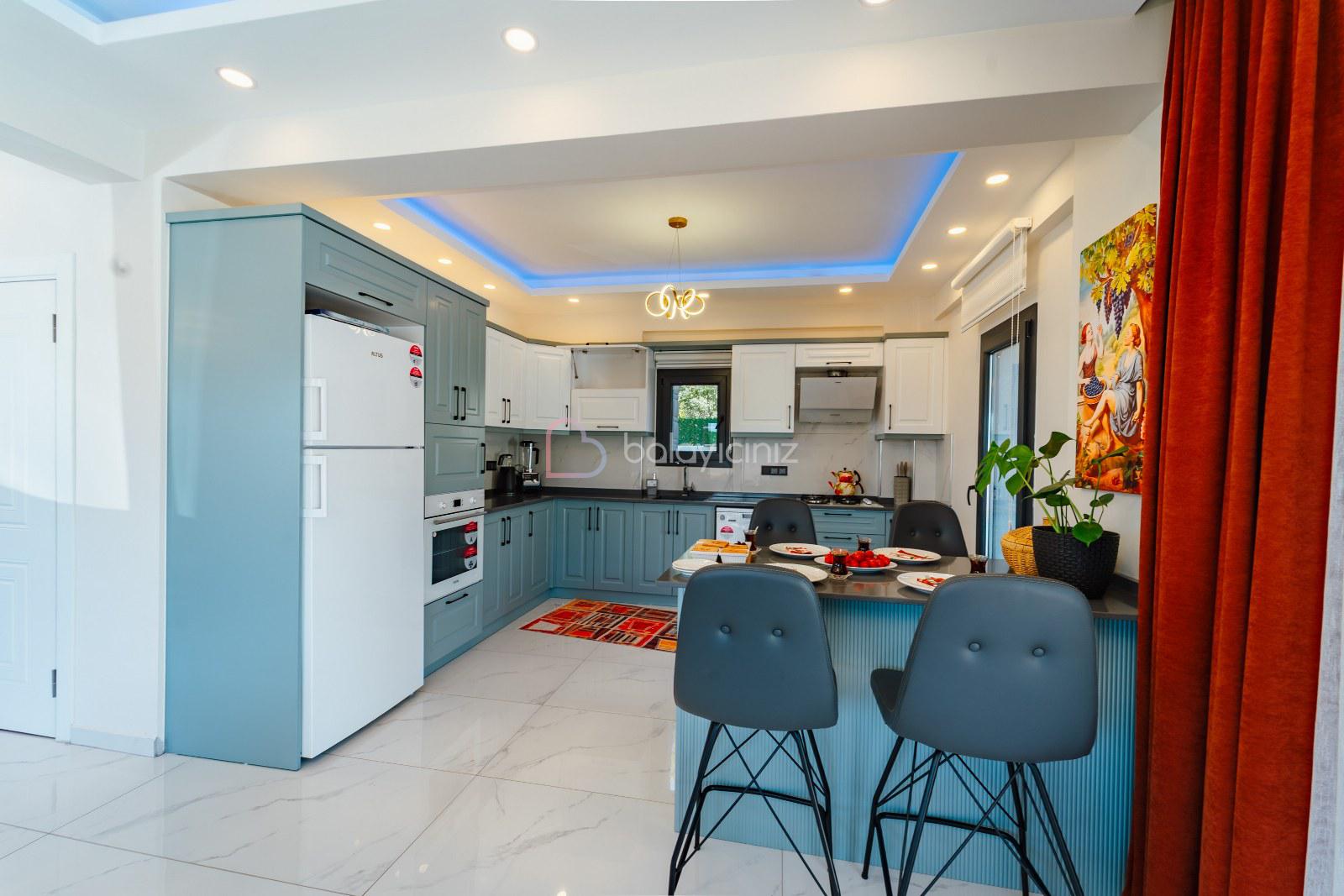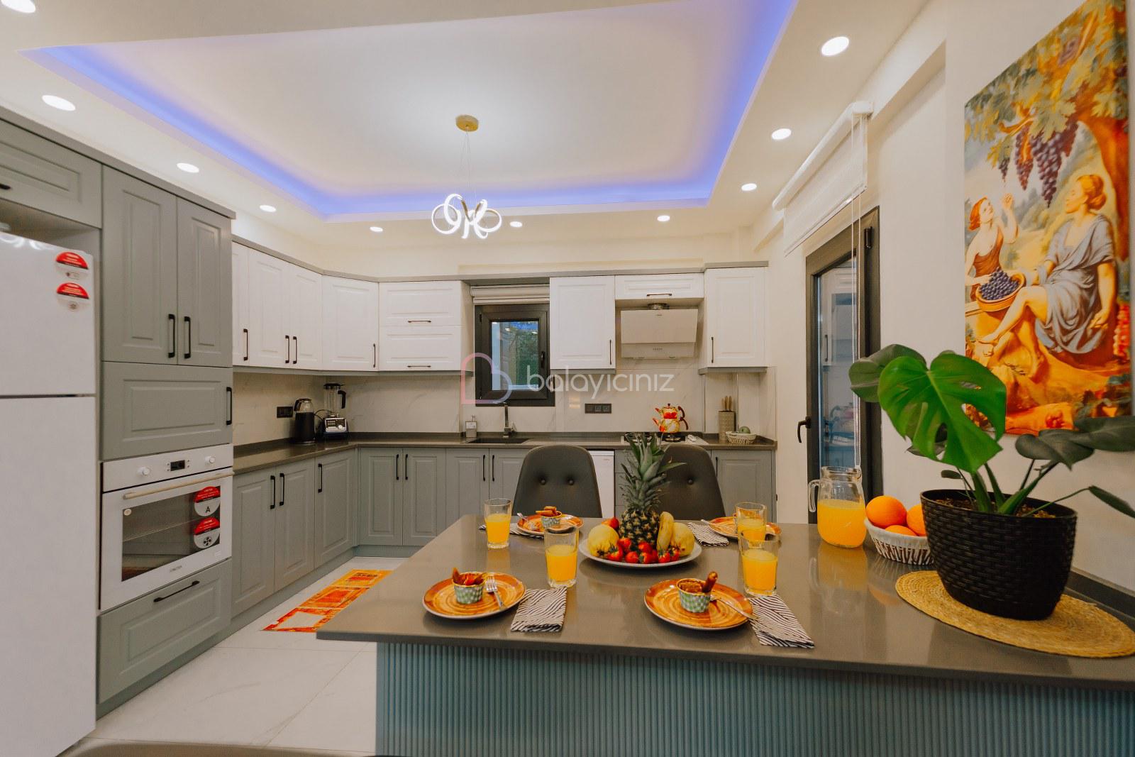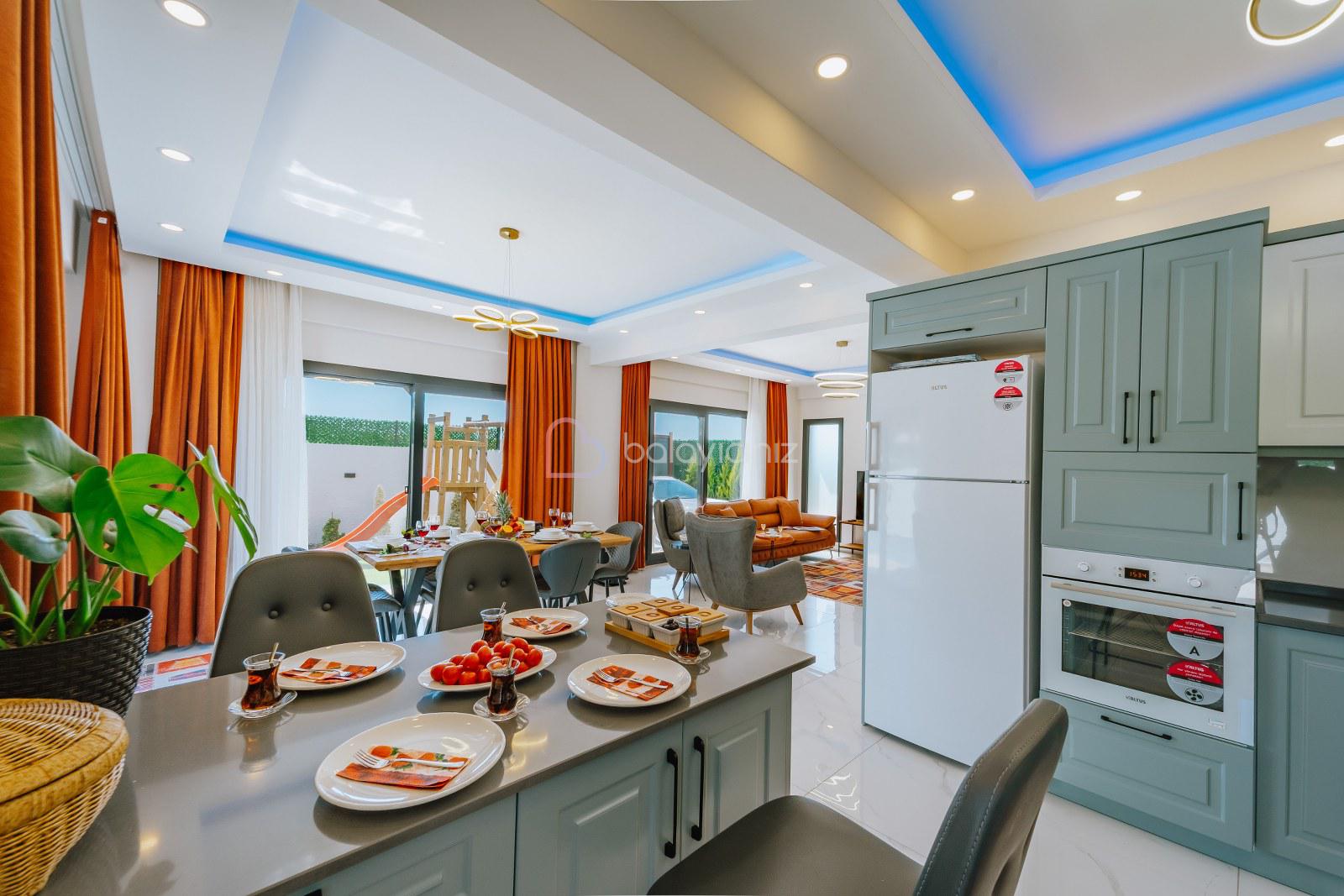 Buzdolabı, fırın, mikrodalga, çamaşır makinesi, bulaşık makinesi, 4’lü ocak, elektrikli su ısıtıcısı (kettle), elektrikli süpürge, ekmek kızartma makinesi, 8 kişilik yemek takımı, tava, tencereler, çatal ve bıçak takımı ve diğer mutfak malzemesi mevcuttur. Havuz terasına çıkış bulunmaktadir.