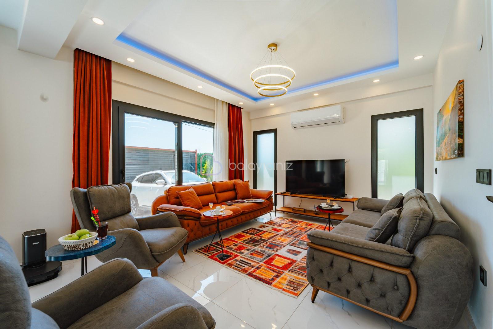 Salon içerisinde konforlu oturma grubu, sehpa, televizyon, uydu alıcı, klima. Salondan havuz terasına çıkış bulunmaktadir.