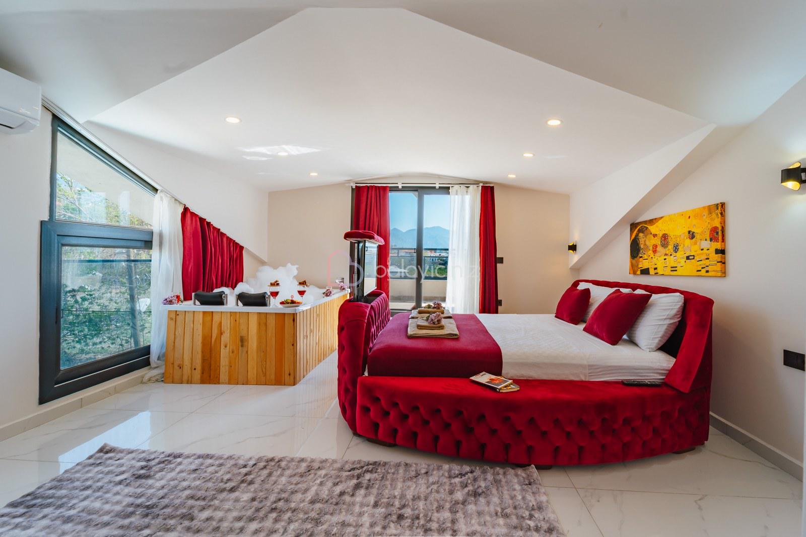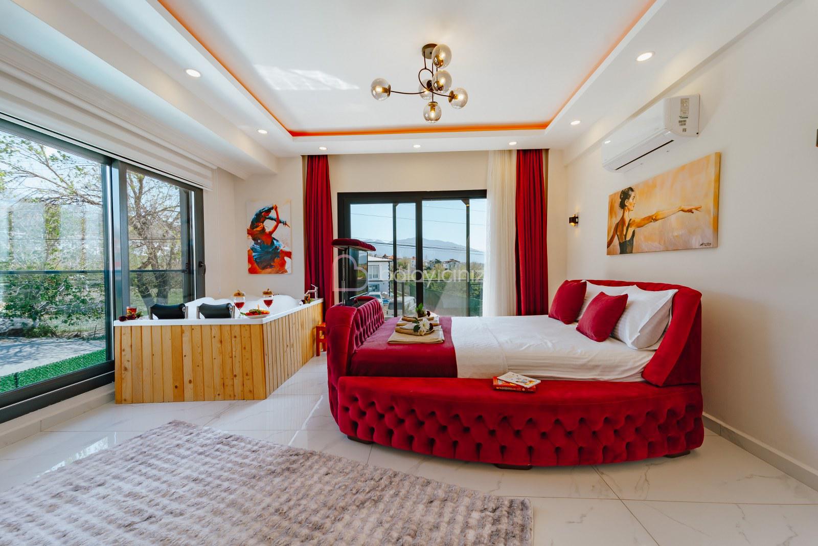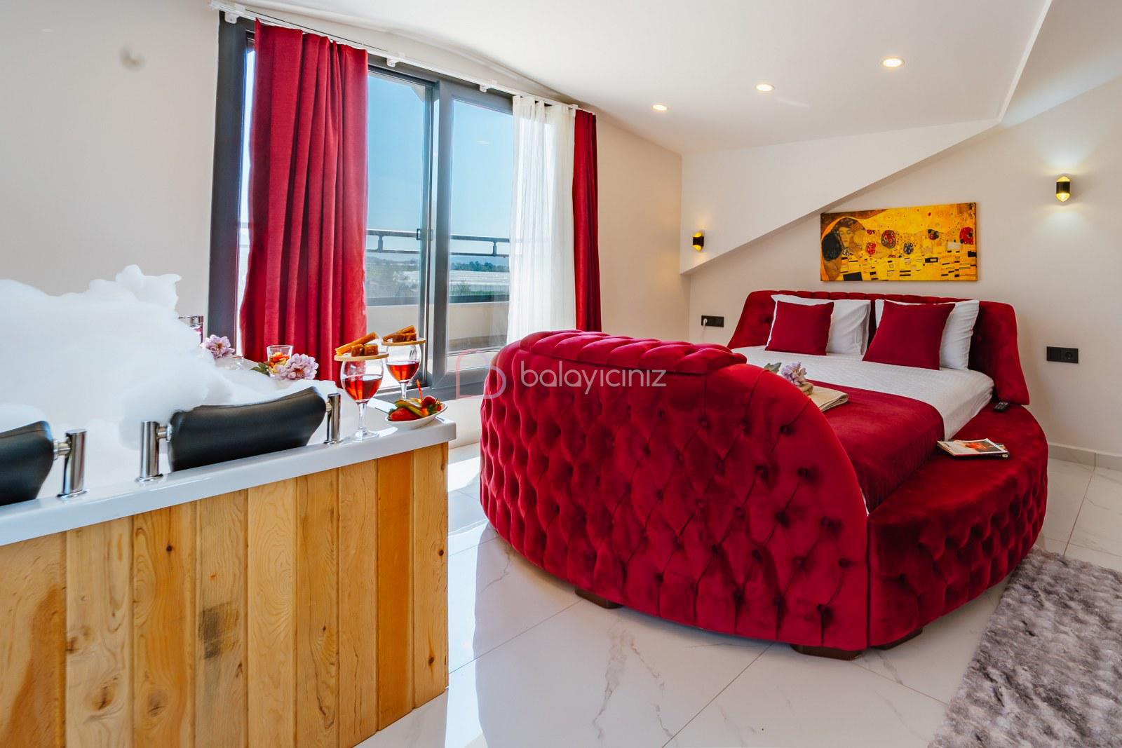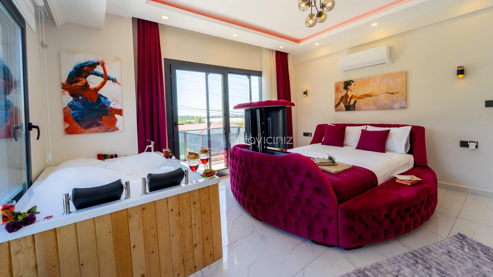 1.Yatak odası: 1 adet çift kişilik akıllı yatak, elbise dolabı, komodin, televizyon, klima, jakuzi, banyo ve tuvalet bulunmaktadir.