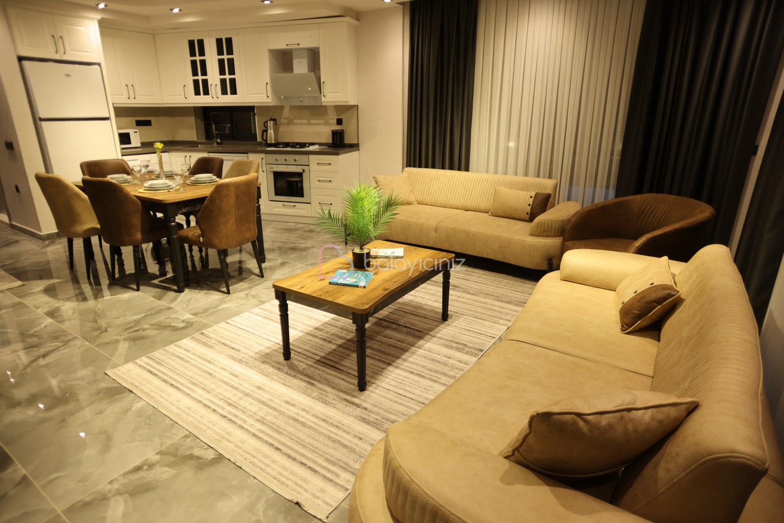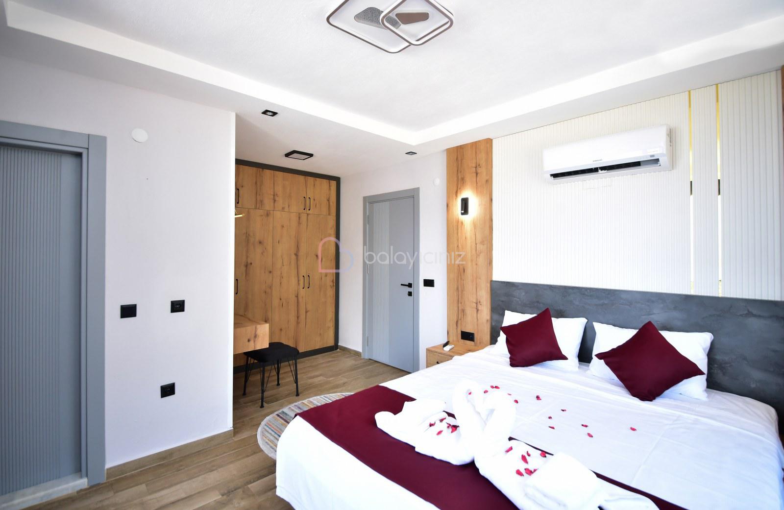 1. Yatak Odası: 1 adet çift kişilik yatak, komodin, klima, makyaj masası, tuvalet ve banyo bulunmaktadır.