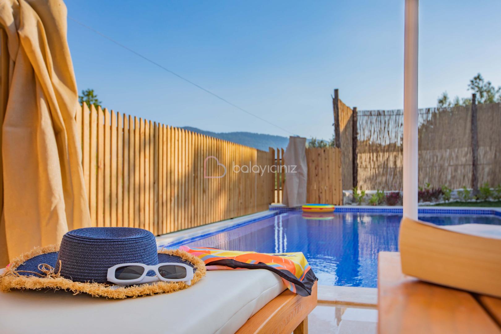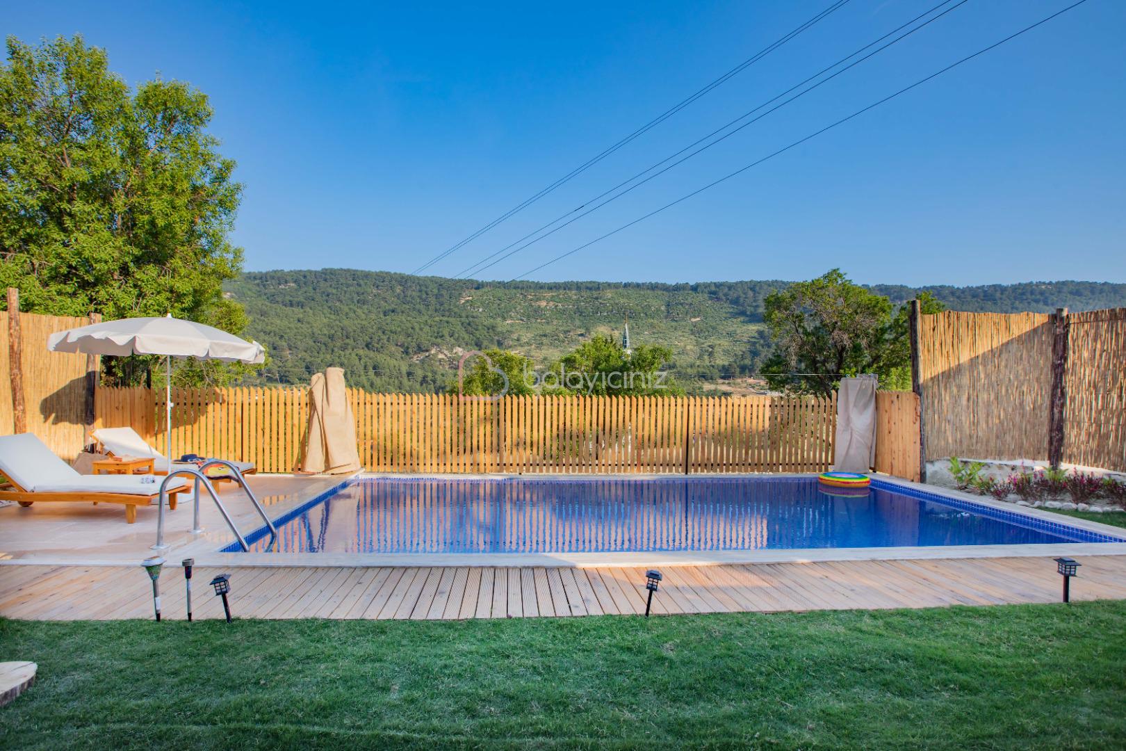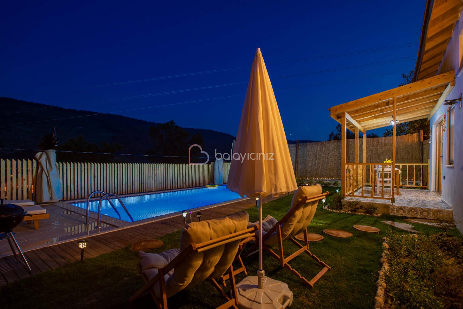 Terasında özel yüzme havuzu, şezlonglar, güneş şemsiyeleri, masa ve sandalyeler, mangal bulunmaktadır.