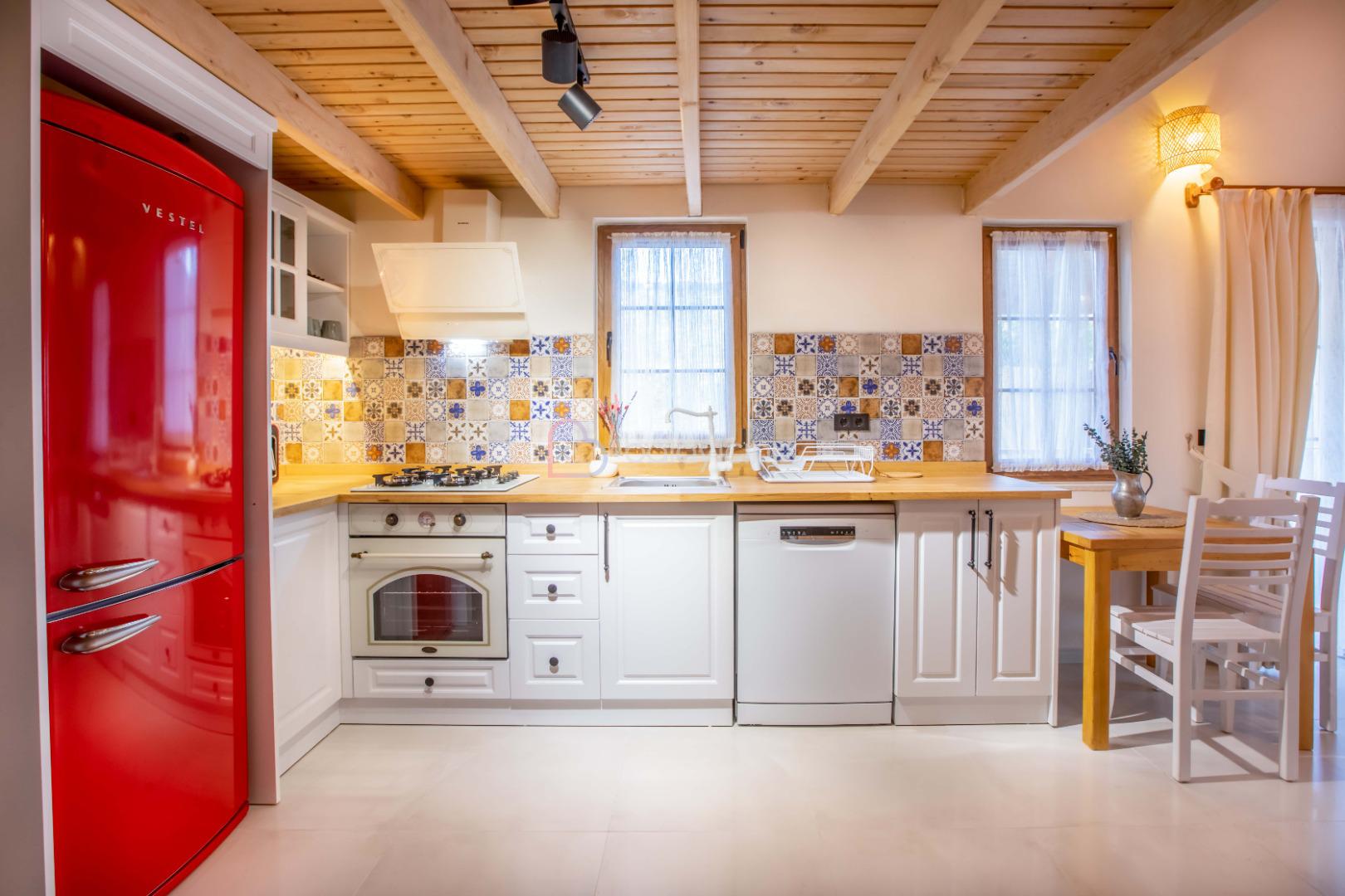 Amerikan mutfakta buzdolabı, bulaşık makinesi, fırın, 4'lü ocak, mikrodalga fırın, elektrikli su ısıtıcısı (kettle) tost makinesi, yemek masası, yemek takımları, çatal ve bıçak takımları, tencere ve tava takımları, bardaklar bulunmaktadır.