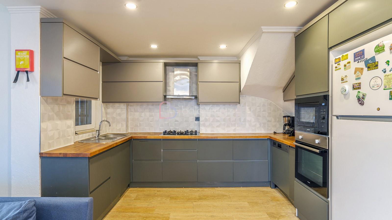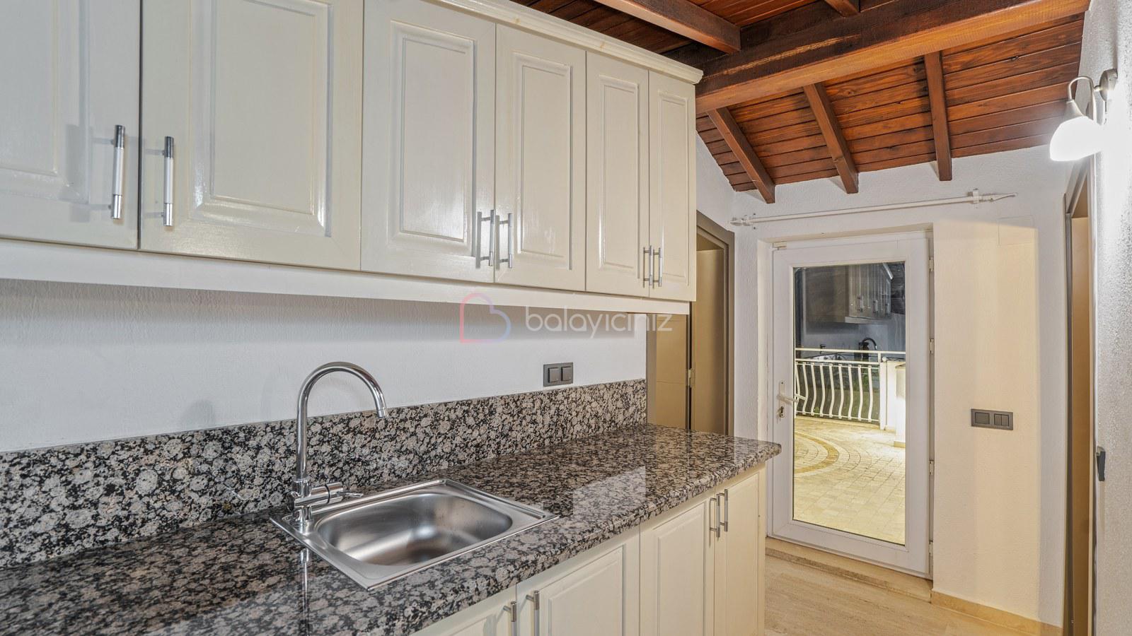 Deniz manzaralı Amerikan mutfaktır. İçerisinde bulaşık makinesi, çatal kaşık takımı, buzdolabı, tost makinesi, mikrodalga fırın, çamaşır makinesi, ankastre fırın, elektrikli su ısıtıcı, ekmek kızartma makinesi, tava ve tencere takımı, 10 kişilik yemek takımı ve yemek masası bulunmaktadır. Mutfak havuz katında yer almaktadır.