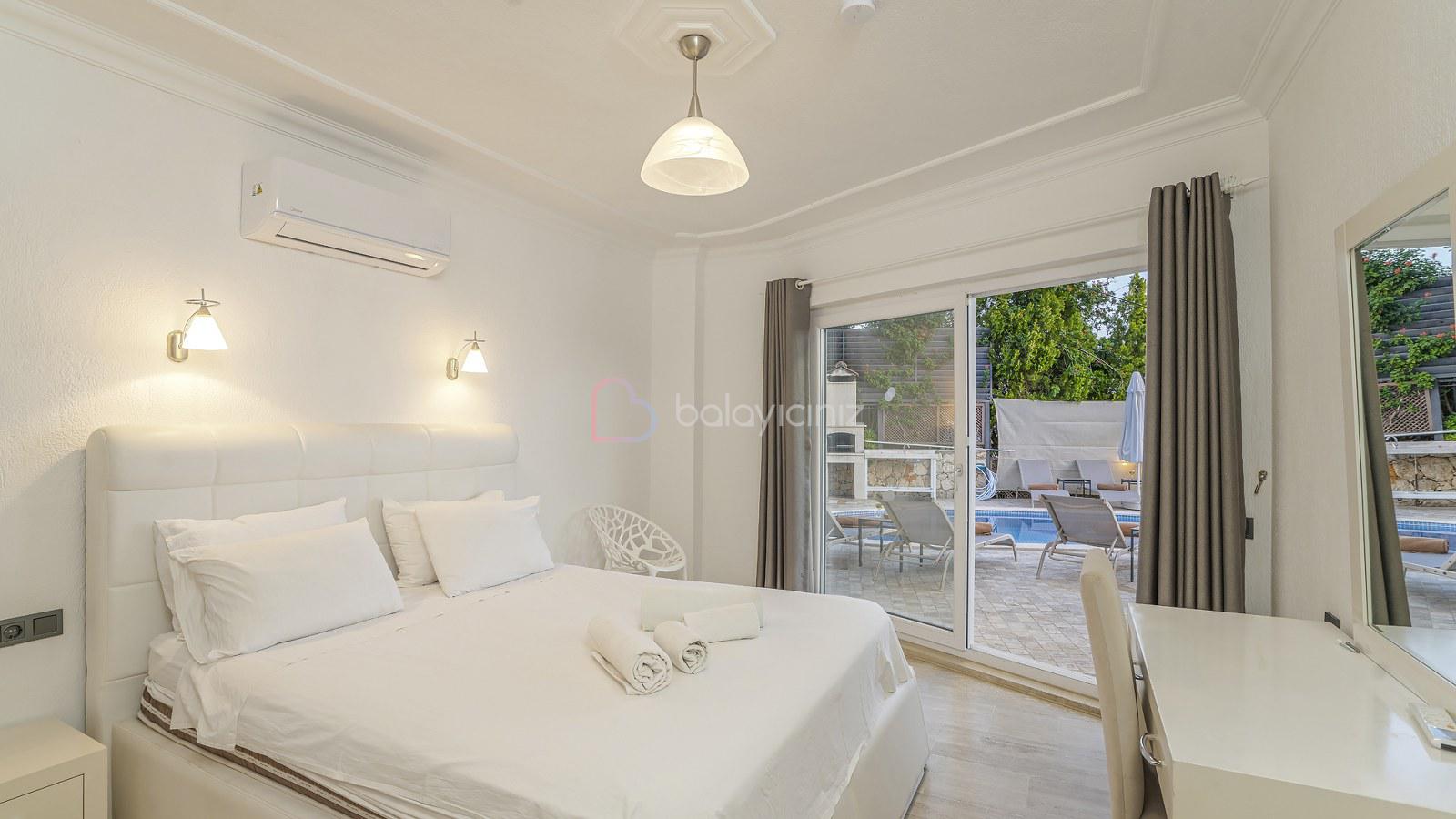 1. Yatak Odası (Zemin Kat) : Süit oda, 1 adet çift kişilik yatak, elbise dolabı, komodin, makyaj masası, klima, saç kurutma makinesi, banyo ve havuz başına çıkış bulunmaktadır.